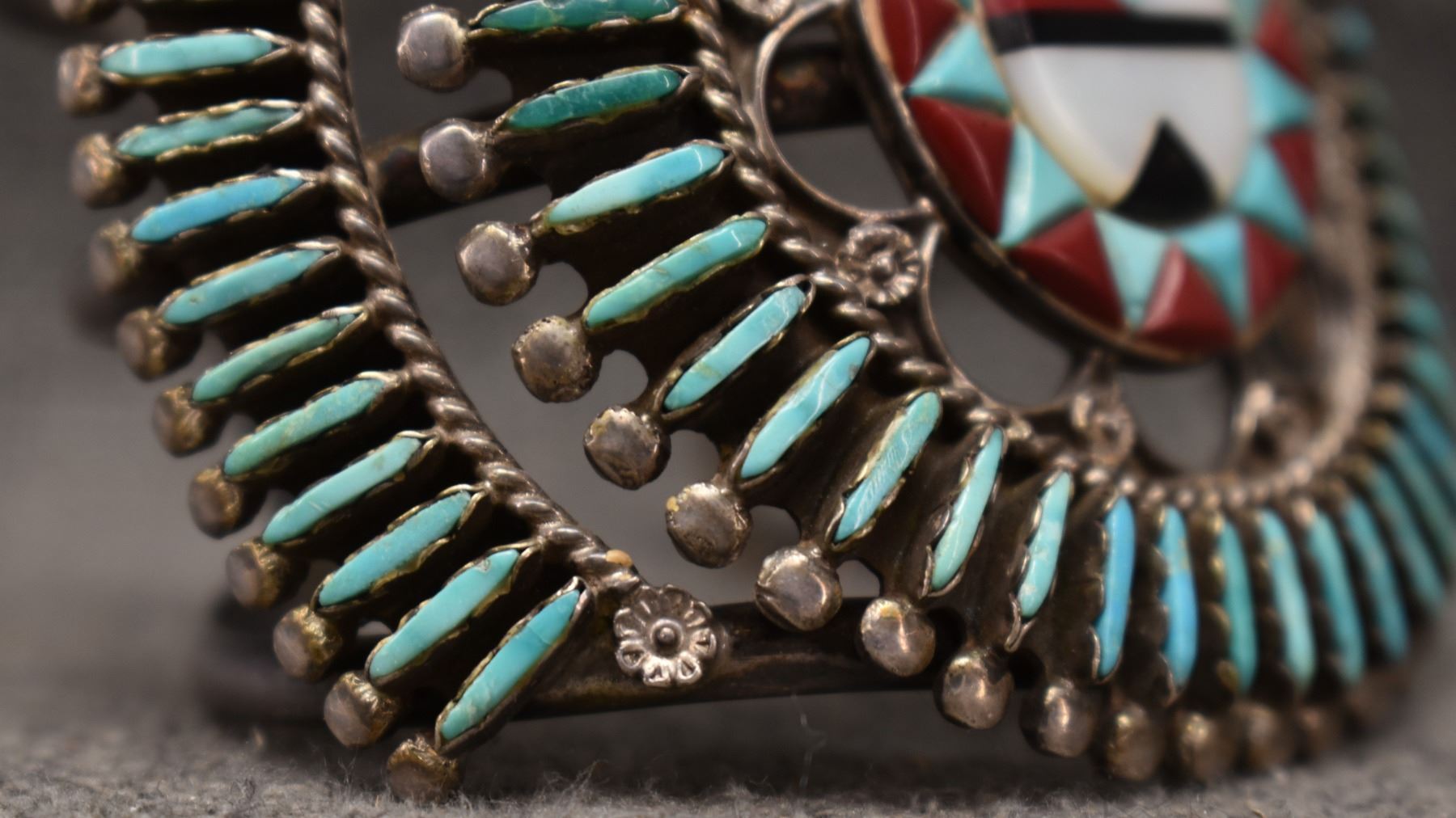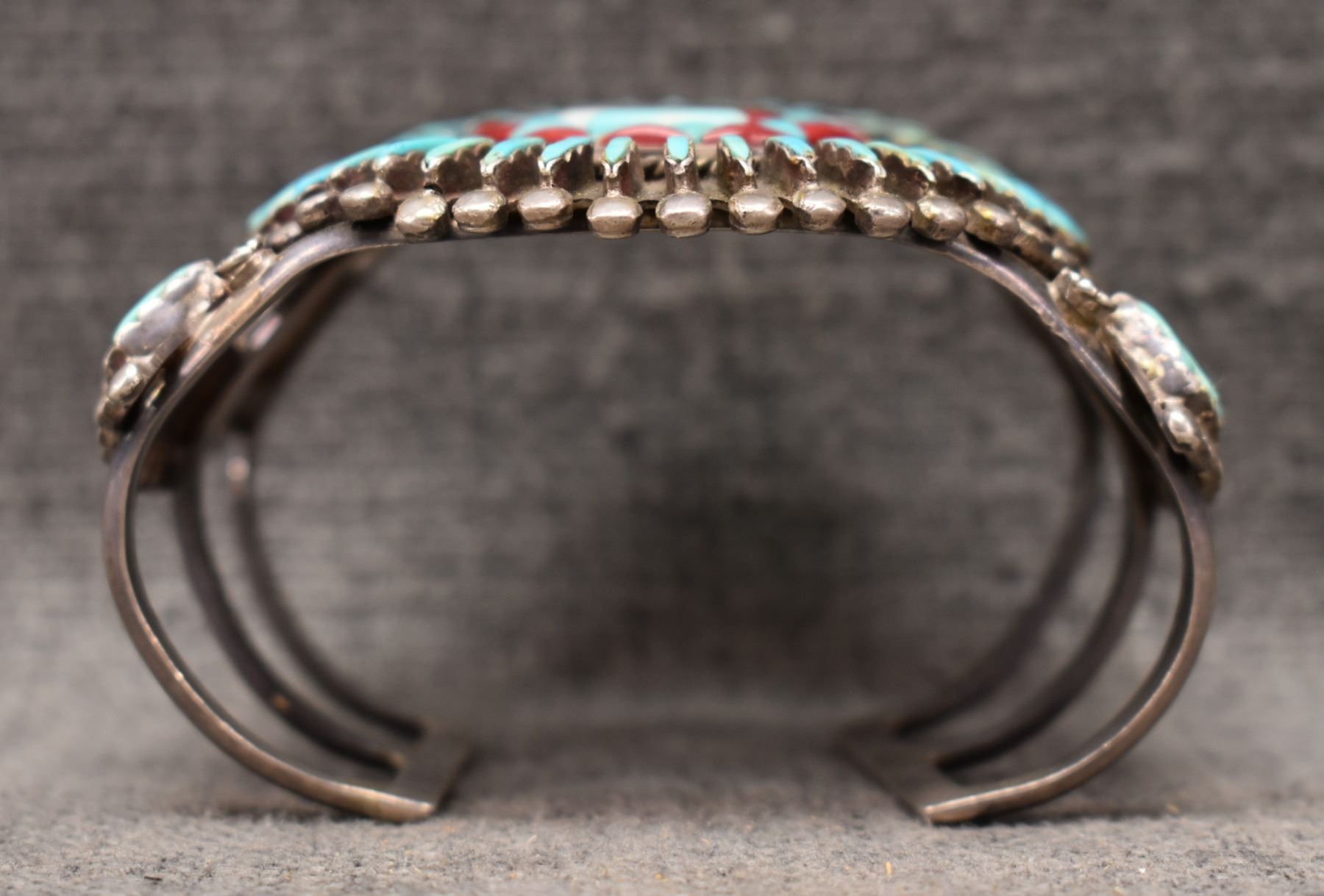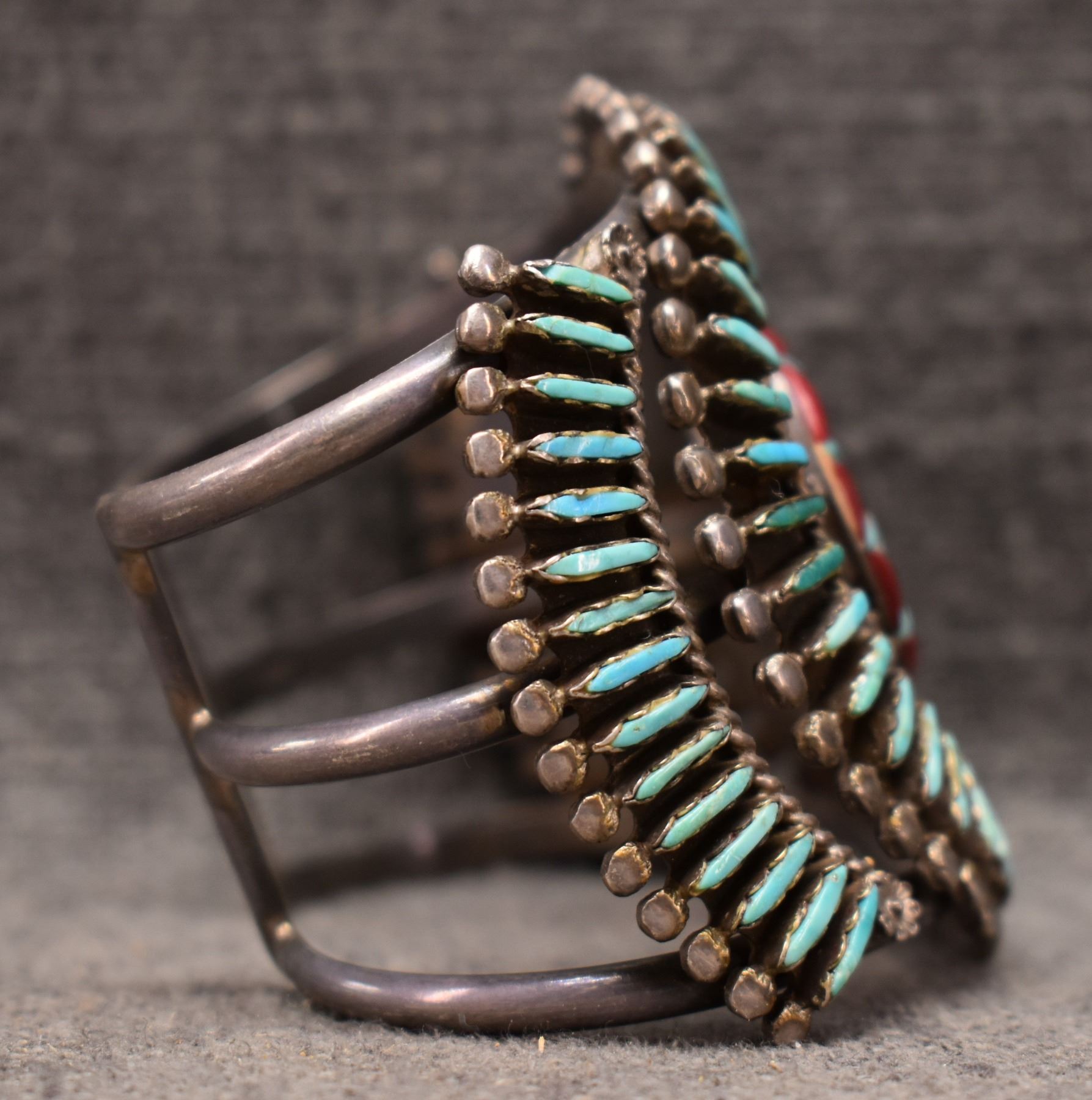 1970's Zuni. Sterling silver turquoise coral and shell bracelet. 2.75'' x 6'' x 1.25''. Total weight 105 grams