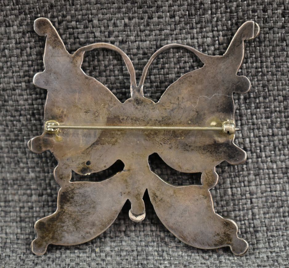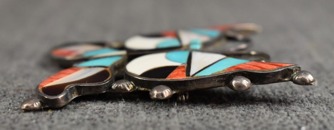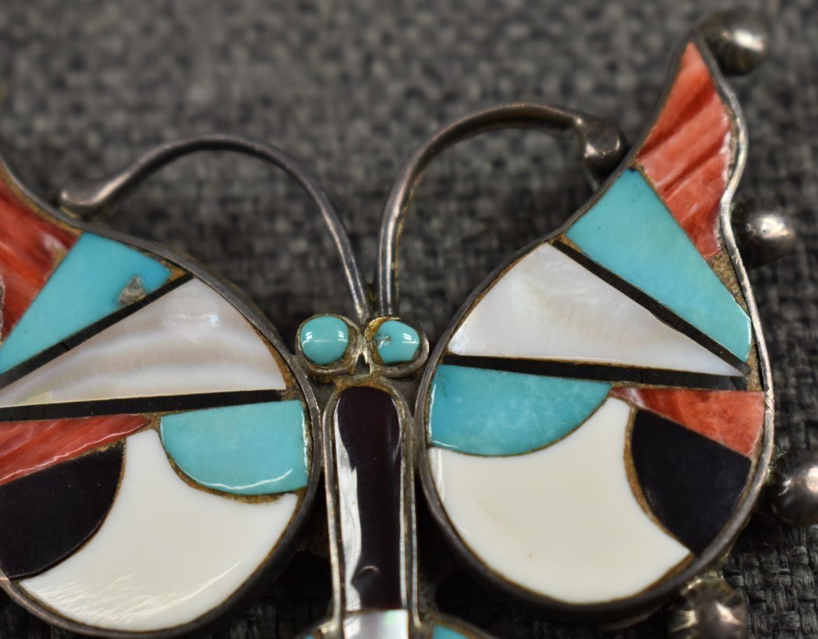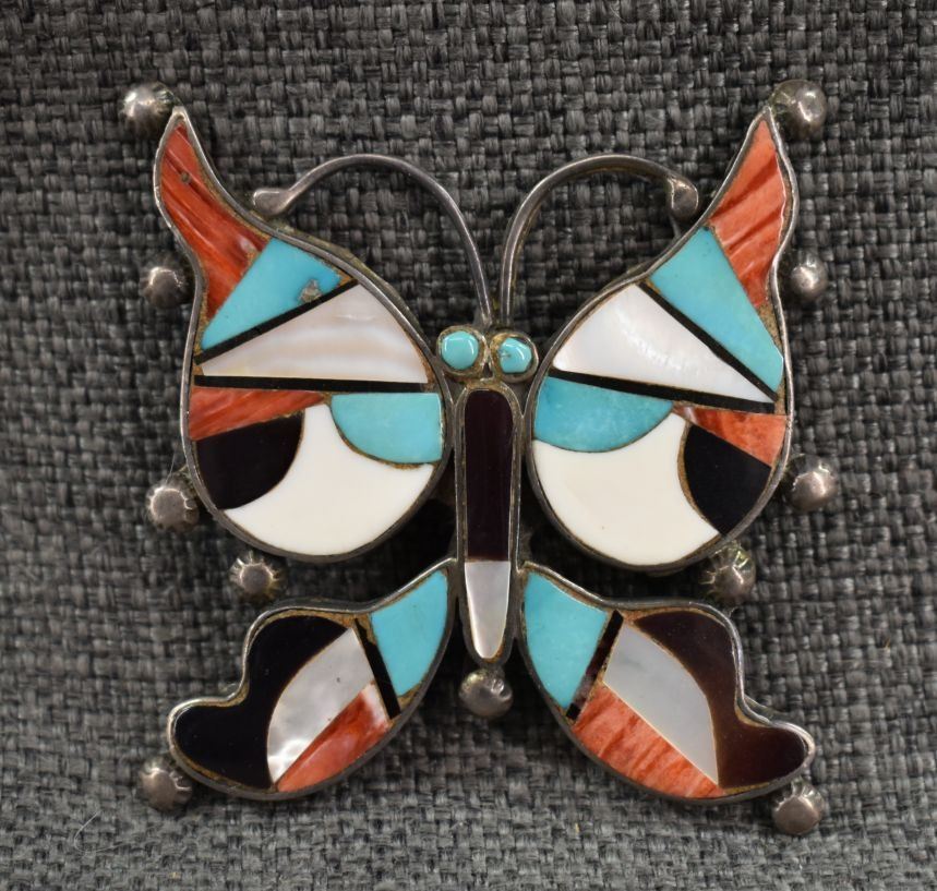 1980's Zuni. Turquoise shell and jet set in sterling silver depicting butterfly. 2.75'' x 2.75''. Total weight 36 grams