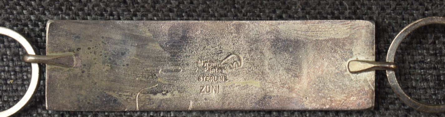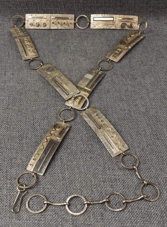 1990-2000's Zuni, sterling silver stamped and raised designs, eight conchos 1" x 3.5" total length 46" long by Myron Panteah. total weight 359 grams