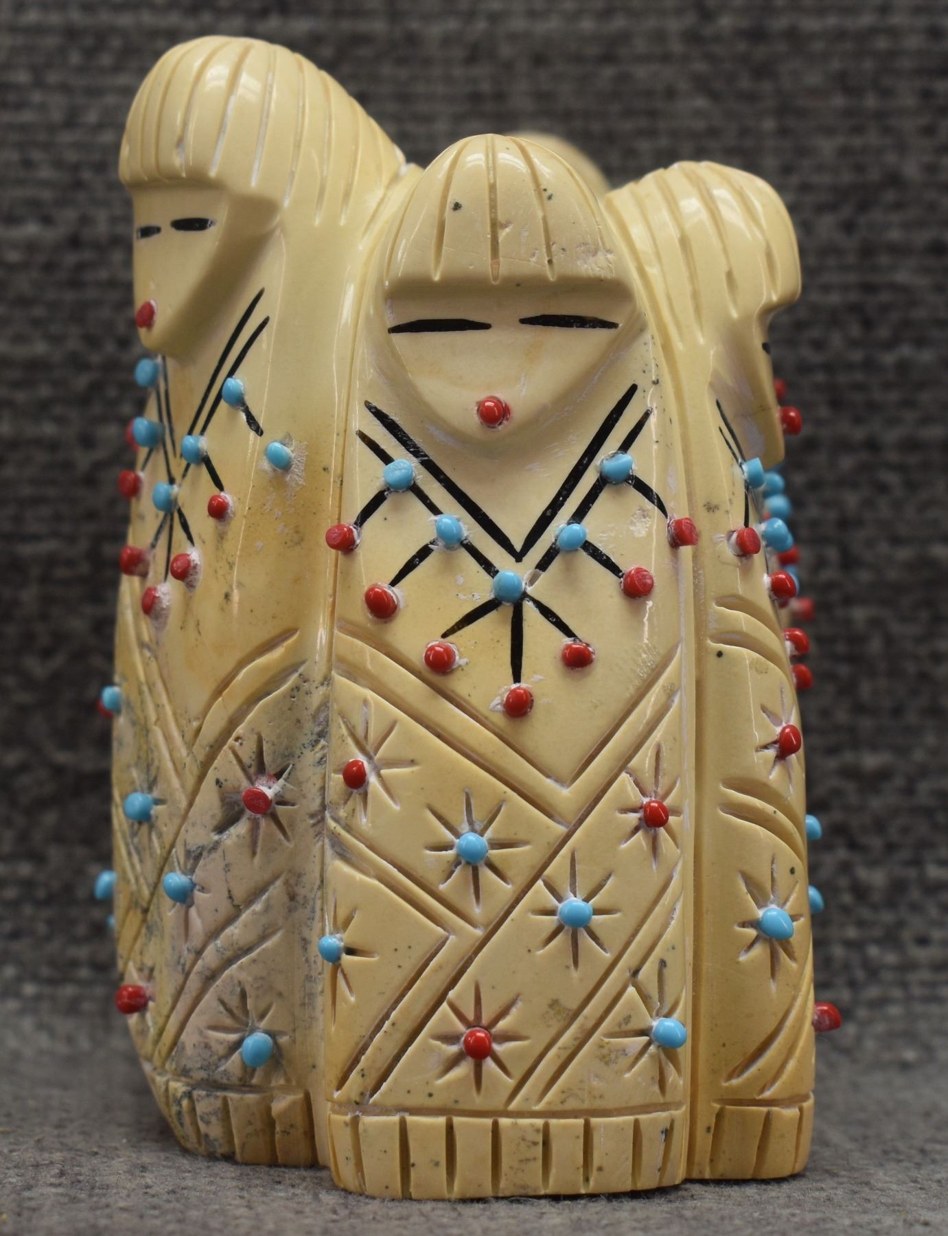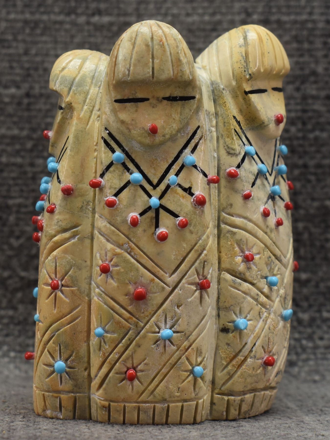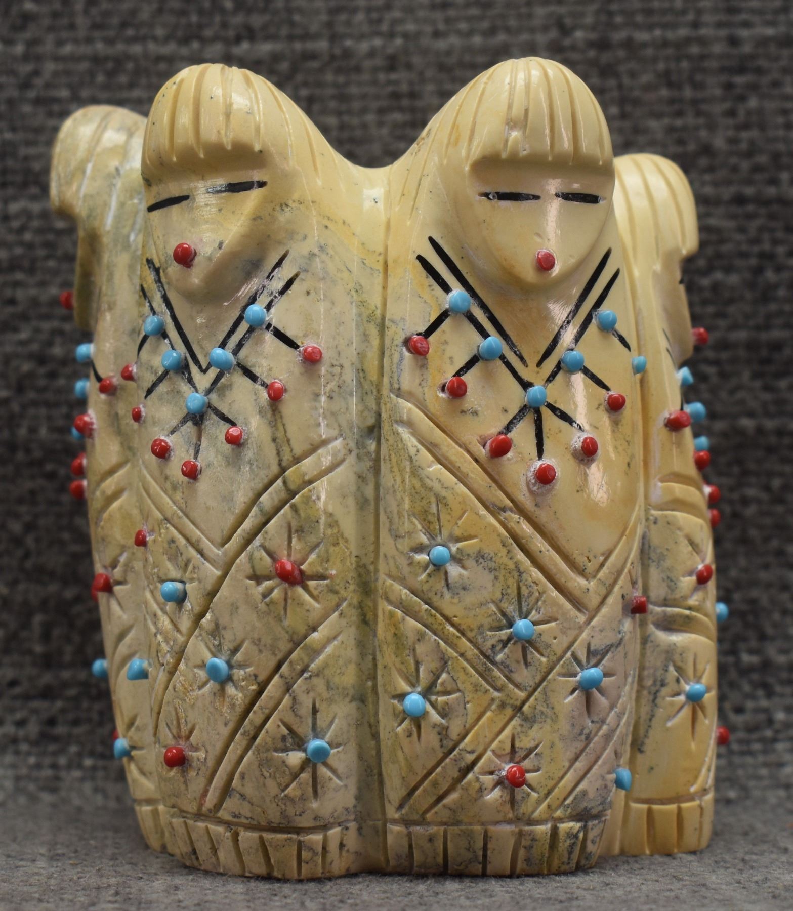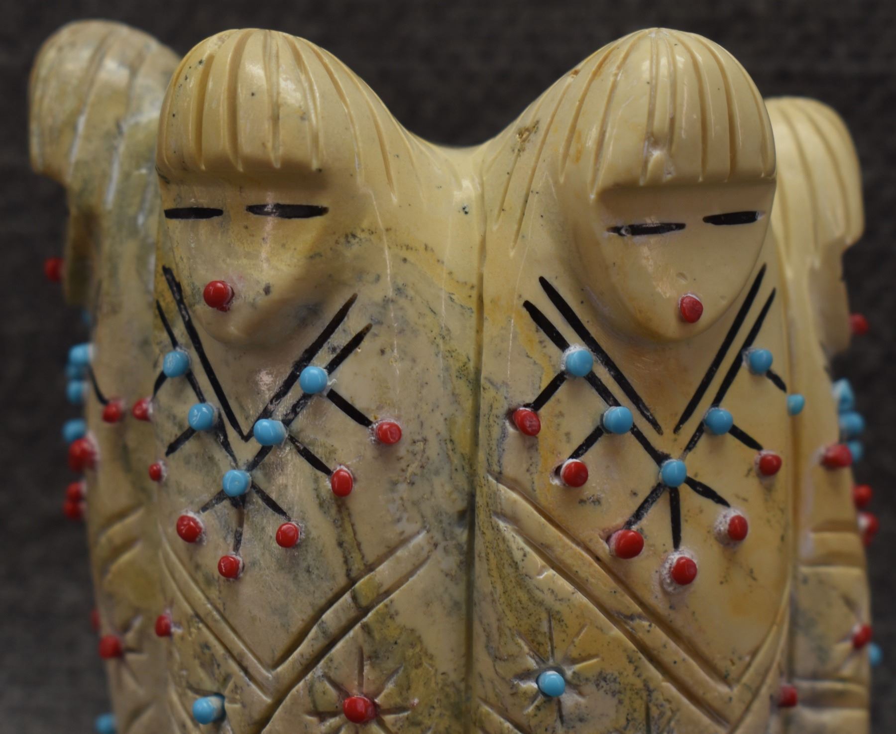 1990's Zuni hand carved stone depicting corn maidens, signed Terrence & Jessica Matza. 3'' x 2.75'' x 2''