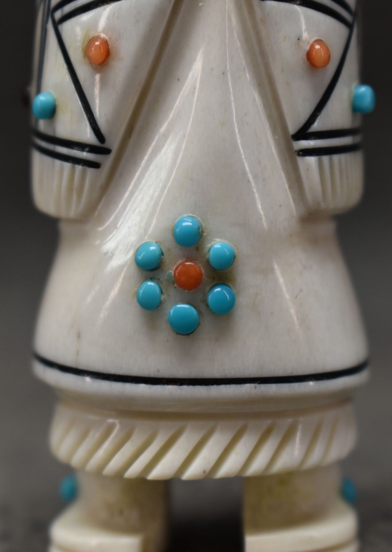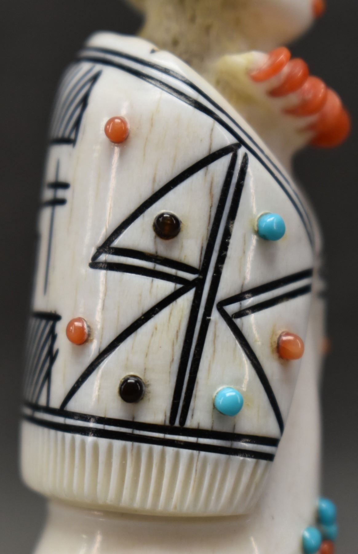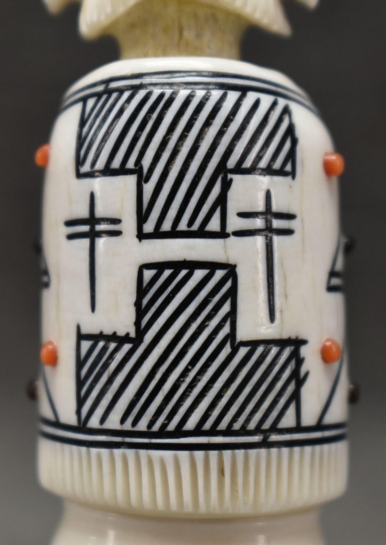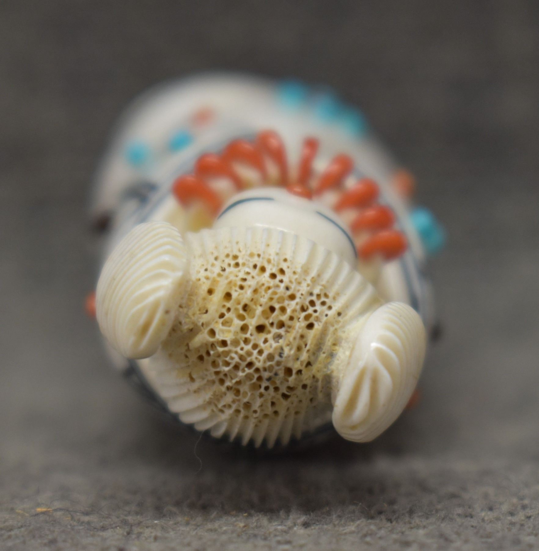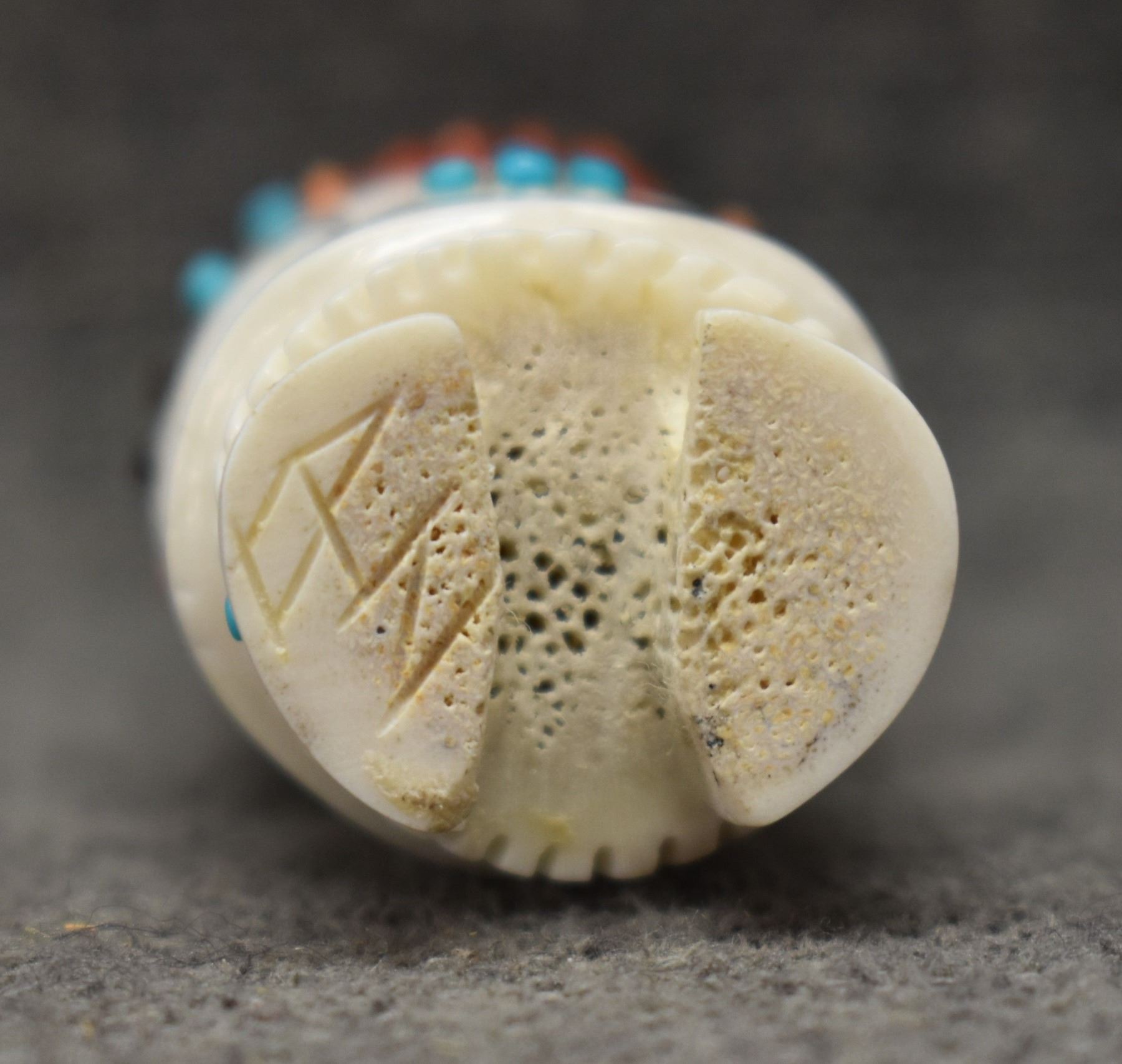 2000's Zuni, hand carved antler and inlayed turquoise and coral fetish. Signed CP for Claudia Peina, 3.25'' tall