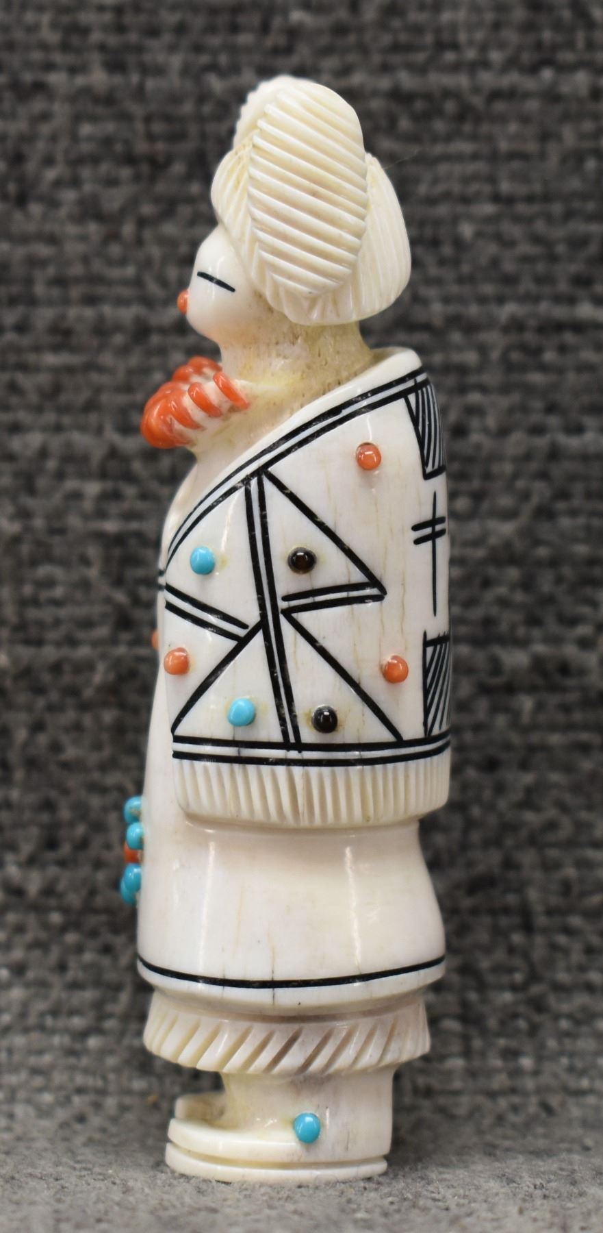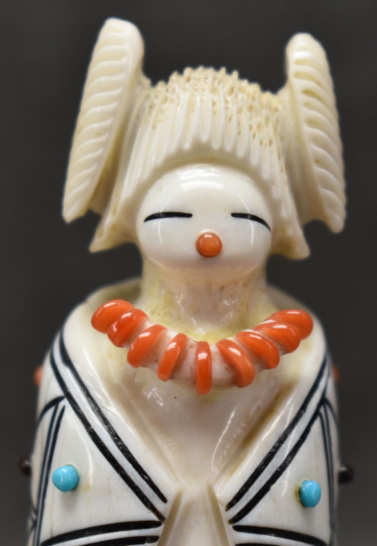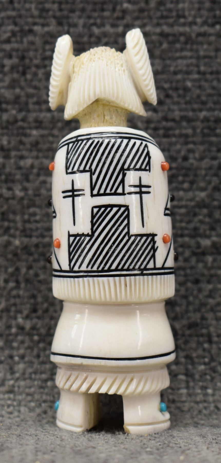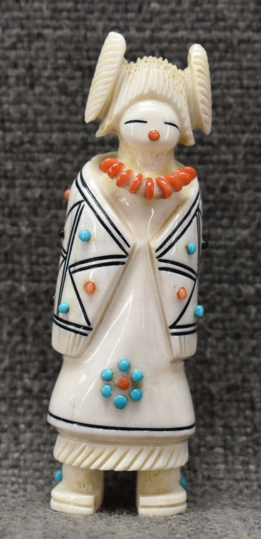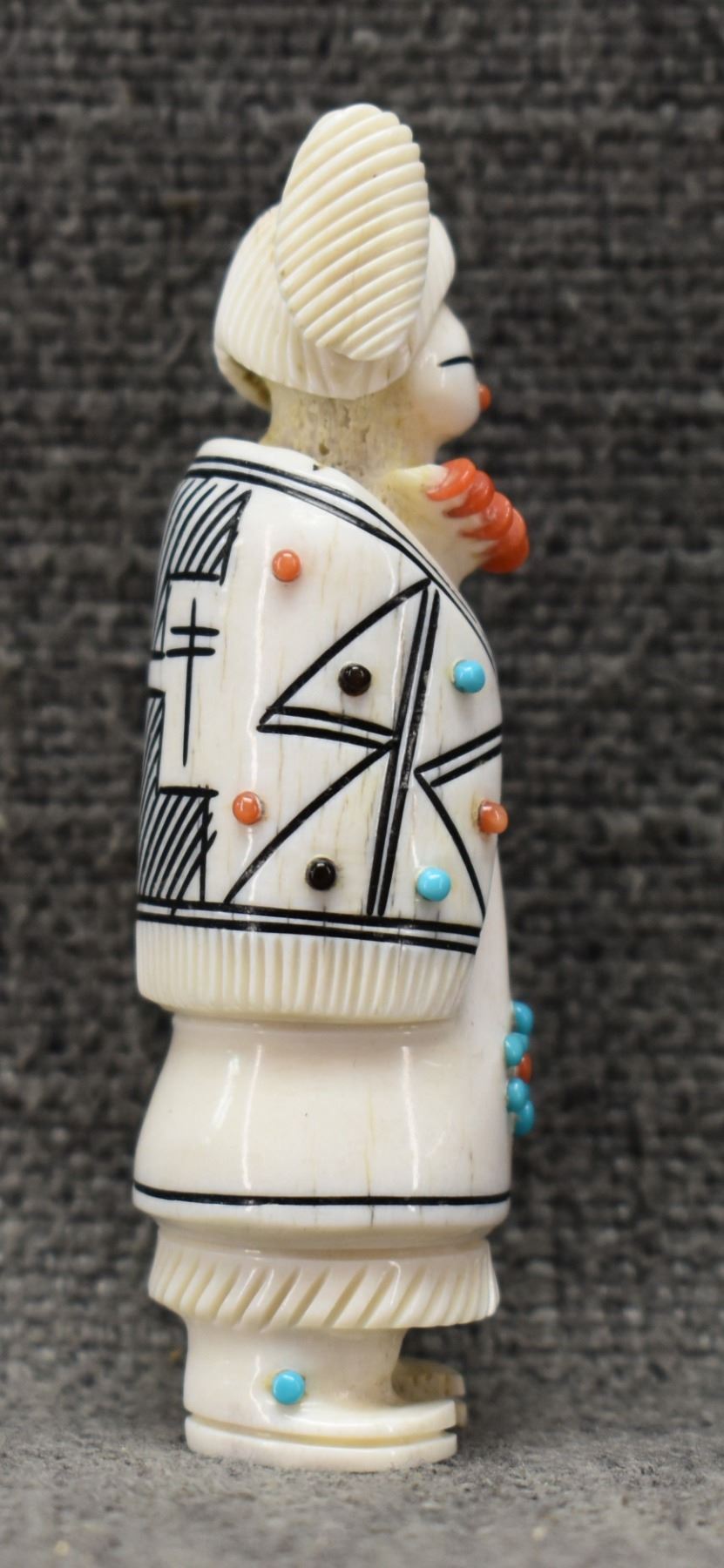2000's Zuni, hand carved antler and inlayed turquoise and coral fetish. Signed CP for Claudia Peina, 3.25'' tall