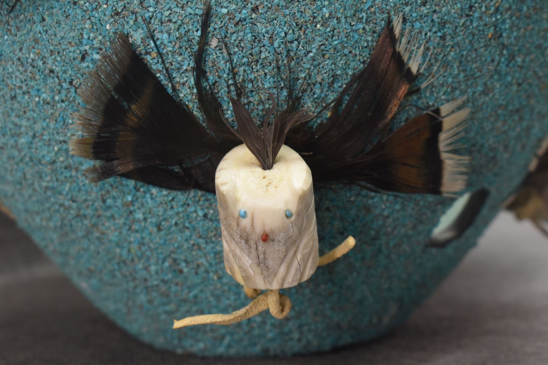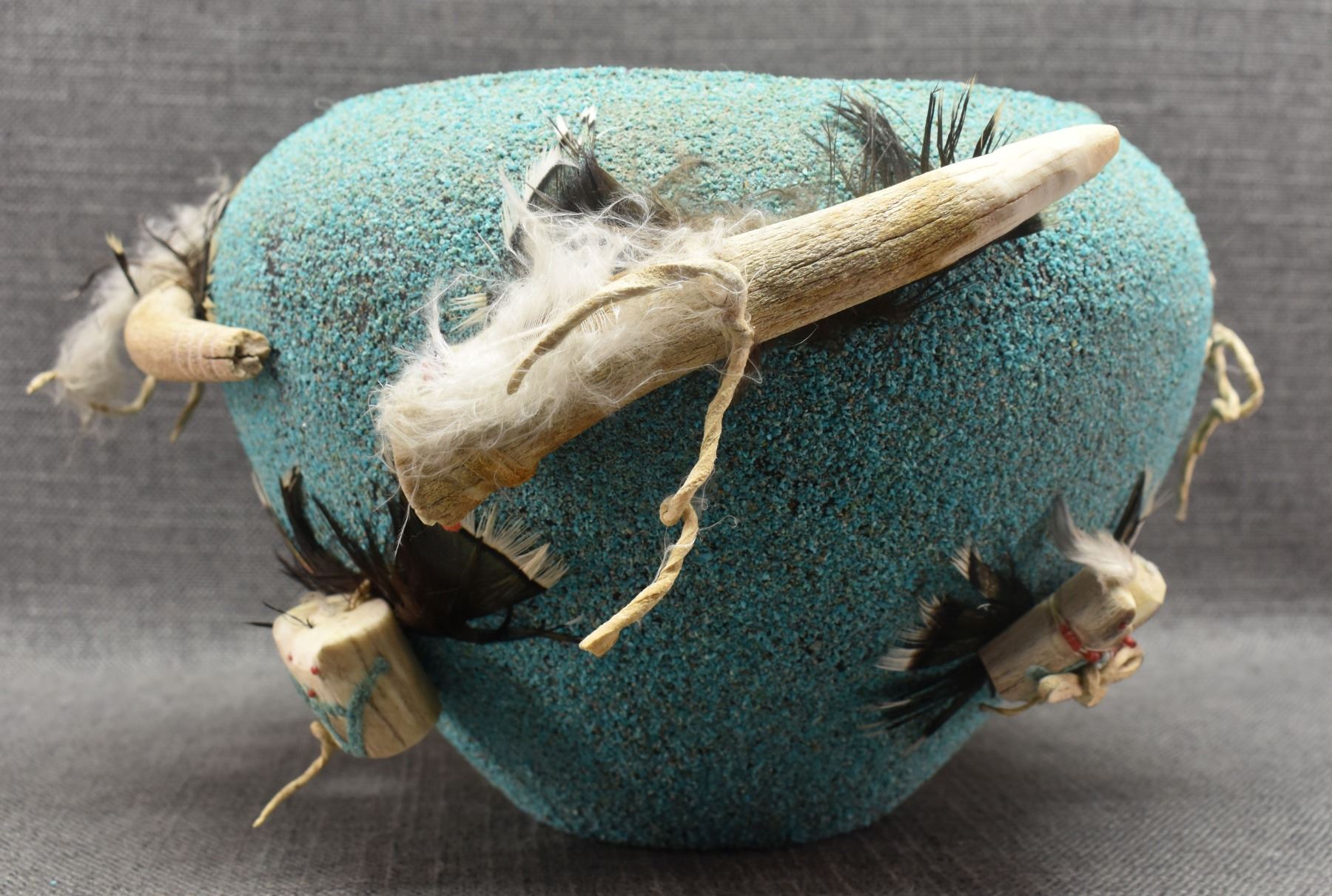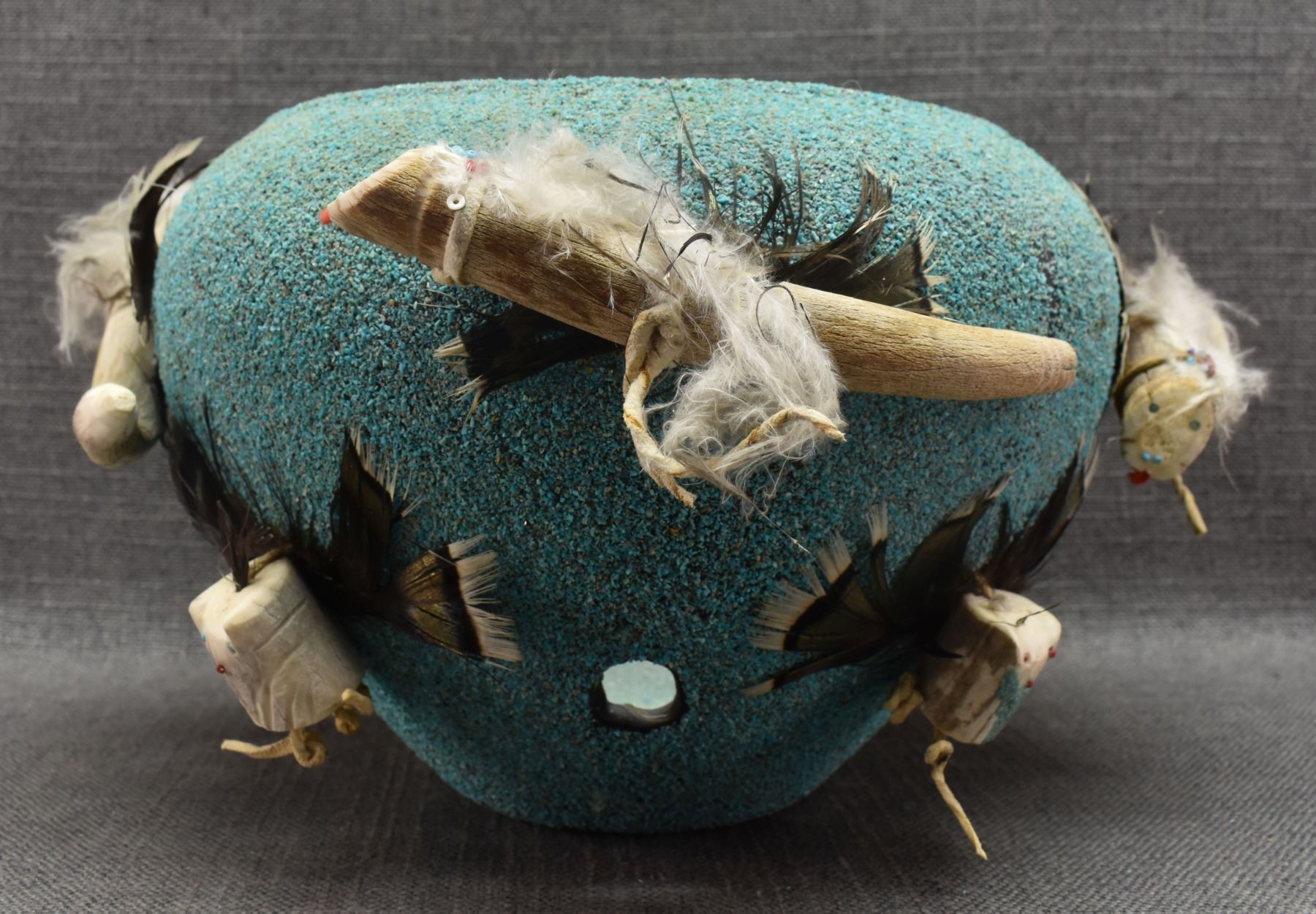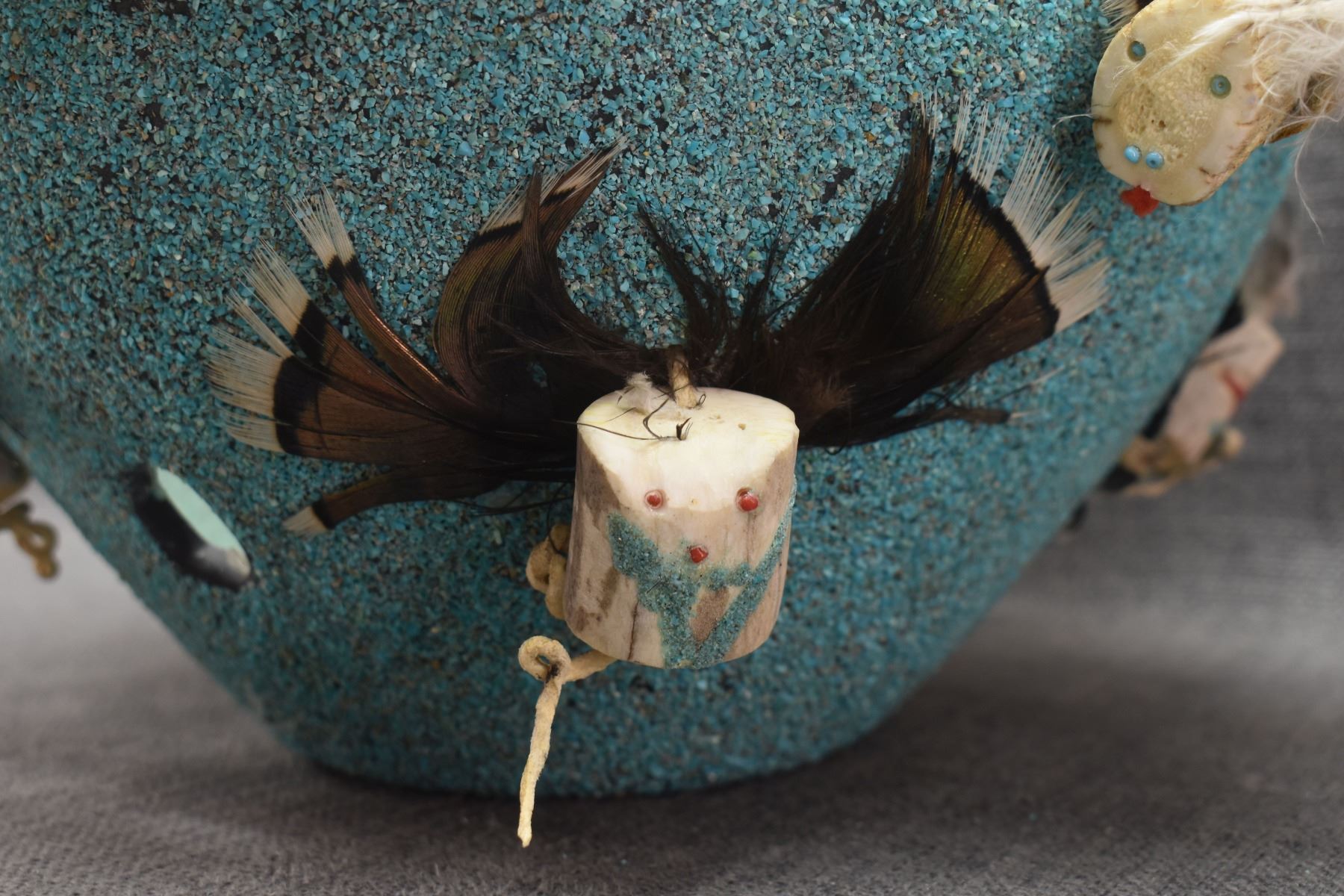 2000.s Zuni. Hand coiled and covered crushed turquoise and hand carved antler fetishes. 8'' x 11''