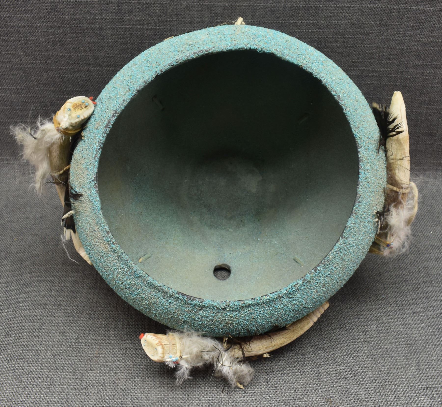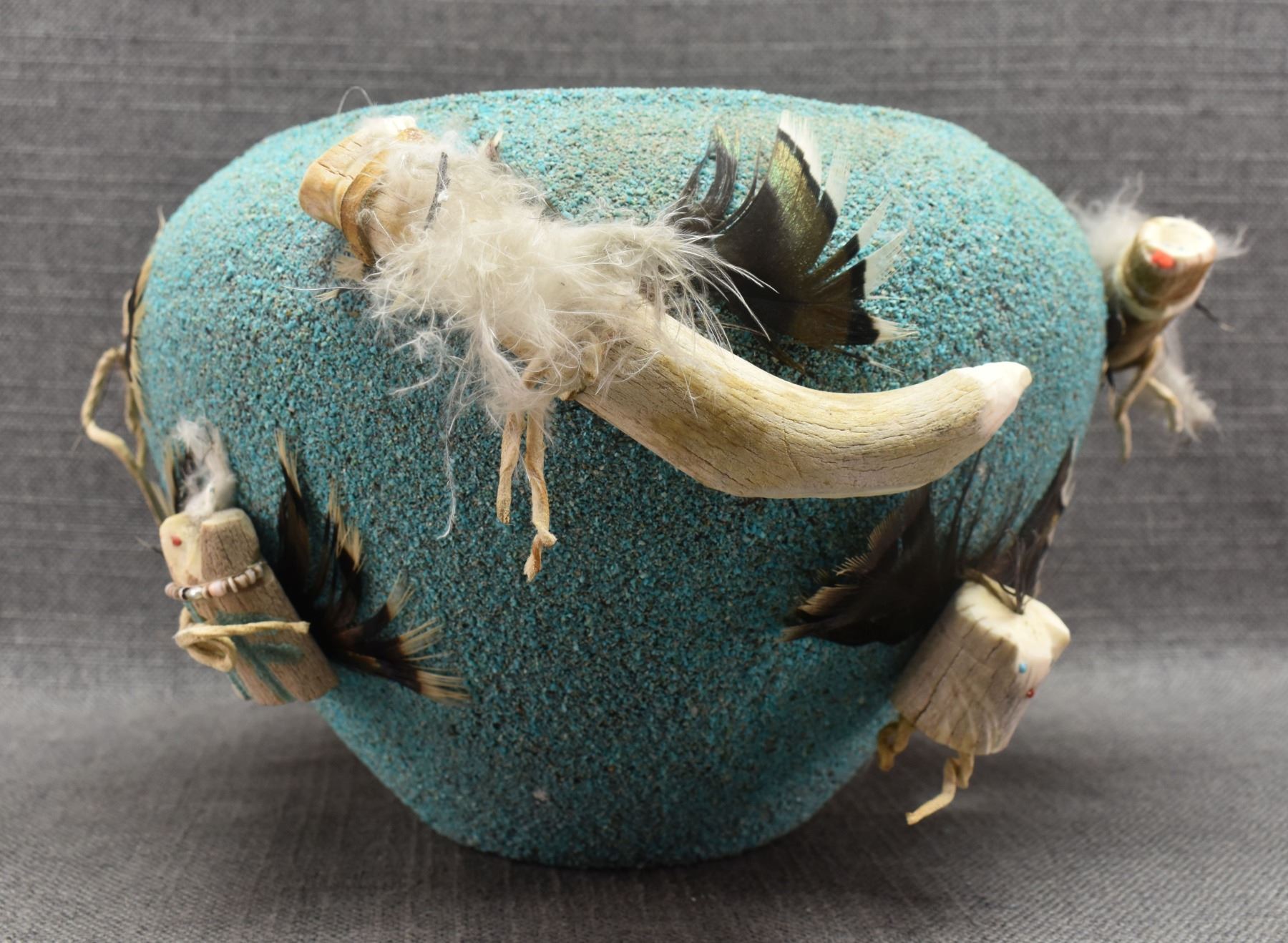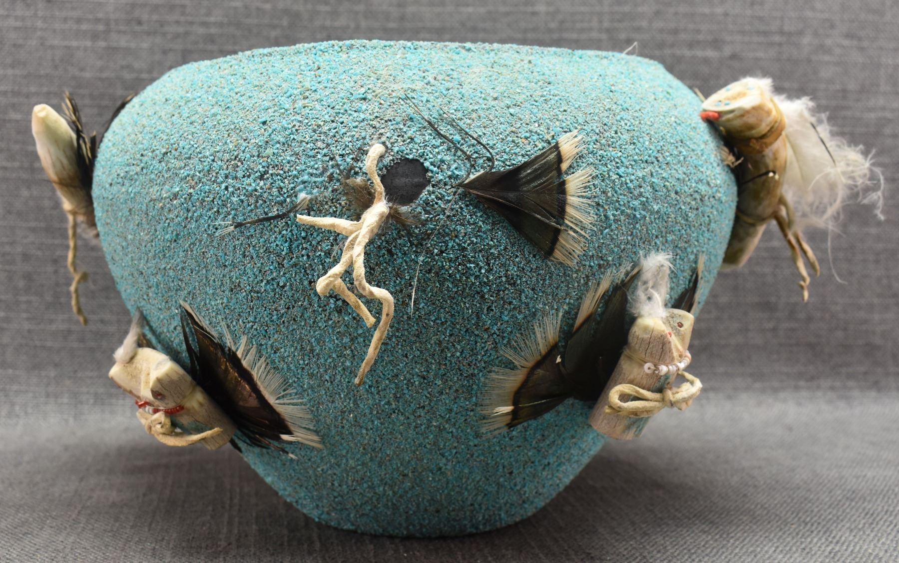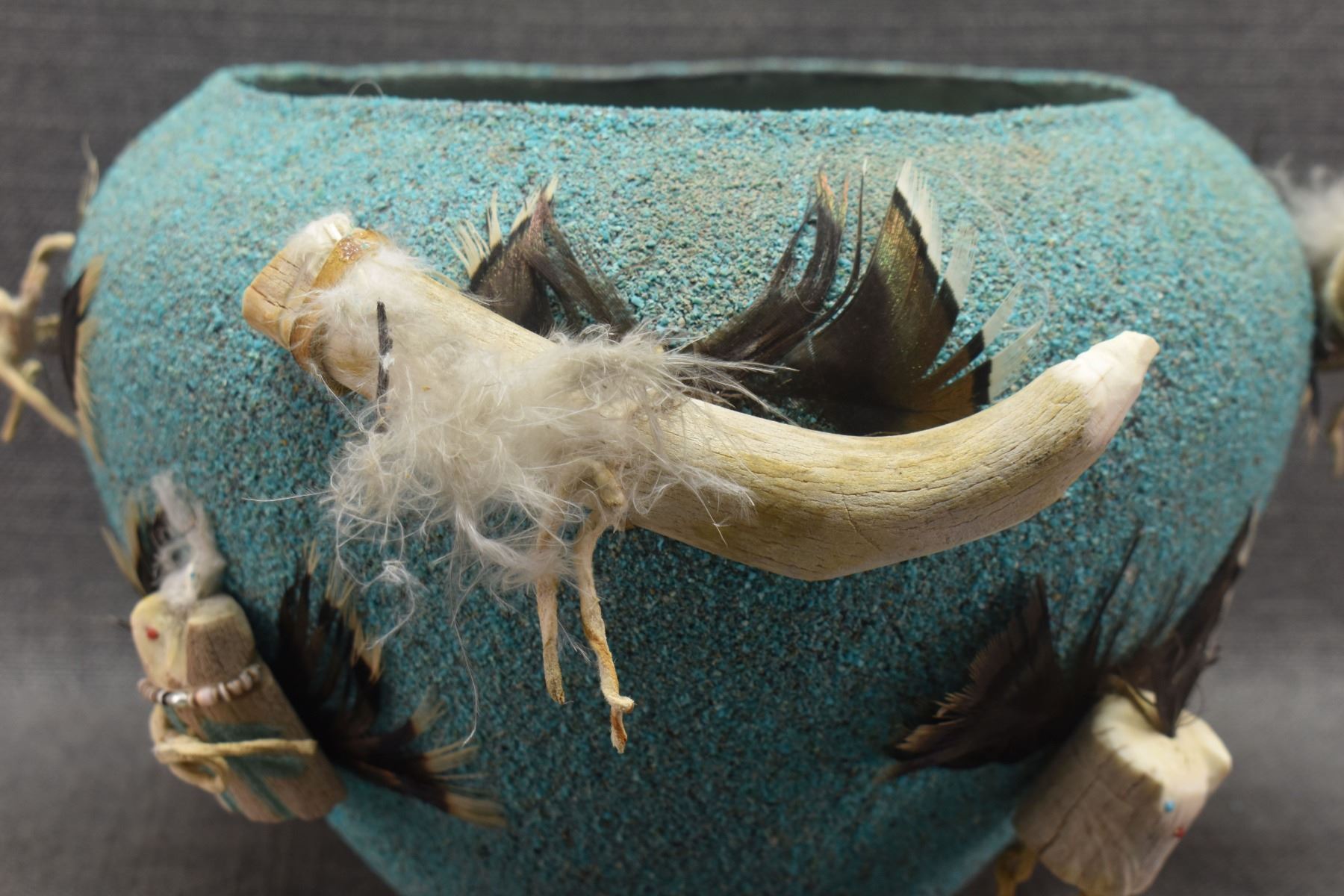 2000.s Zuni. Hand coiled and covered crushed turquoise and hand carved antler fetishes. 8'' x 11''