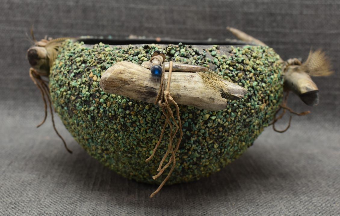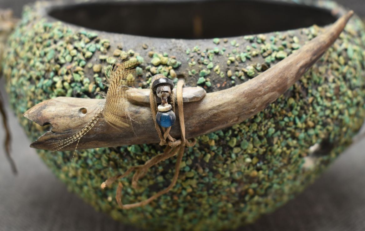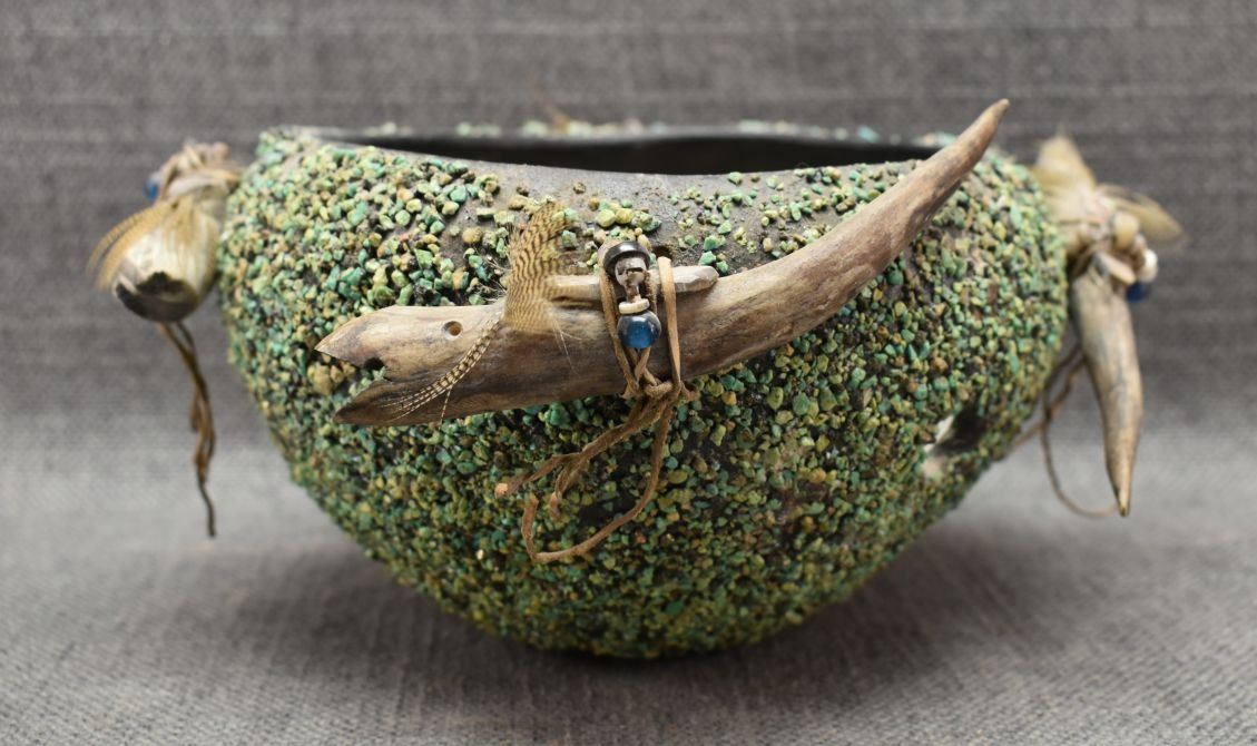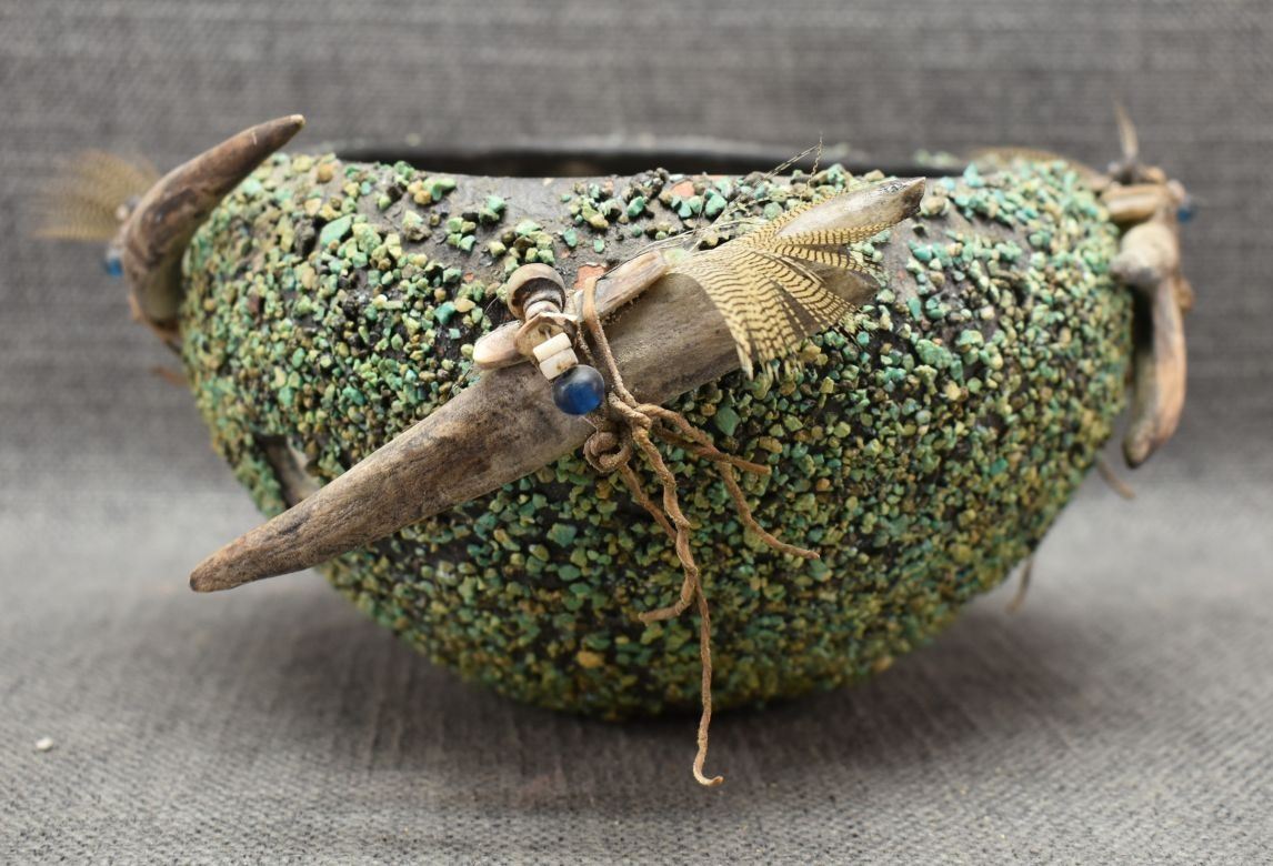 1960's Zuni. Turquoise covered pottery bowl 4'' x 7'' and 4 antler fetishes approx. 4'' long