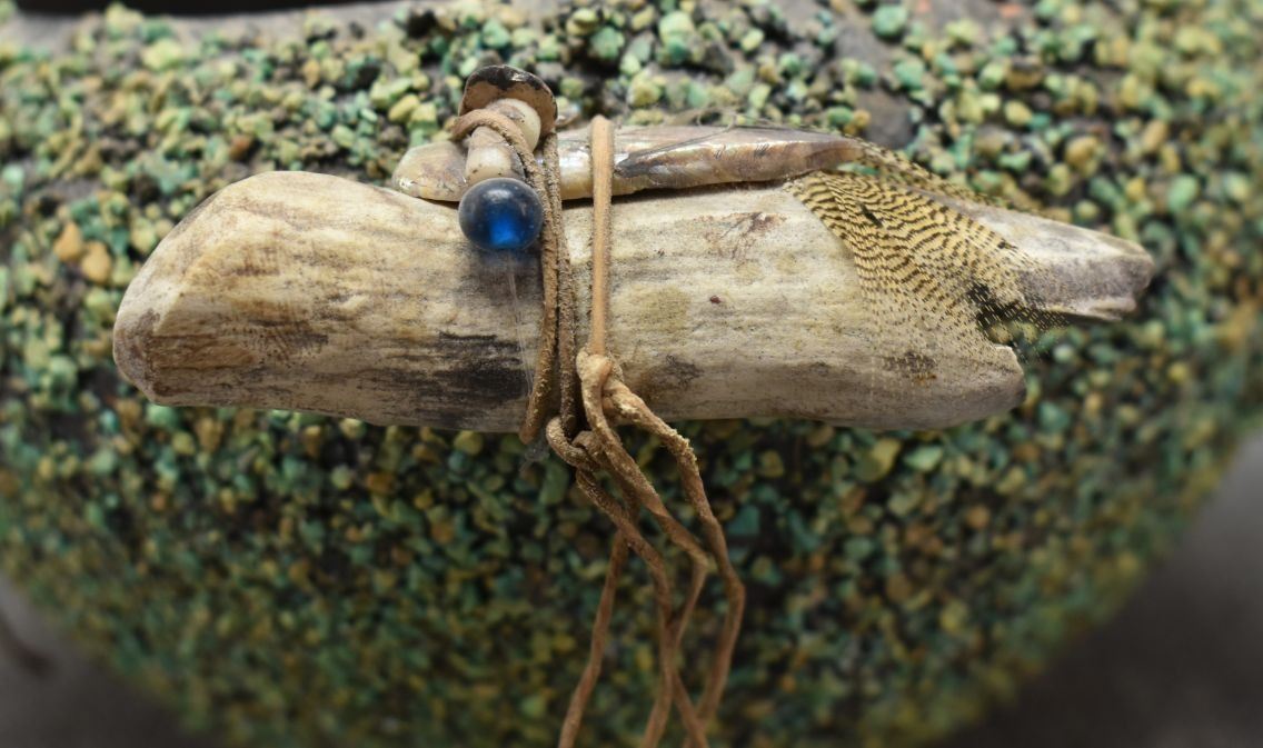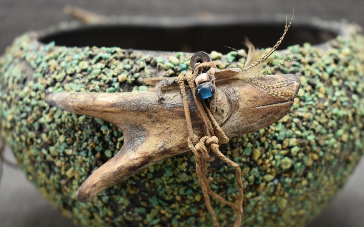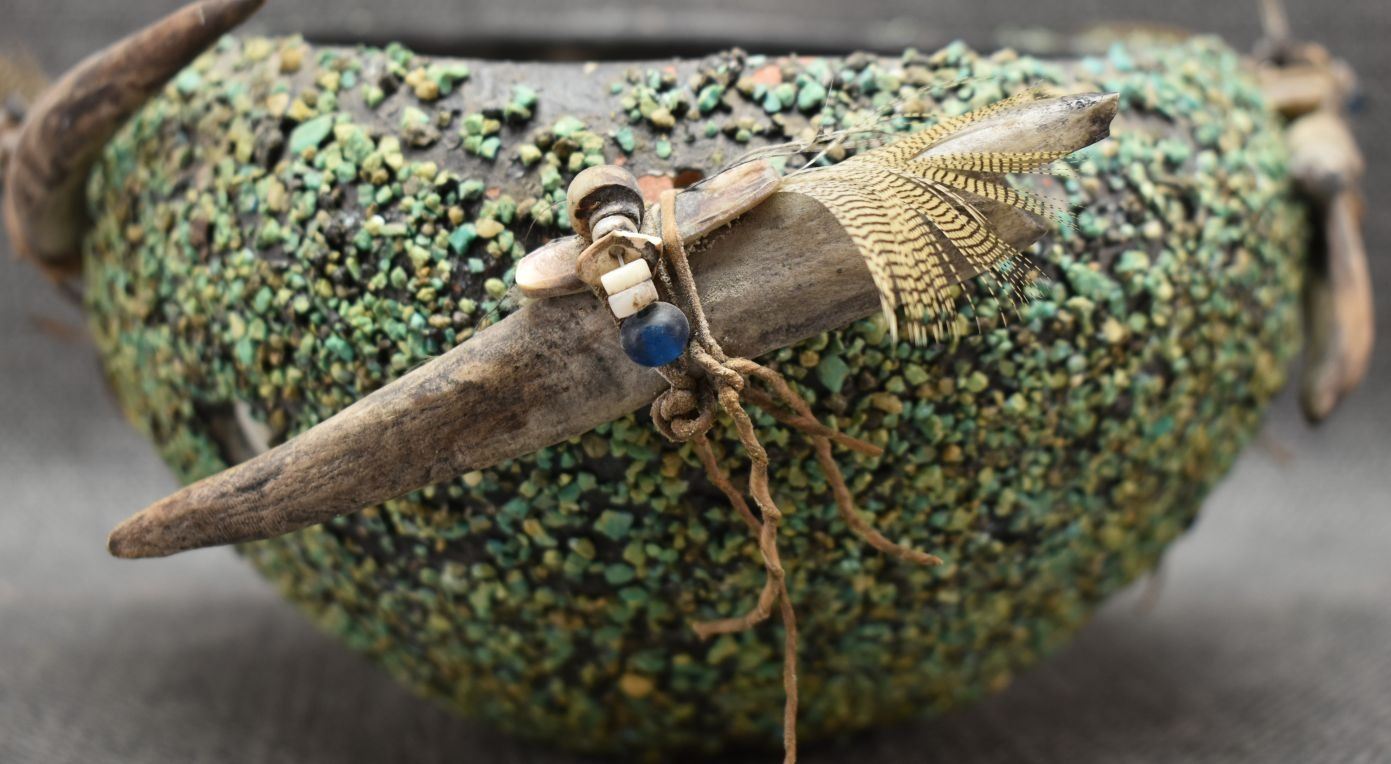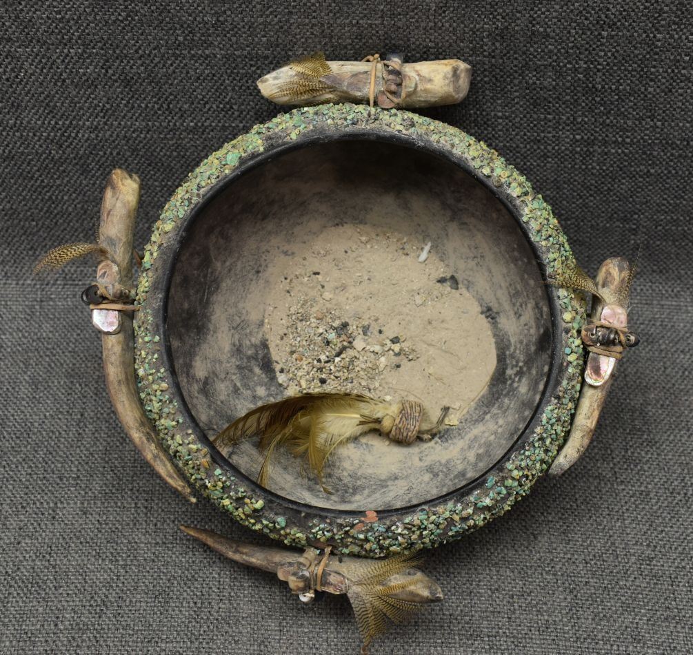 1960's Zuni. Turquoise covered pottery bowl 4'' x 7'' and 4 antler fetishes approx. 4'' long