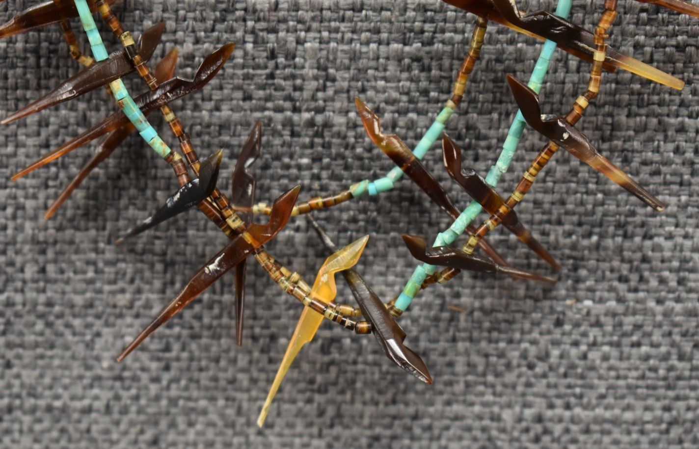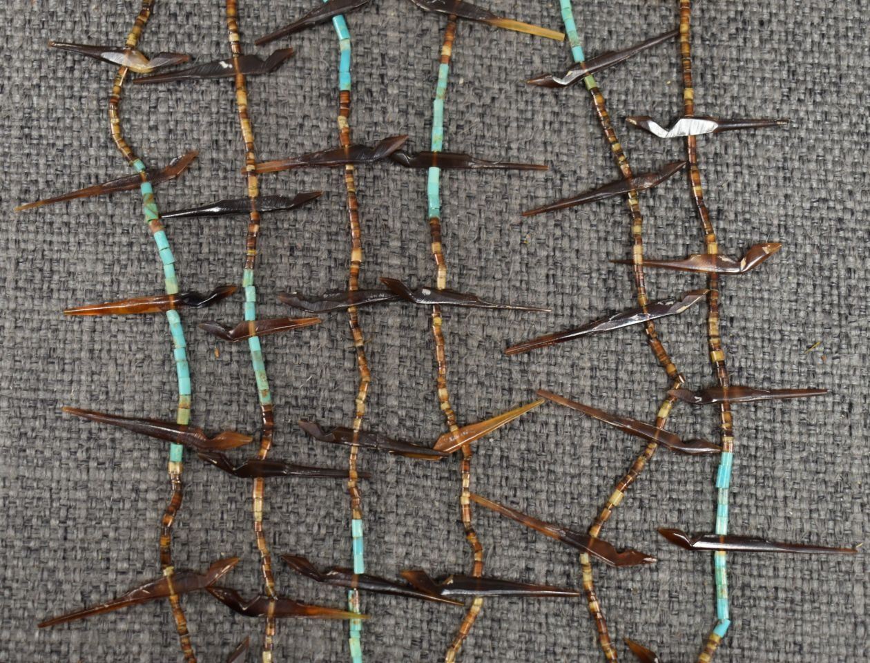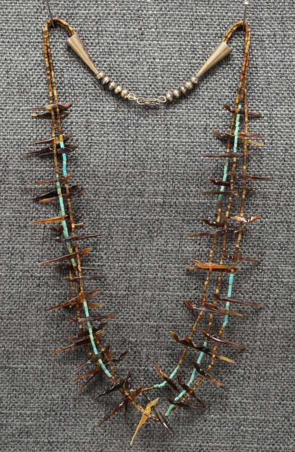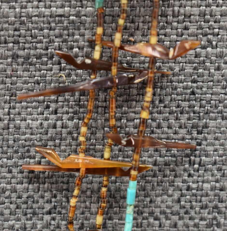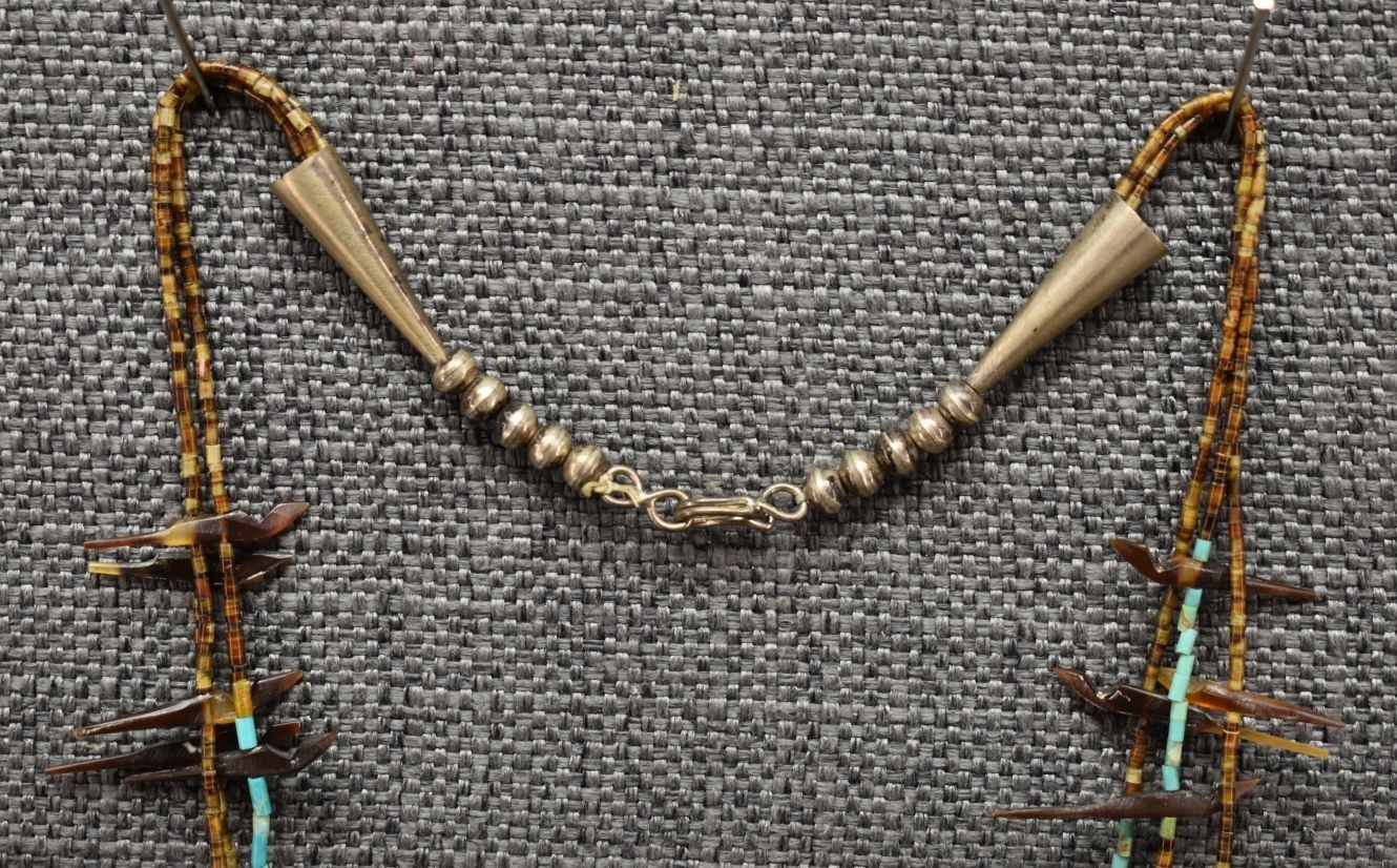 1960's Zuni. Three strand carved shell fetishes and turquoise and shell heishe. 20'' long