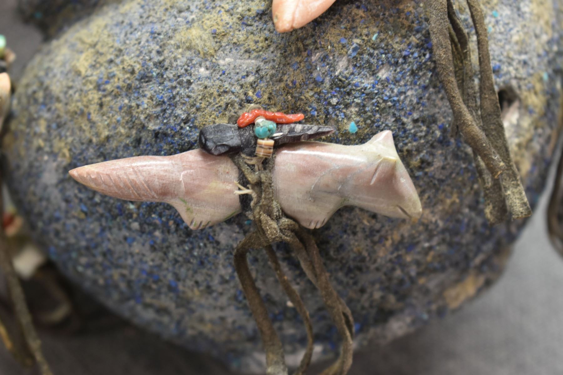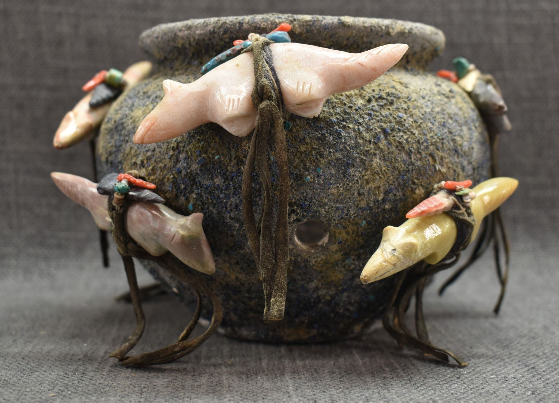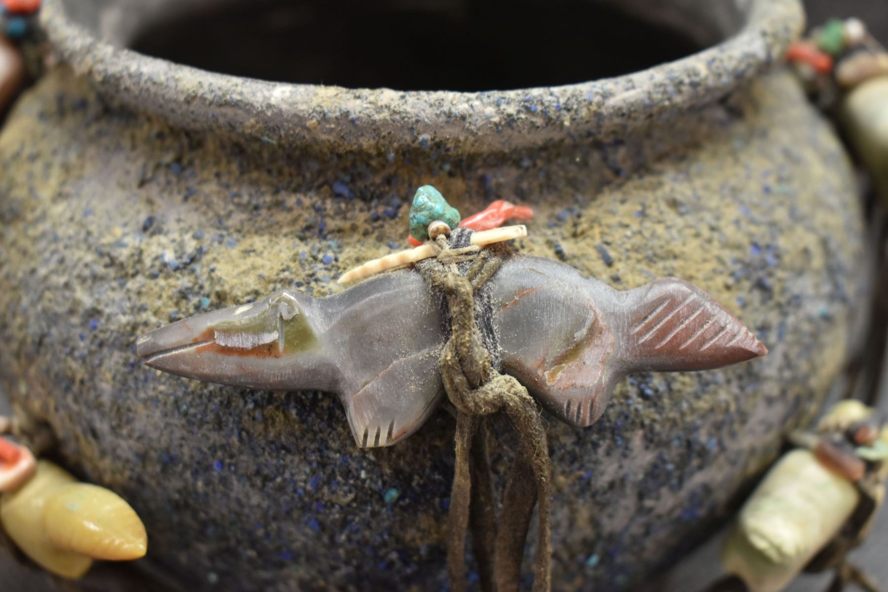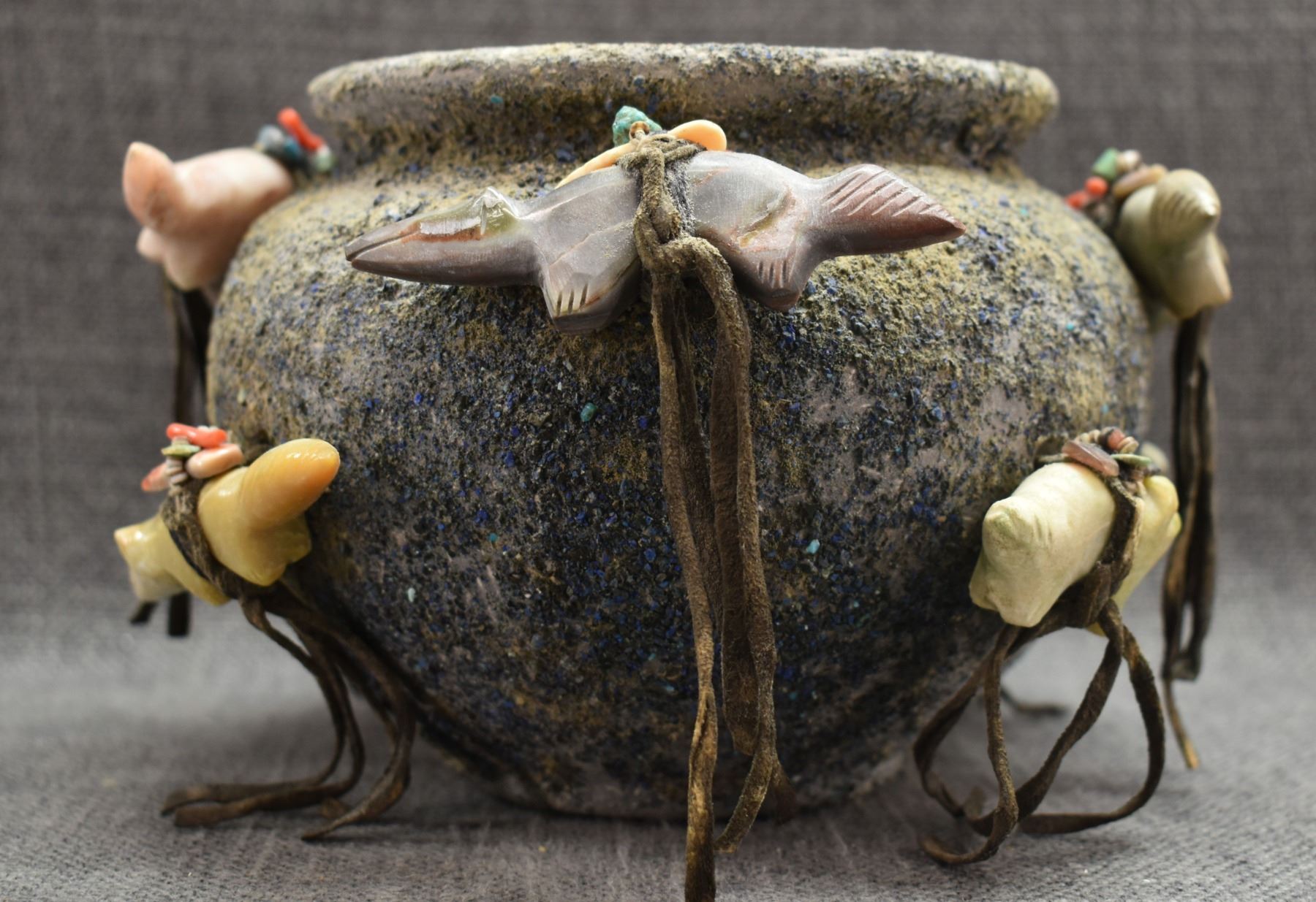 1970's Zuni fetish pots with 8 Hand carved fetish tied to the outside two on the in side by Edena Weahkee. 4.75" x 6"