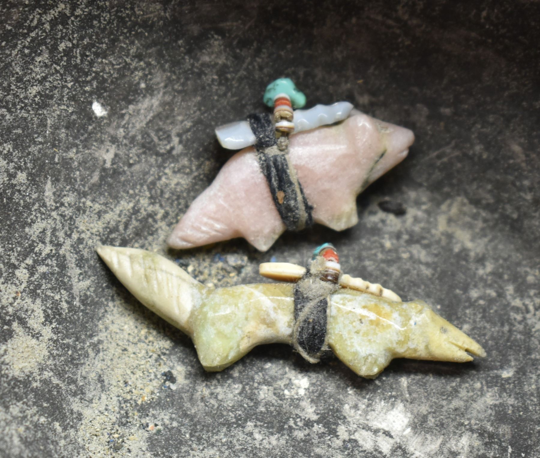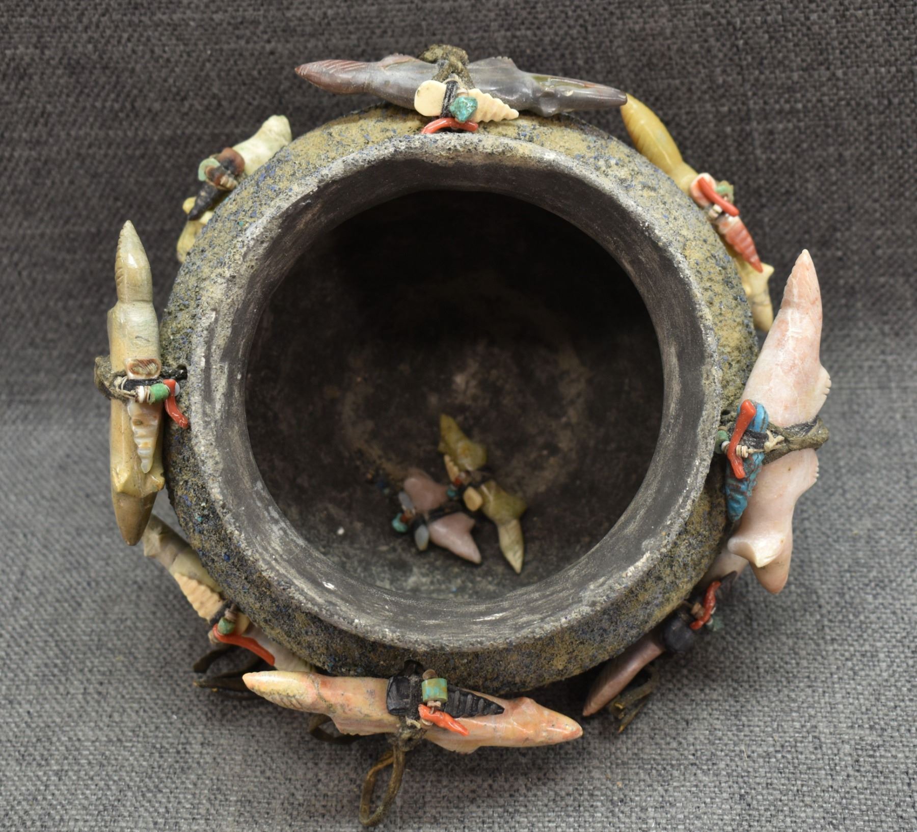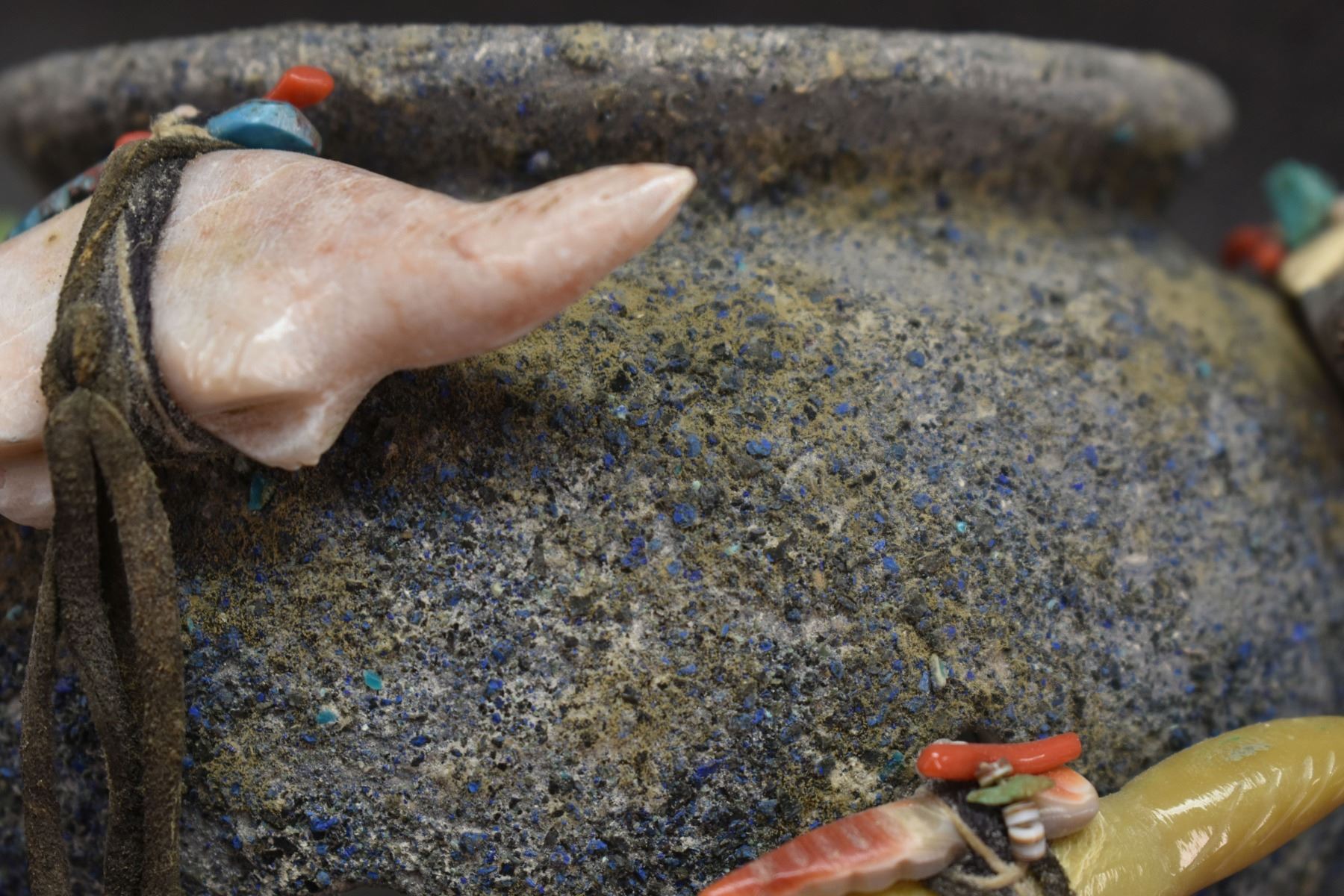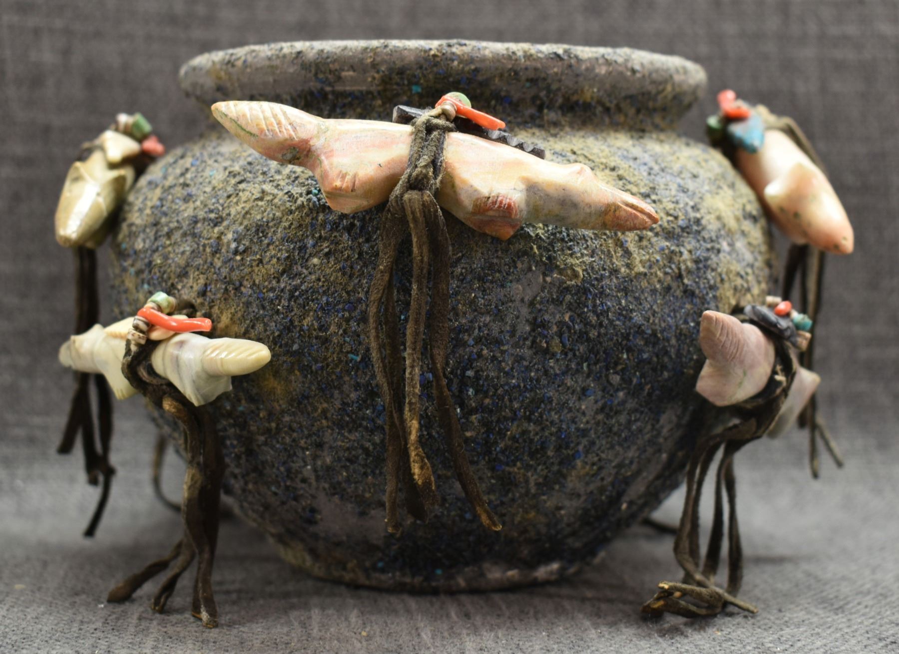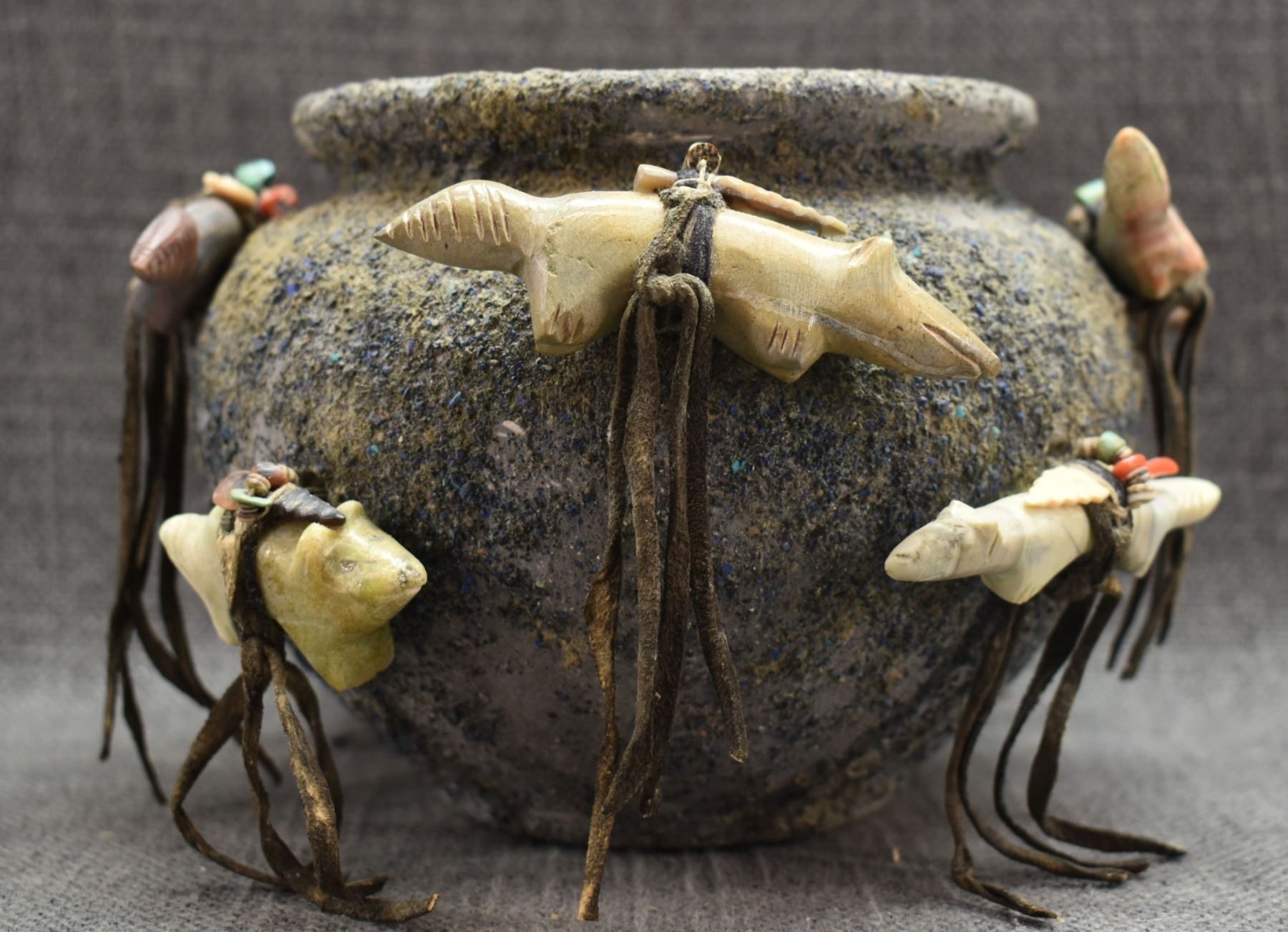 1970's Zuni fetish pots with 8 Hand carved fetish tied to the outside two on the in side by Edena Weahkee. 4.75" x 6"