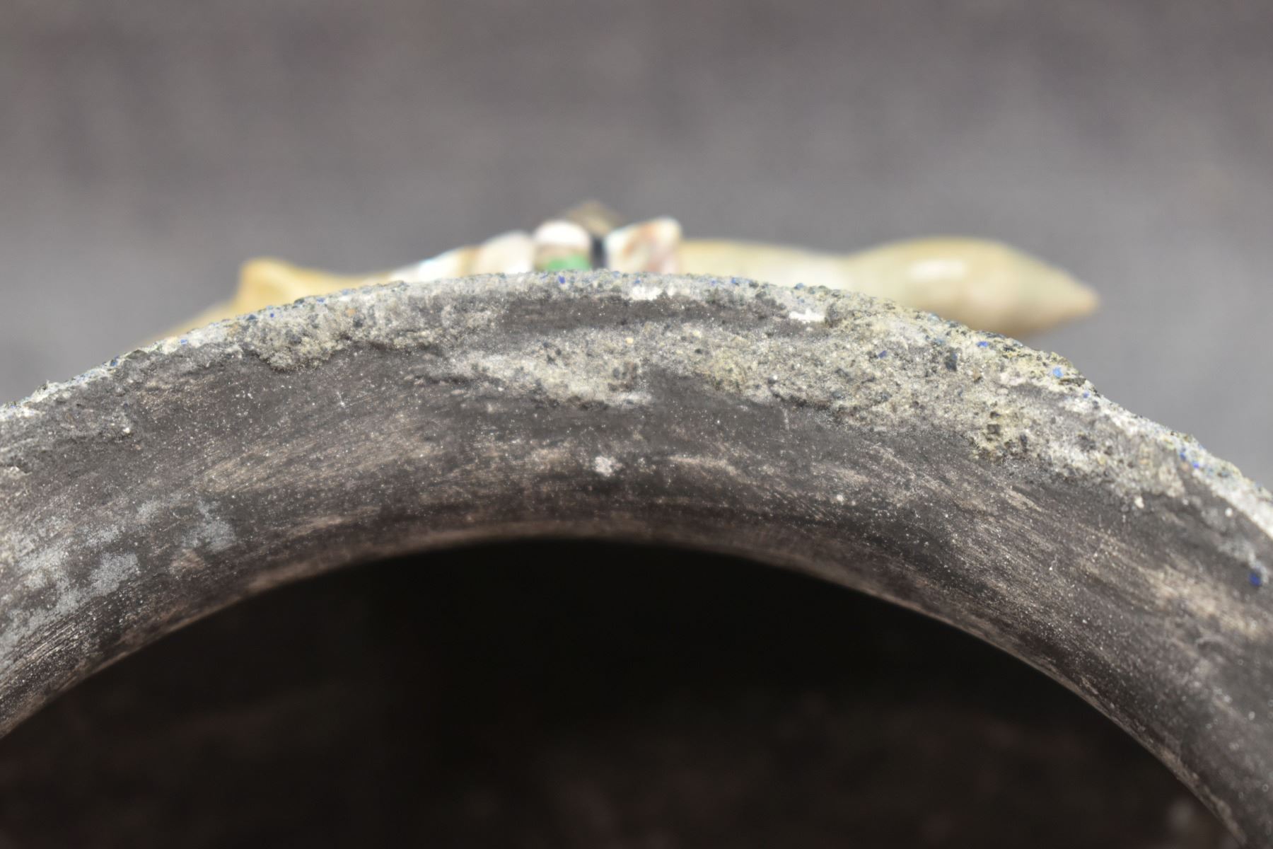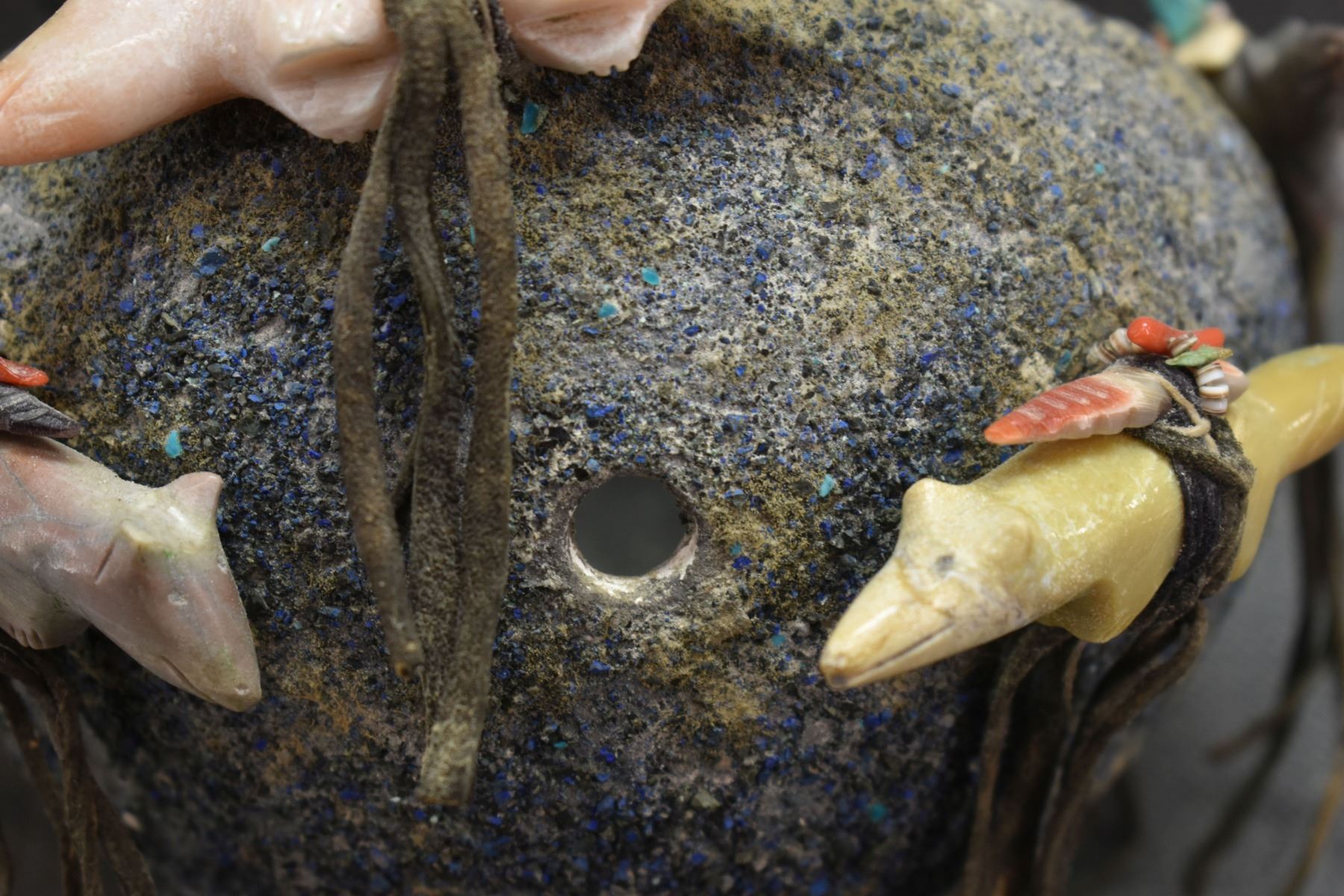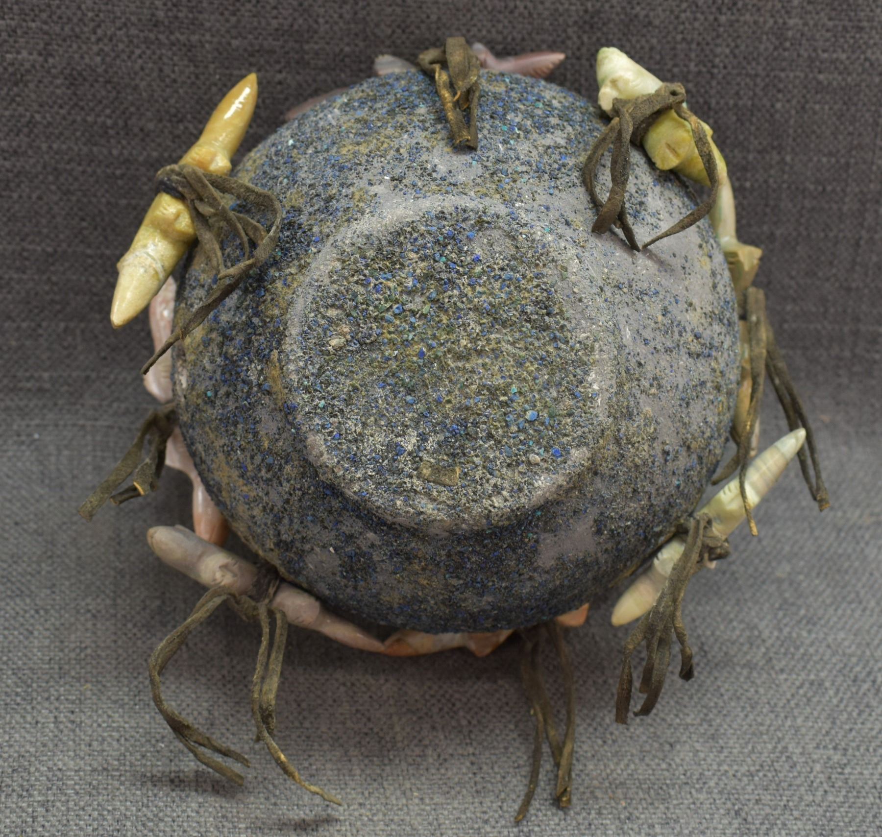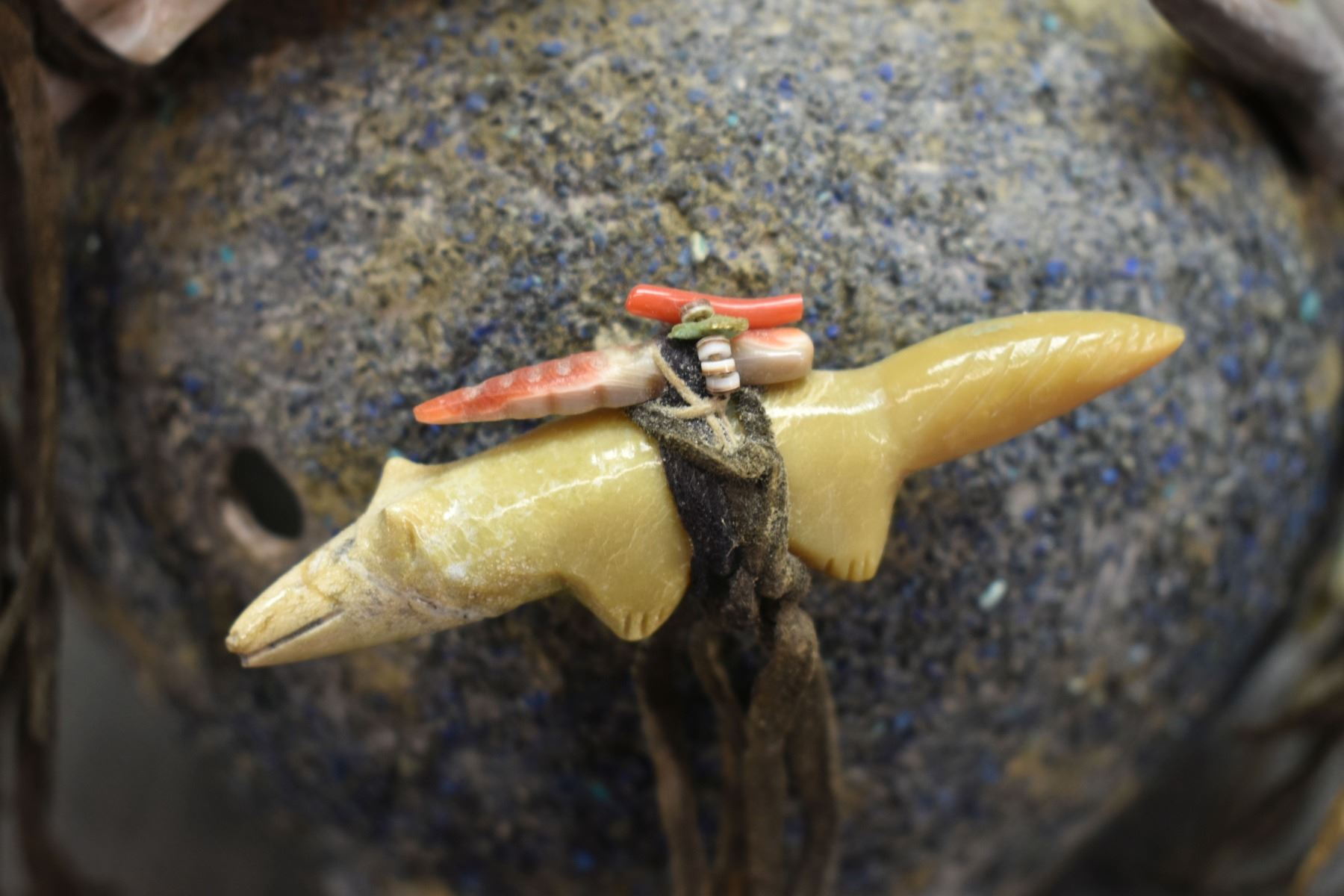 1970's Zuni fetish pots with 8 Hand carved fetish tied to the outside two on the in side by Edena Weahkee. 4.75" x 6"