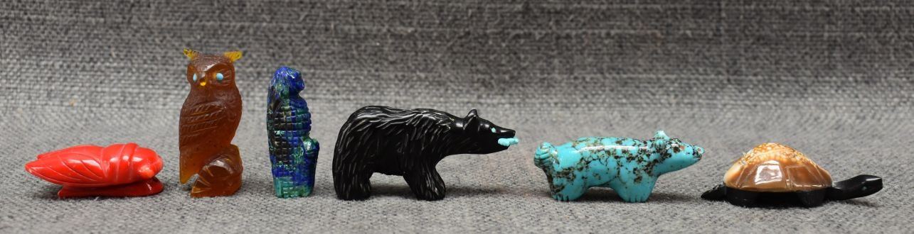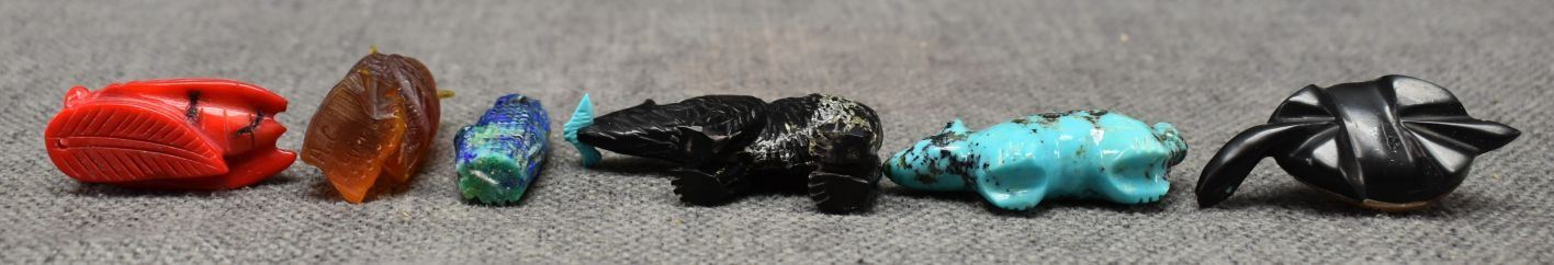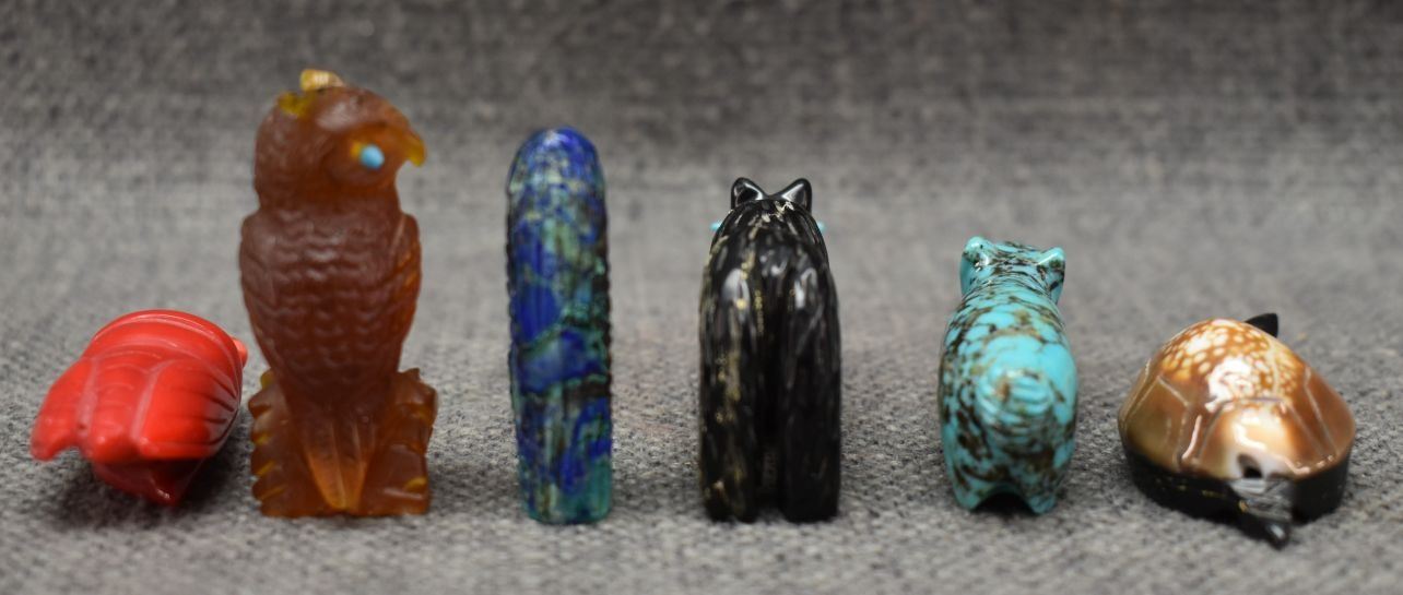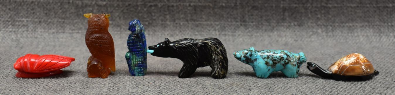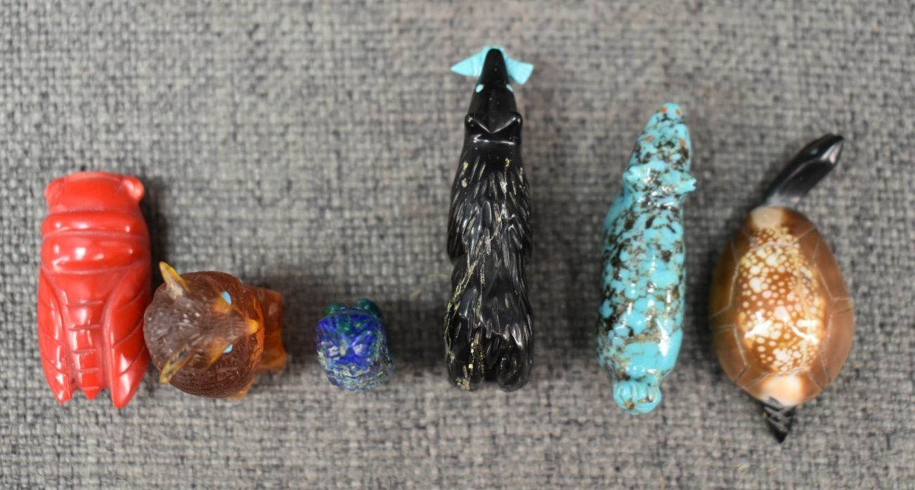 1990's Zuni hand carved shell turquoise and jet fetishes. Largest is 1'' x 2''