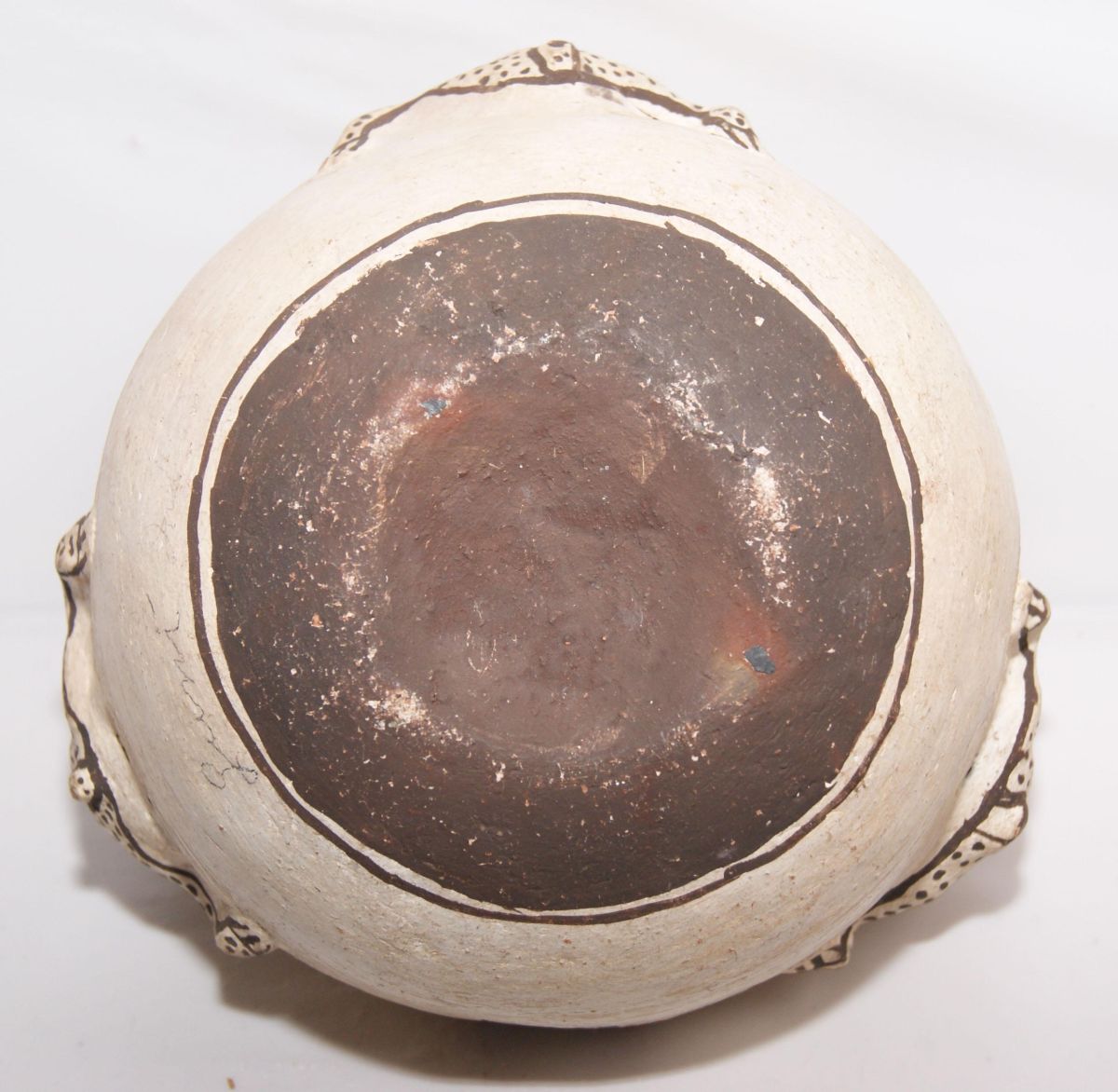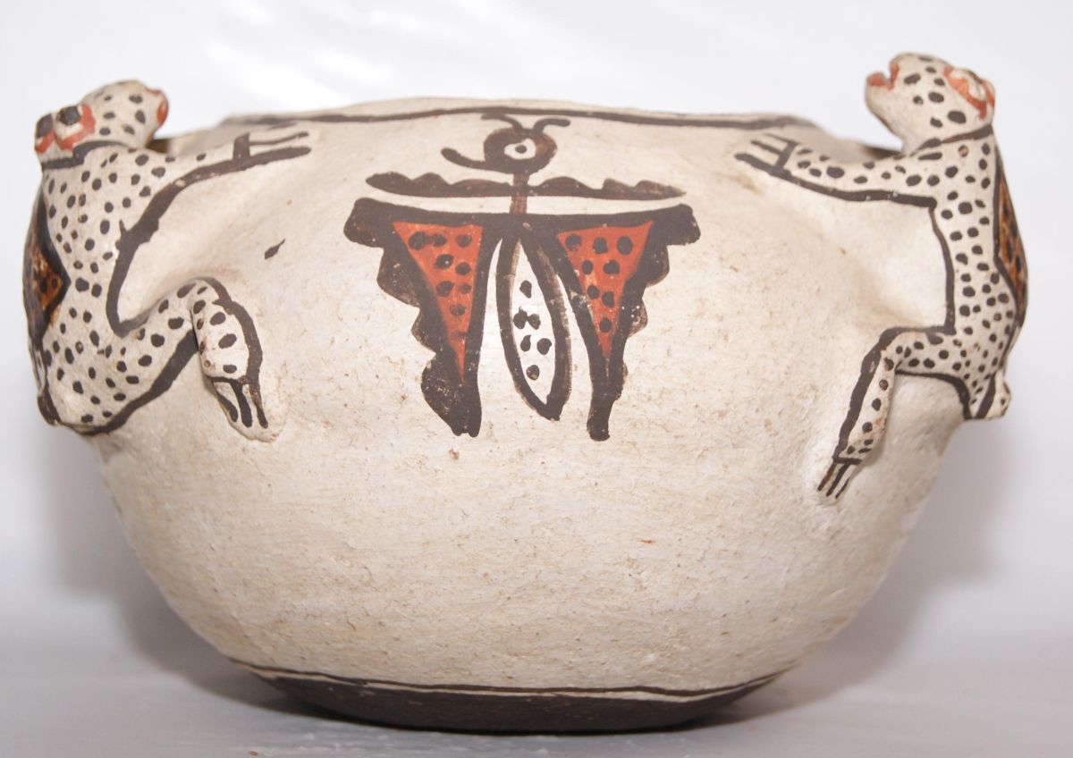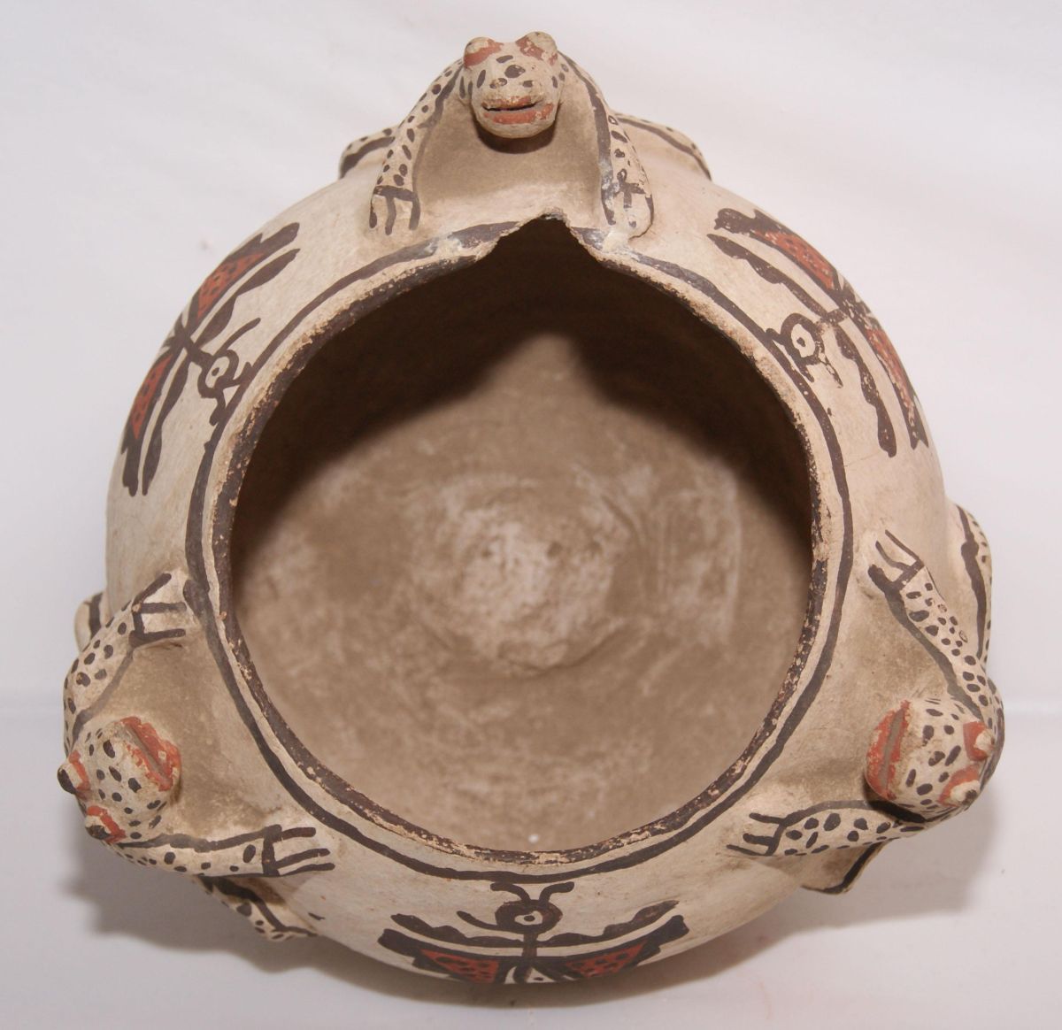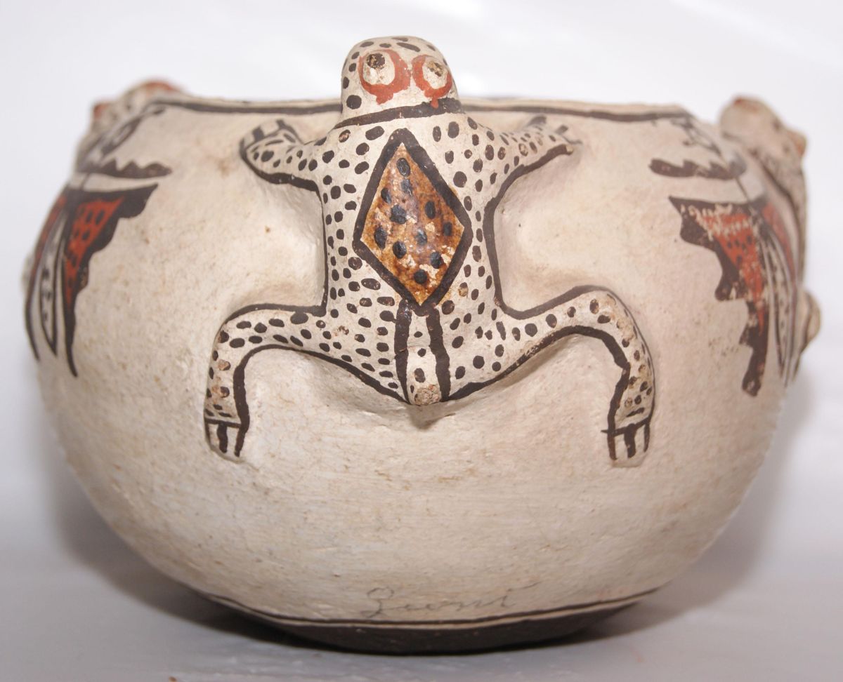 1940'S polychrome design with raised frogs, has chip on rim, 5" x 7"