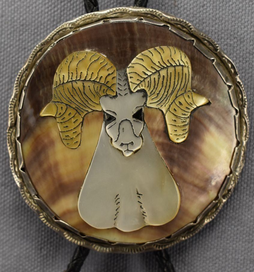 1970's Zuni Indian. Shell set in sterling silver depicting Ram, signed Effie Qualo.2.75'' dia total weight 55 grams'