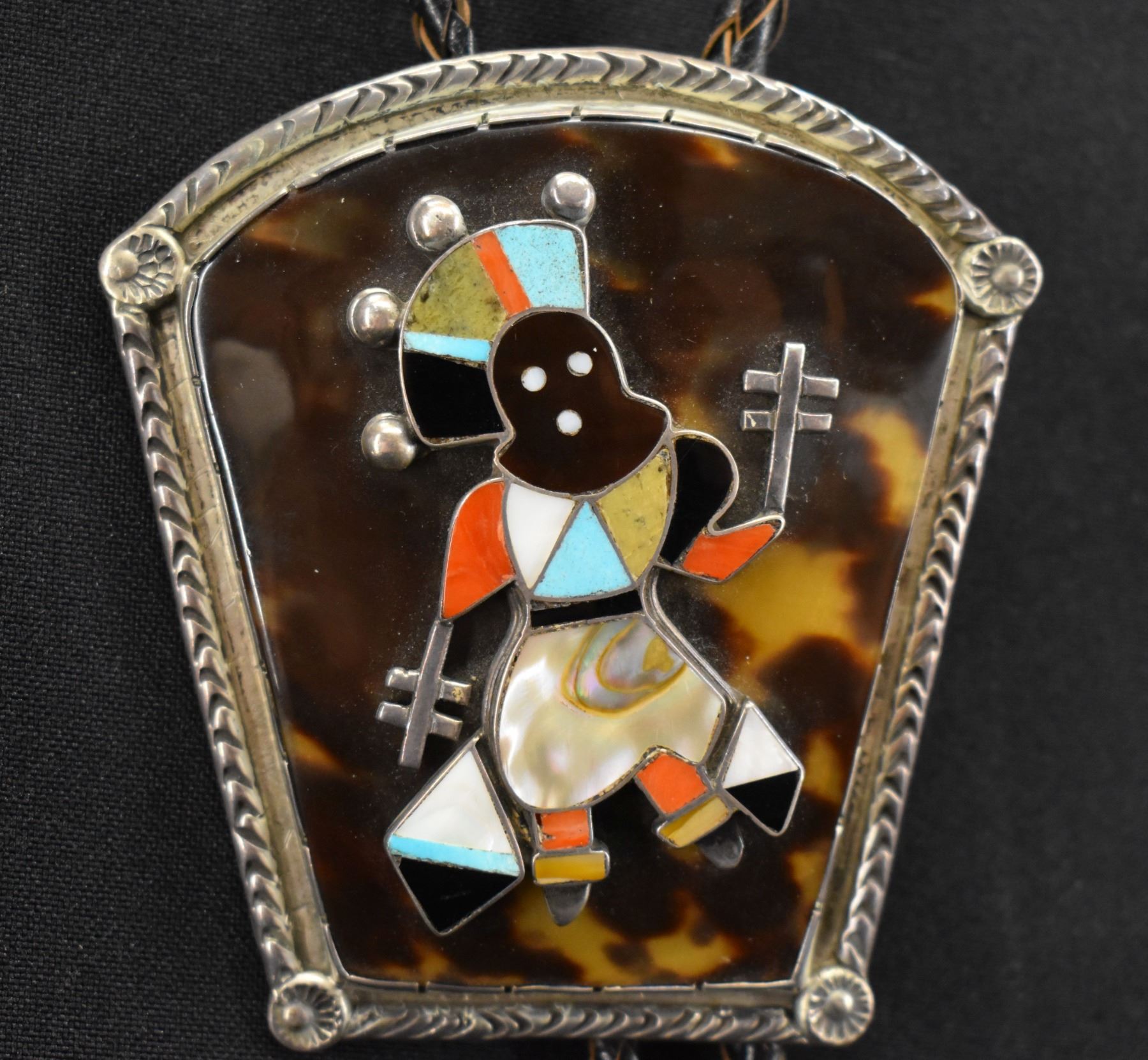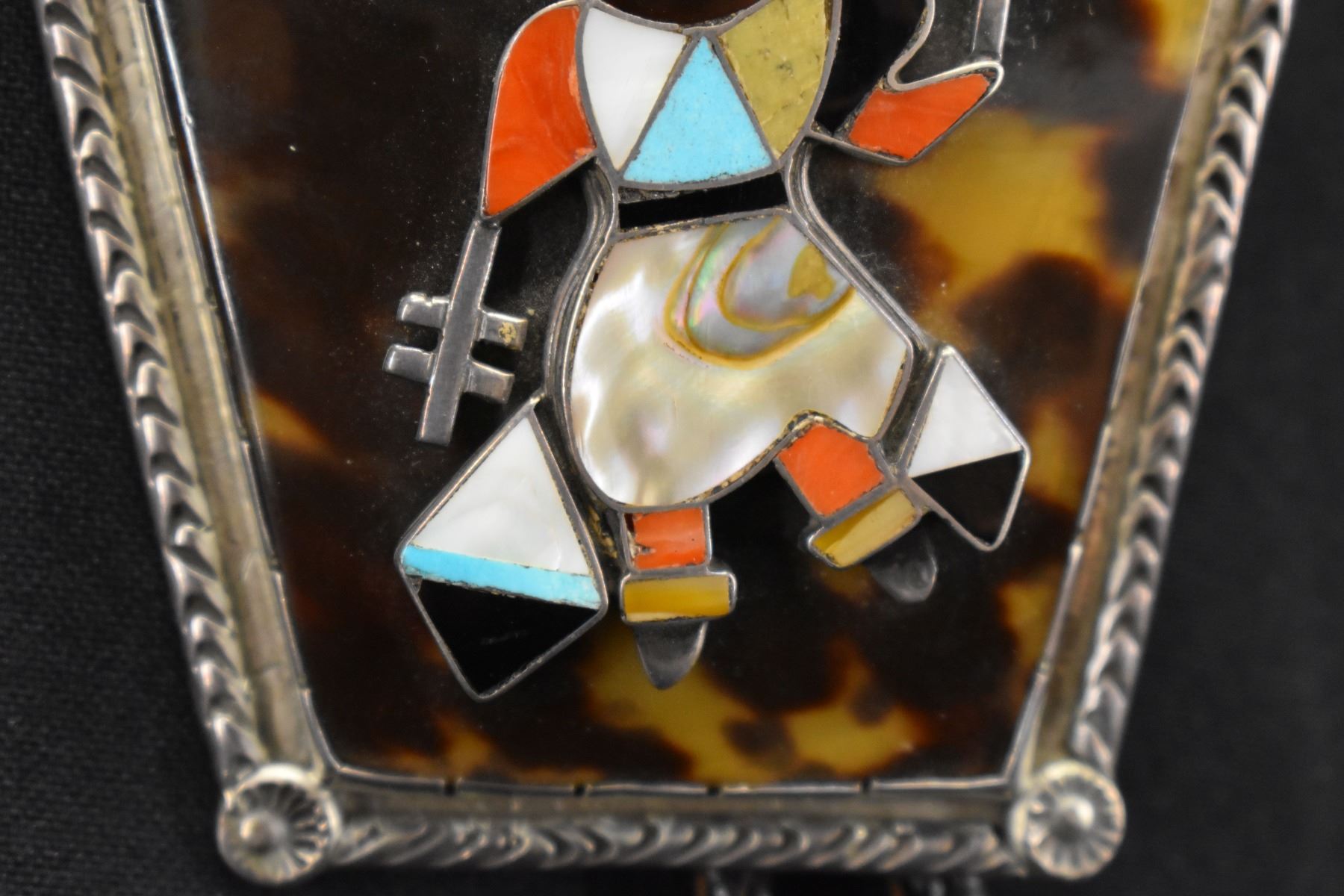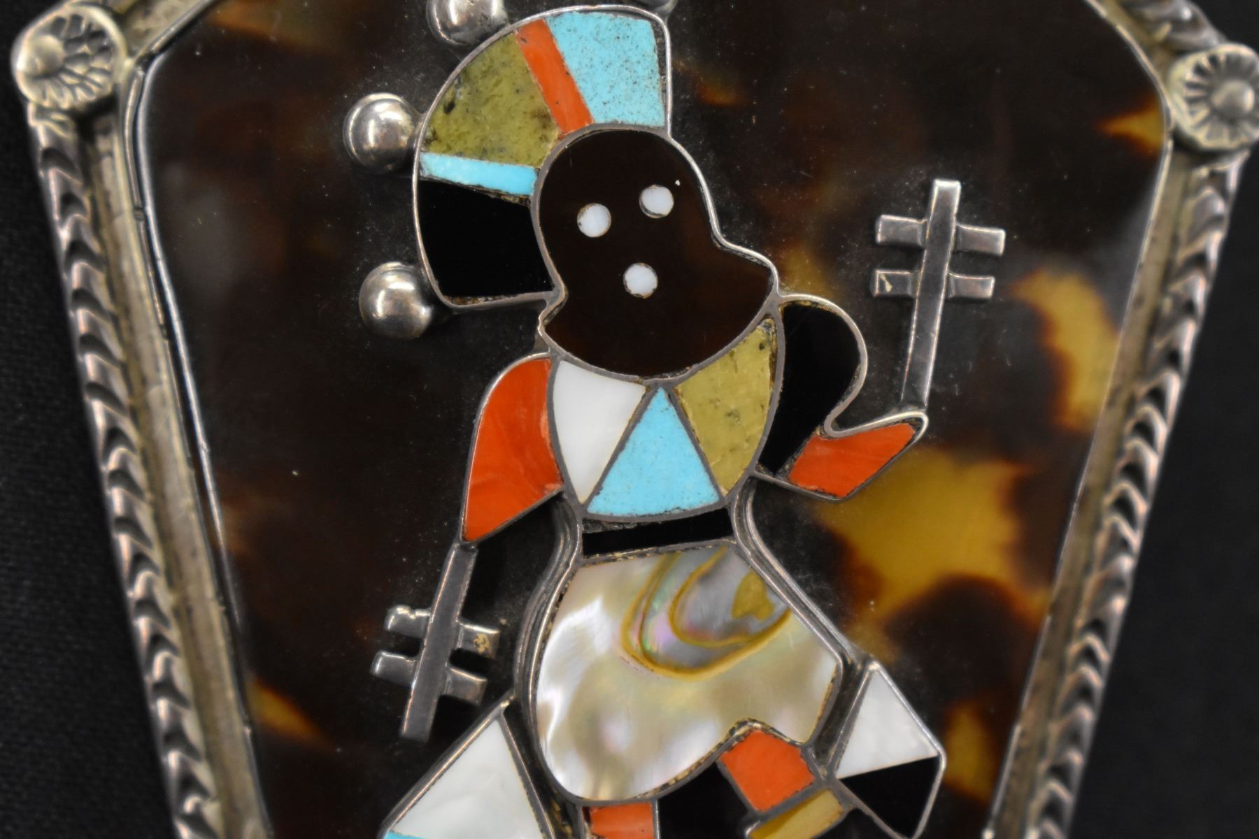 1970';s turquoise and shell set in sterling silver depicting Gan Dancer 3.25'' x 3'' unsigned. Total weight 74 grams