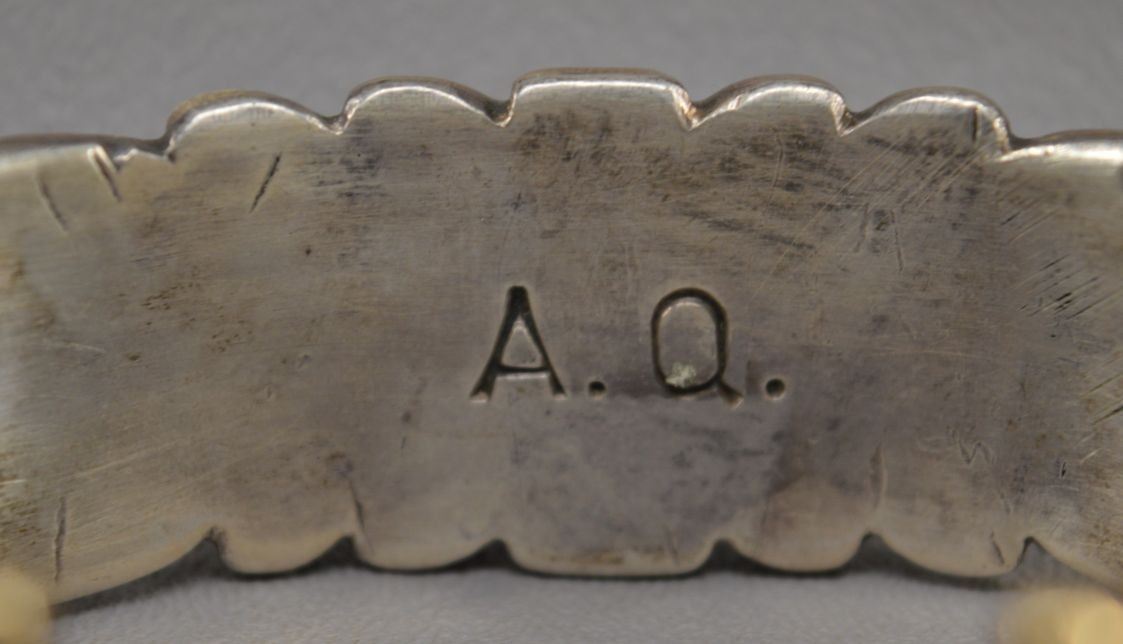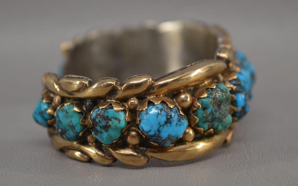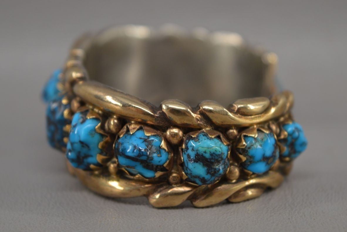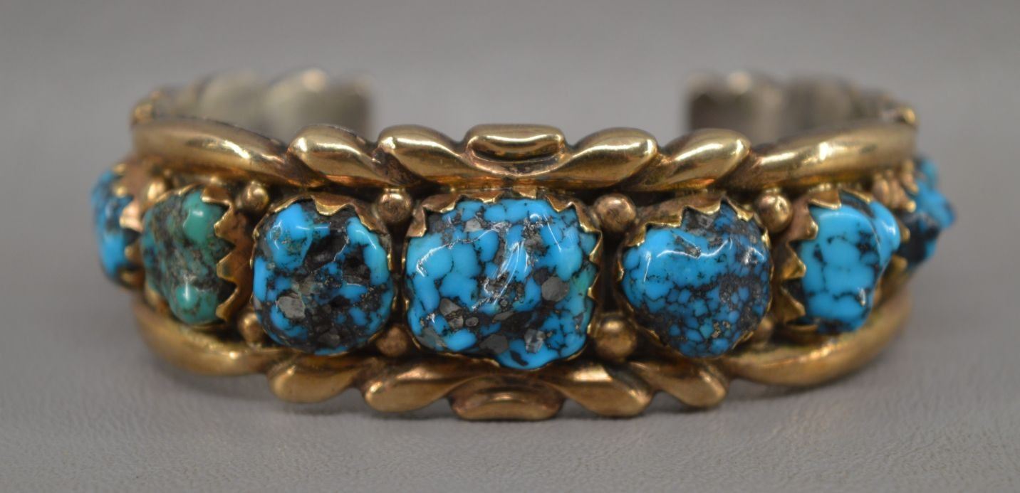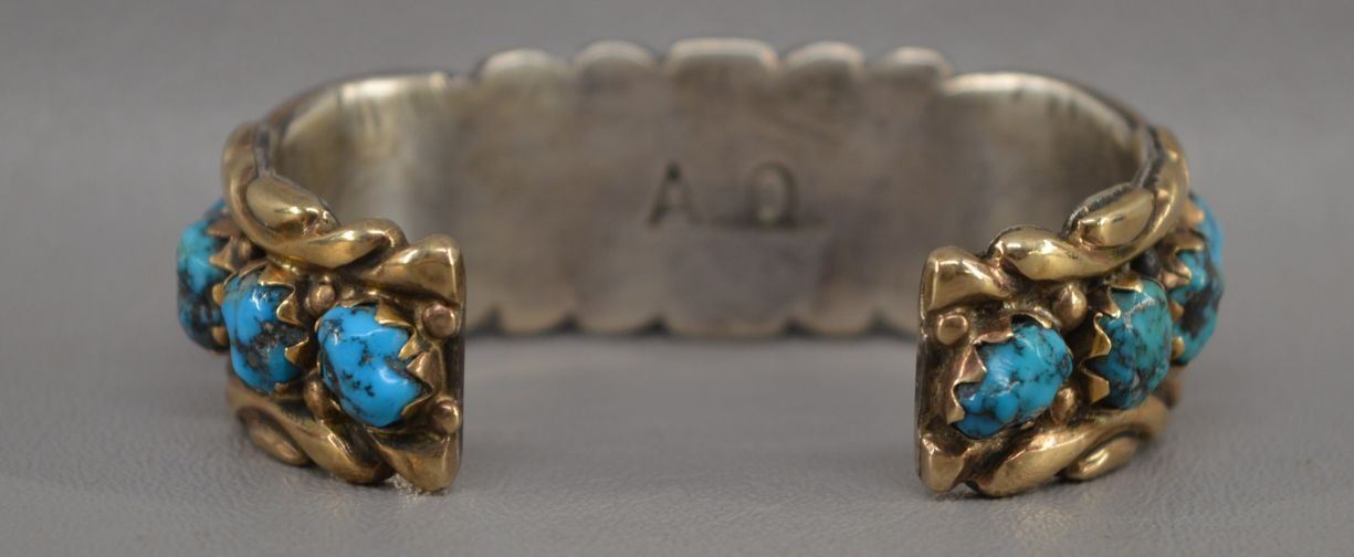 1970's Zuni Indian. Sterling silver turquoise and Gold, 1'' x 5.5'' x 1.25'' signed AQ for Alice Quam, total weight 98 grams