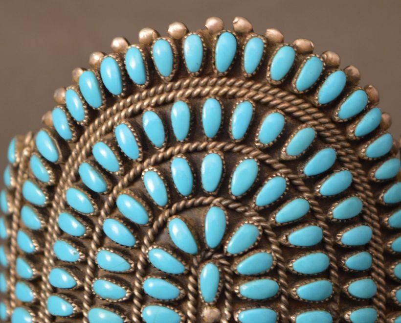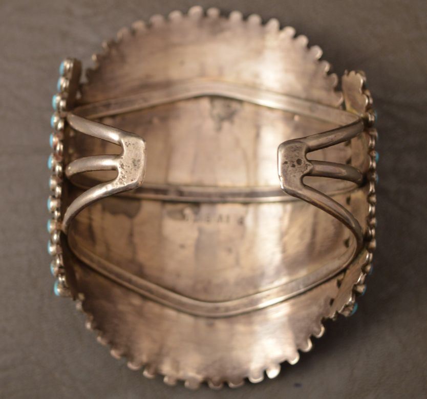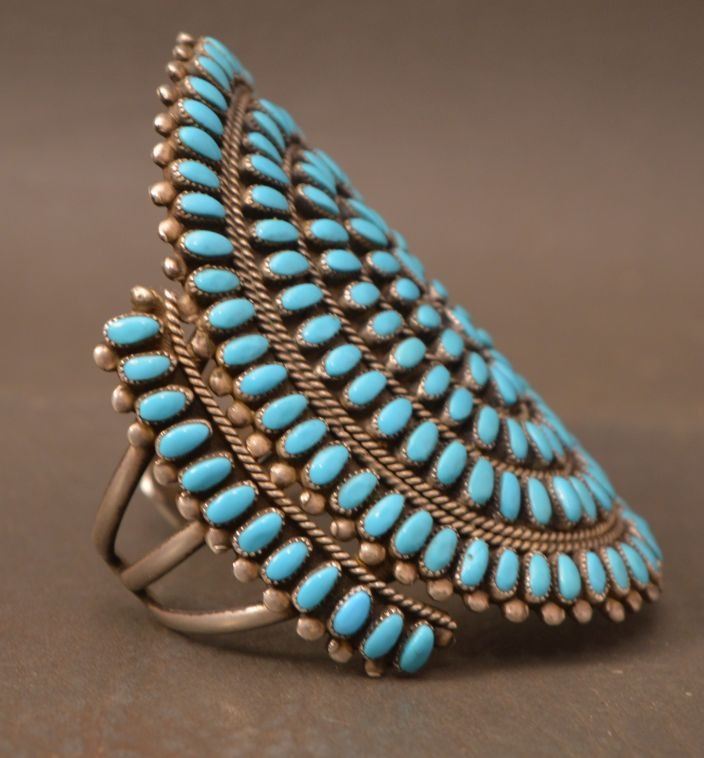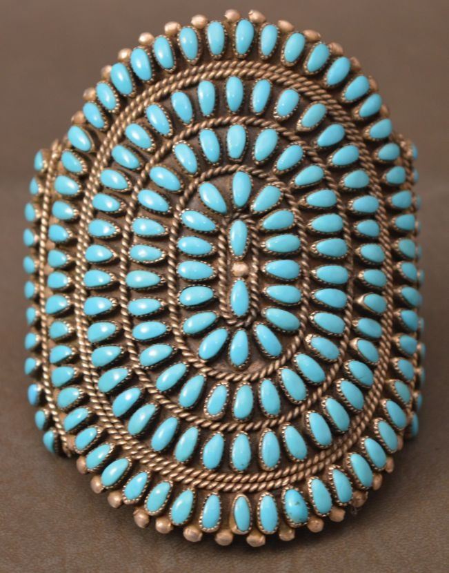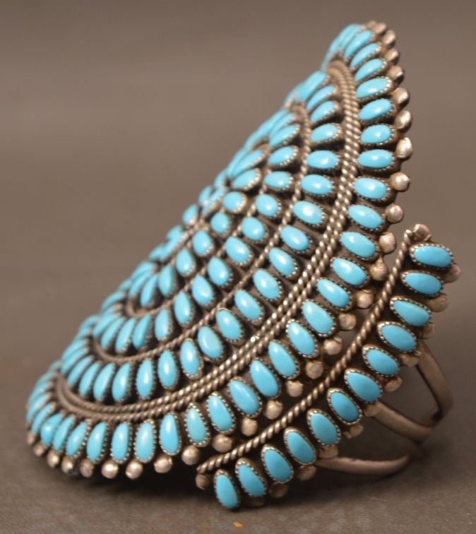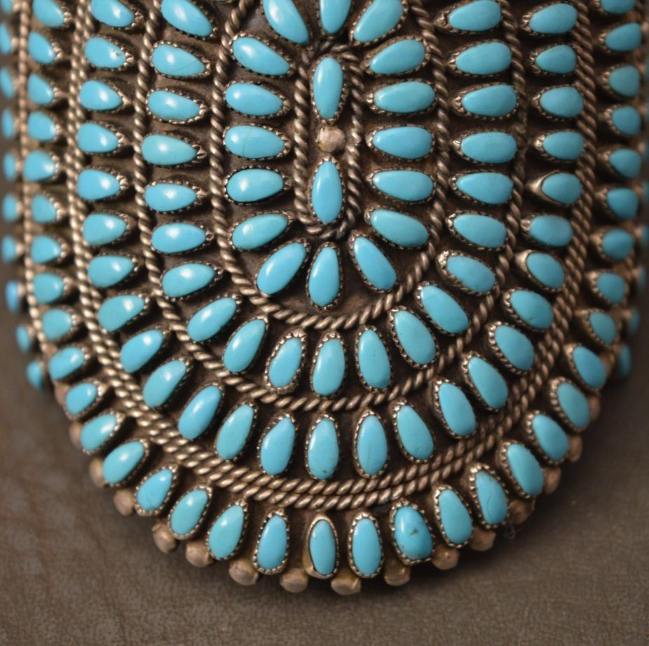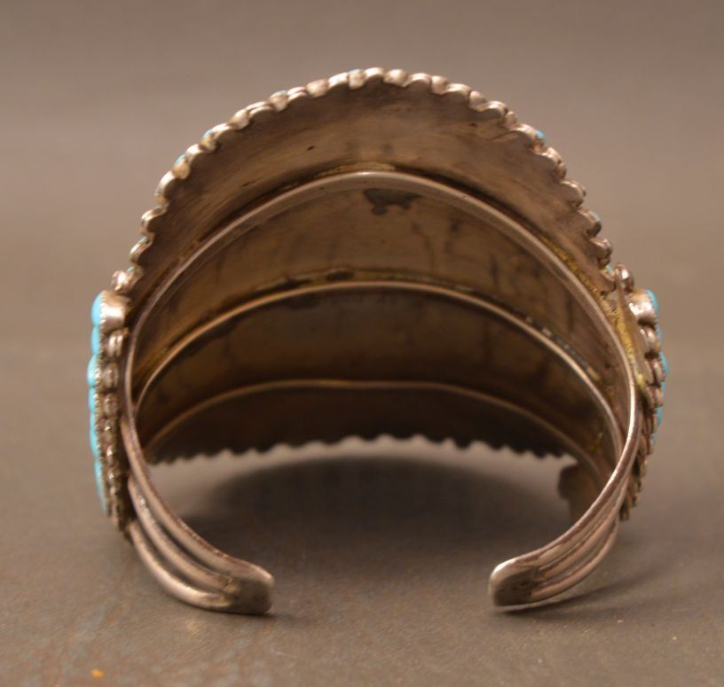 1970's Zuni Indian. Sterling silver and turquoise petit point bracelet 3.5'' x 5.25'' x 1'' signed P.V. By Joe. Total weight 87 grams