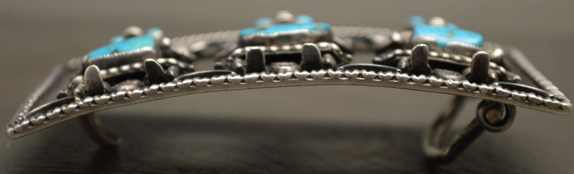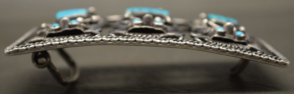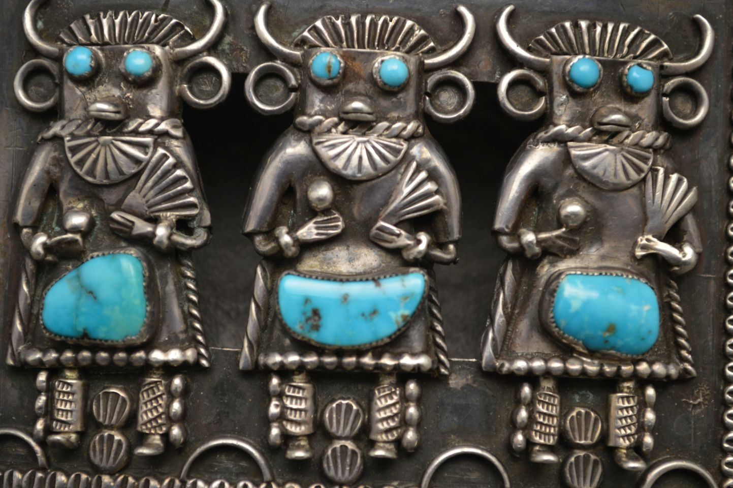 1980's Zuni Indian, sterling silver and turquoise design depicting kachinas, 2.5'' x 3.5'' made for 1'' belt total weight 104 grams