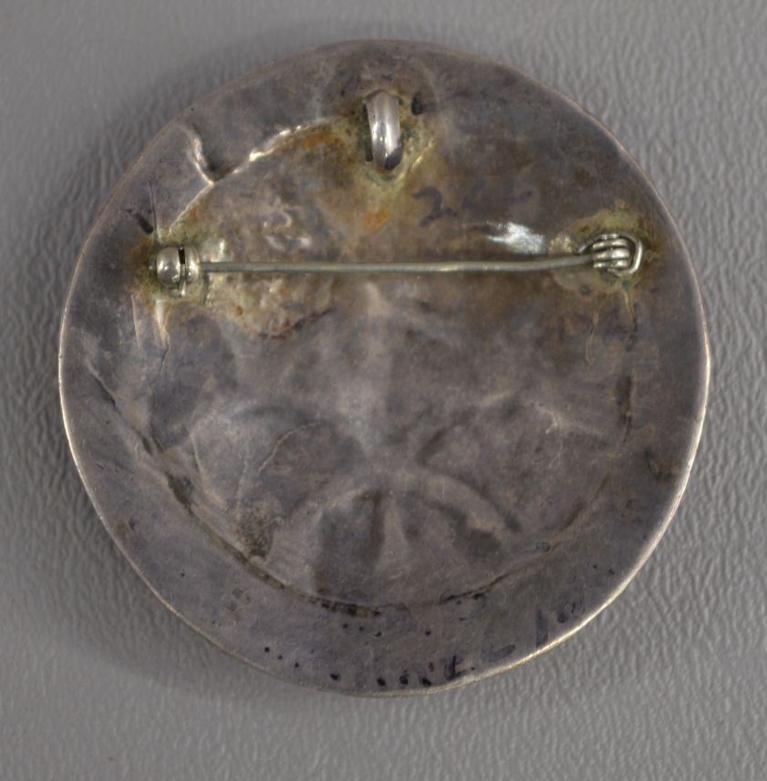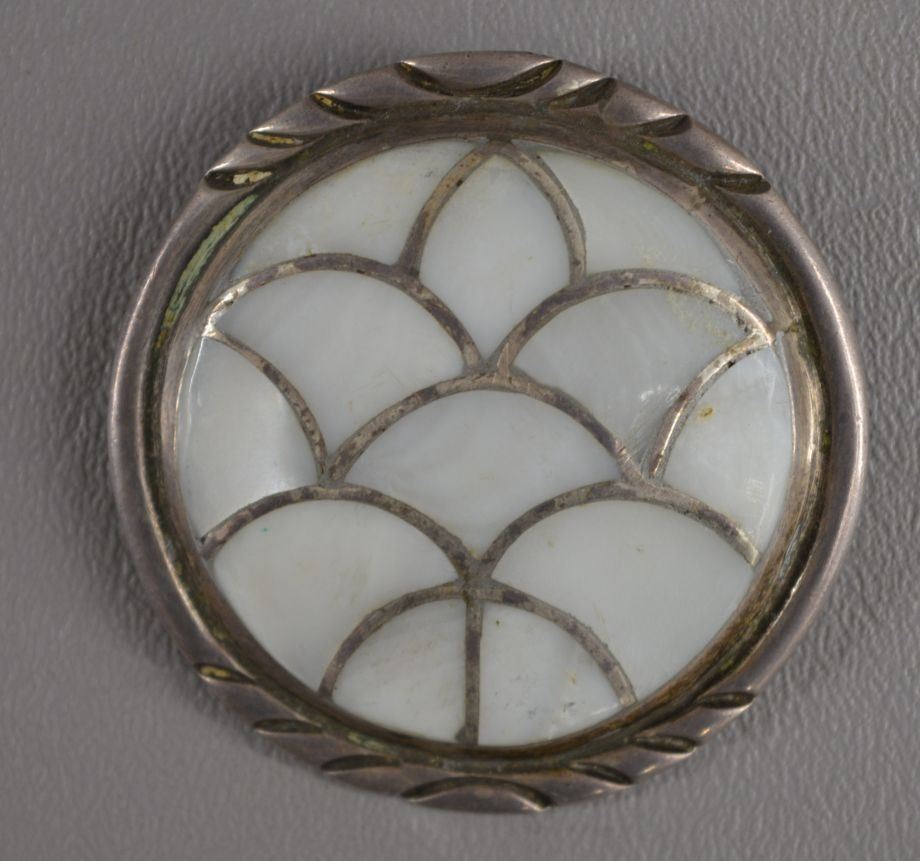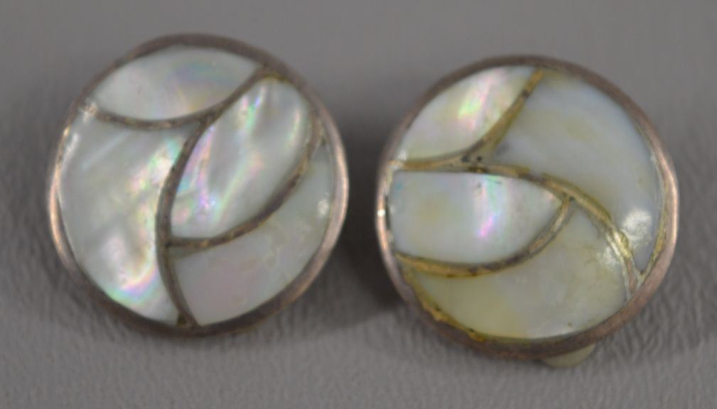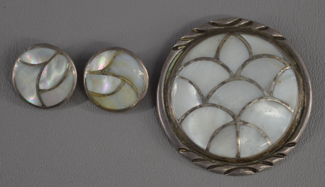 1970's Zuni Indian. Mother of pearl set in sterling silver pin/pendent, 2'' dia and matching earrings. Total weight 40 grams