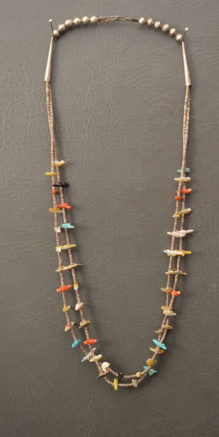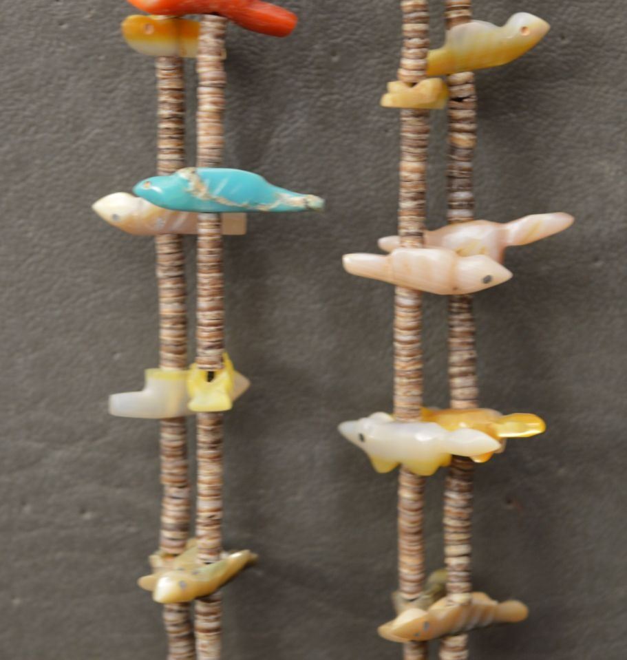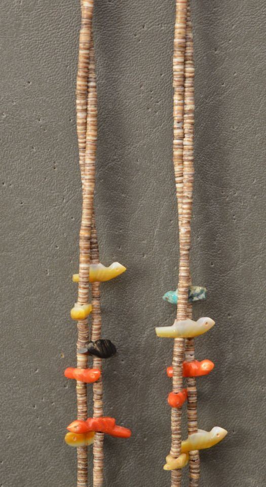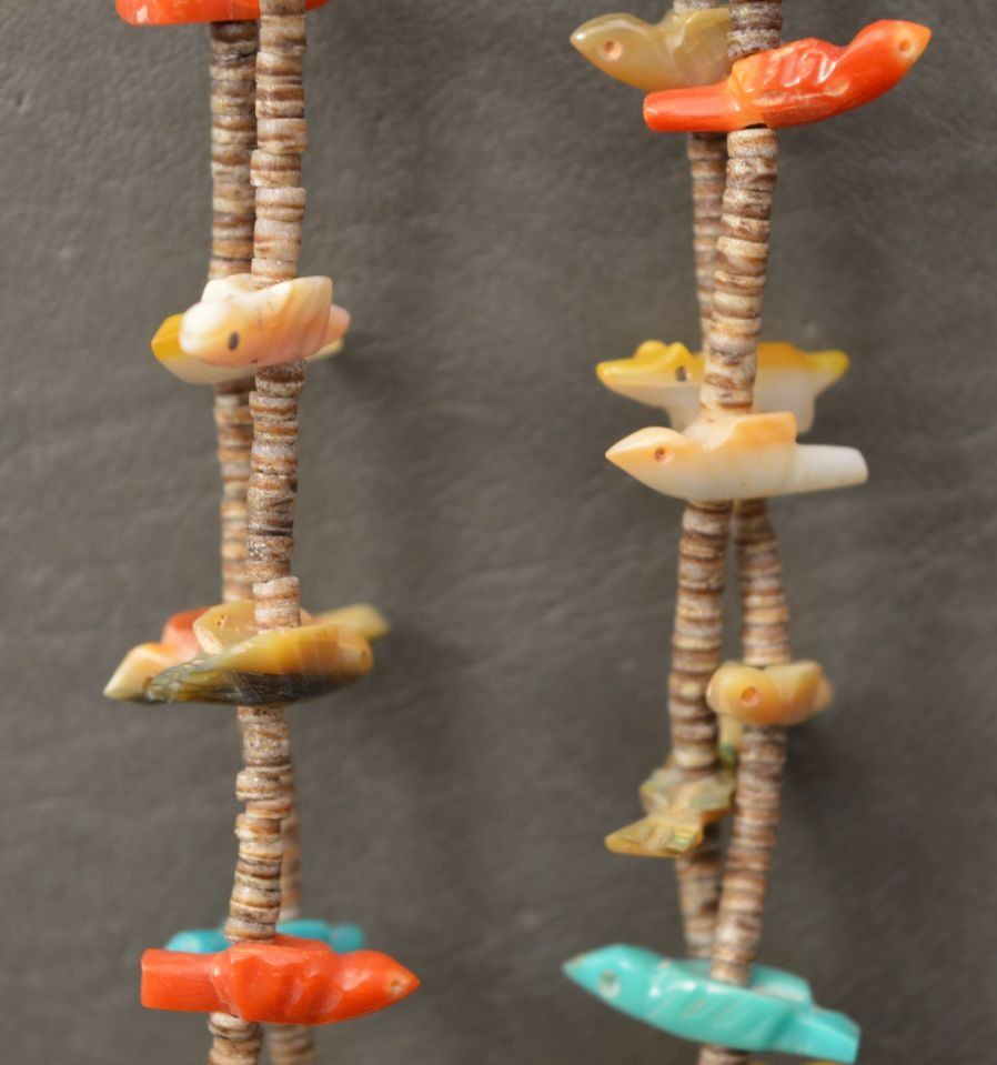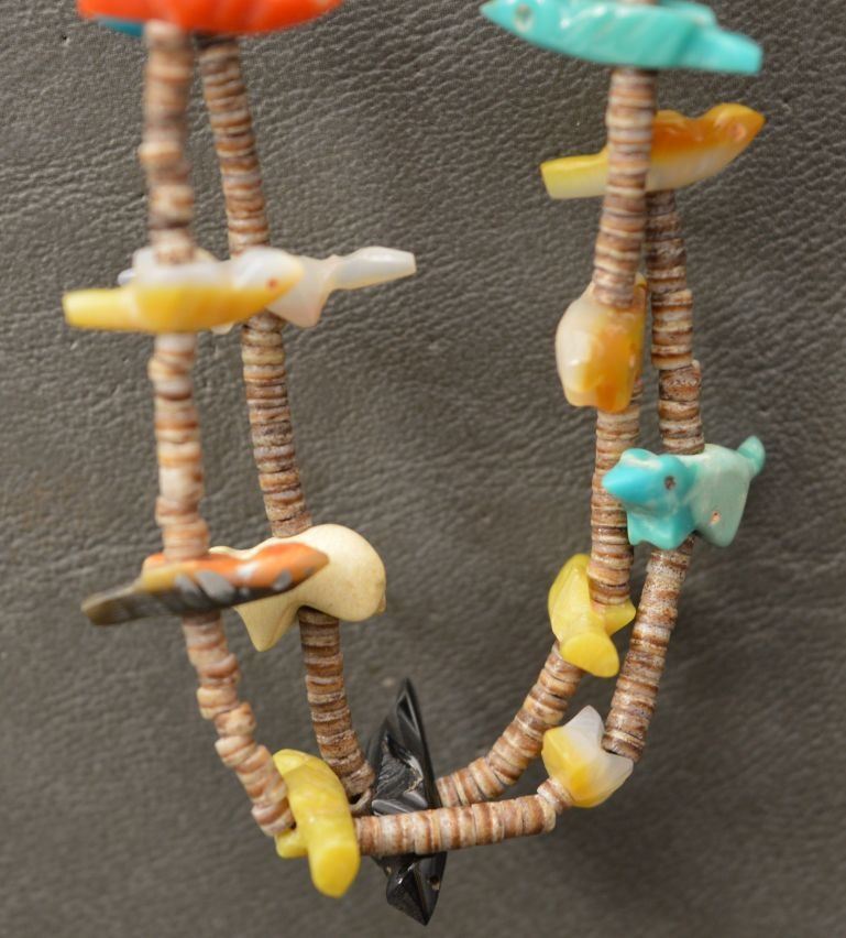 1970's Zuni Indian. Two strand carved turquoise and shell fetishes inter spaced with shell heishe. 32'' long