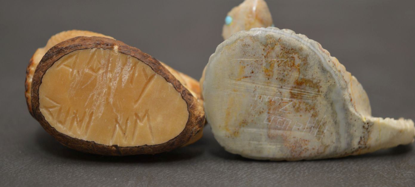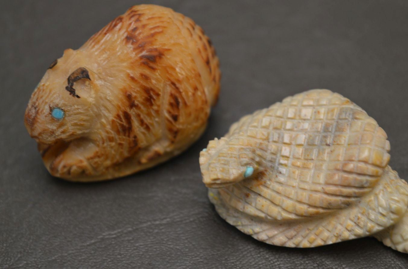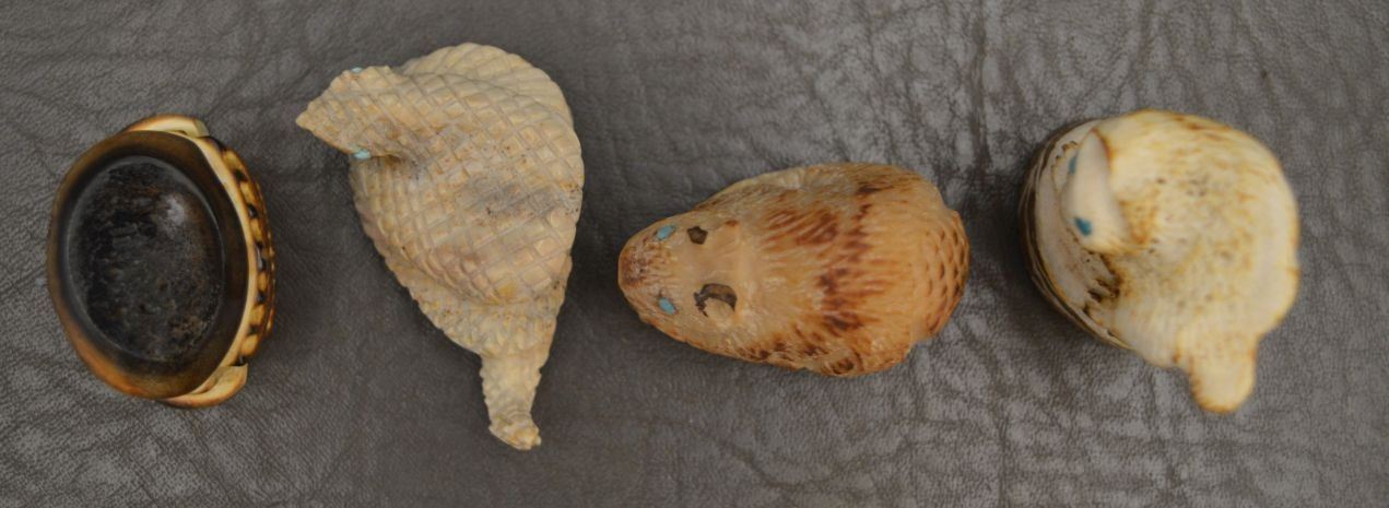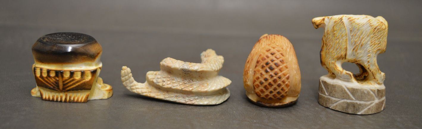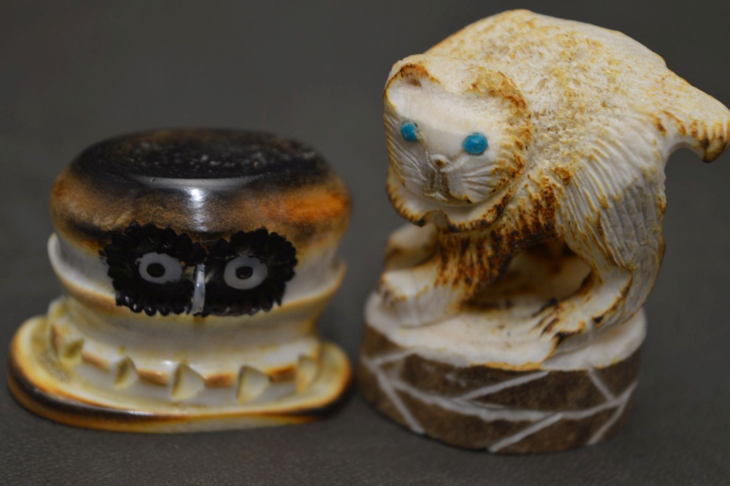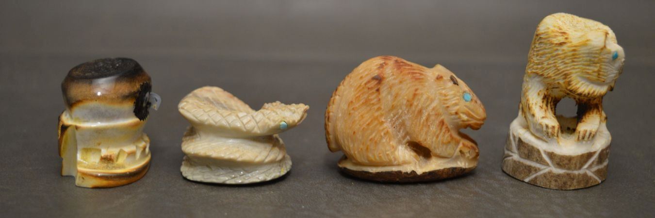1990's Zuni Indian, Tagua nut mouse 1.25'' x 1.75'' by Albert Lamy, antler owl 1.25'' 1.5'' by Craig Haloo, antler bobcat 1.5'' x 1.25'' by Avriel Lamy, marble snake .75'' x 2'' by Rami Haloo