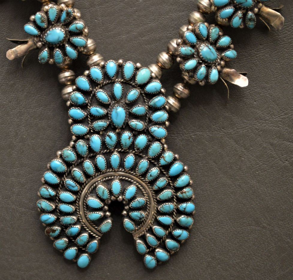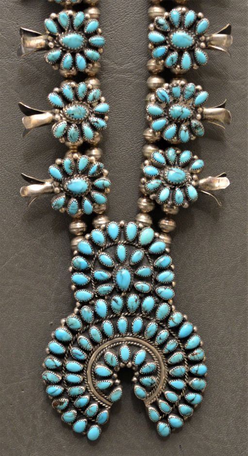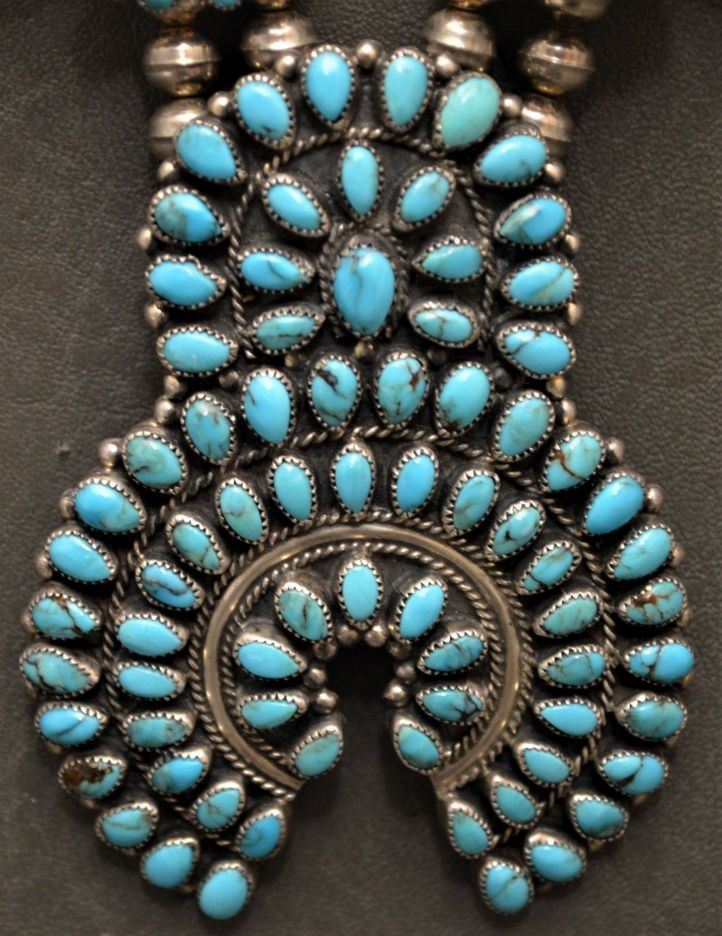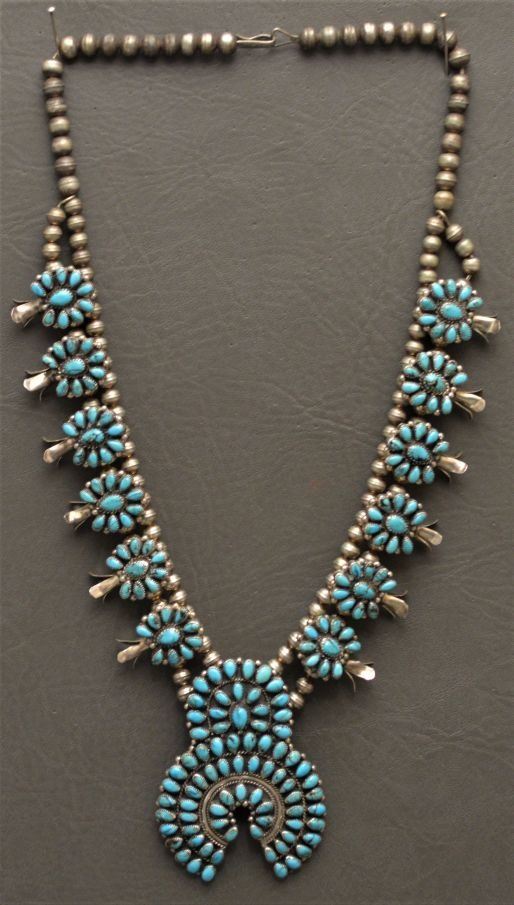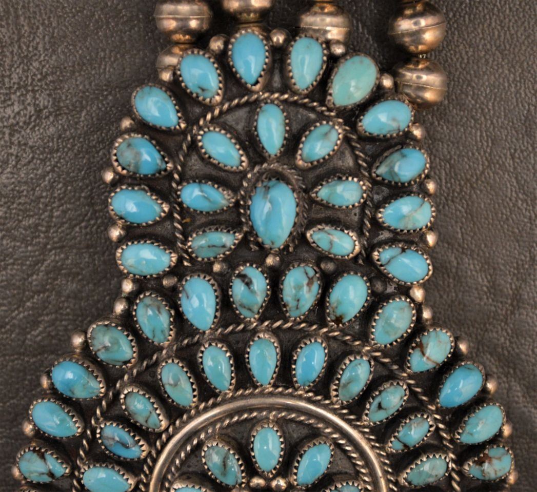 1980's Zuni Indian. Sterling silver an turquoise necklace 26'' long and matching naja 3.5'' x 2.5'' total weight 180 grams