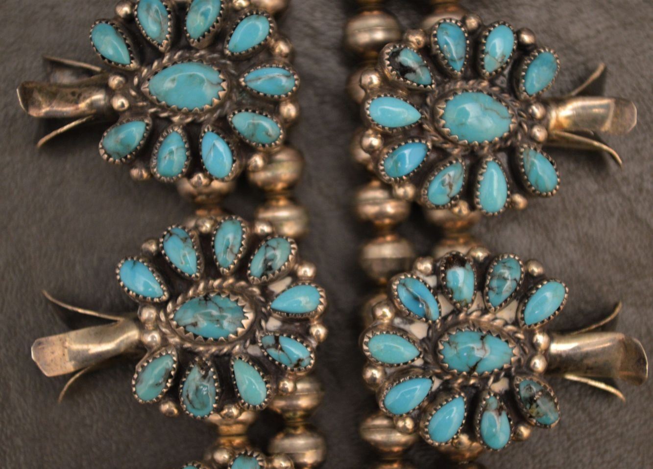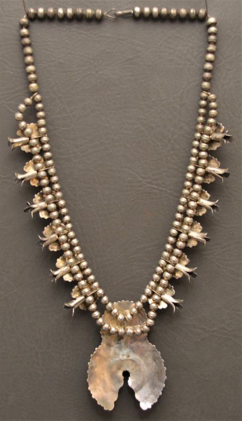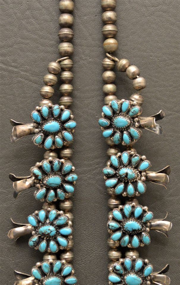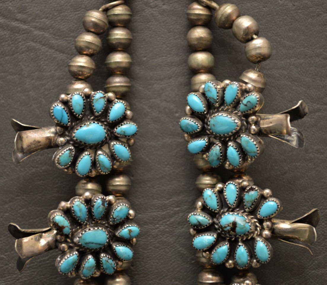 1980's Zuni Indian. Sterling silver an turquoise necklace 26'' long and matching naja 3.5'' x 2.5'' total weight 180 grams