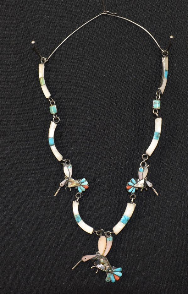 1960's Zuni Indian, sterling silver turquoise and shell hummingbird necklace18'' long . Total weight 35 grams