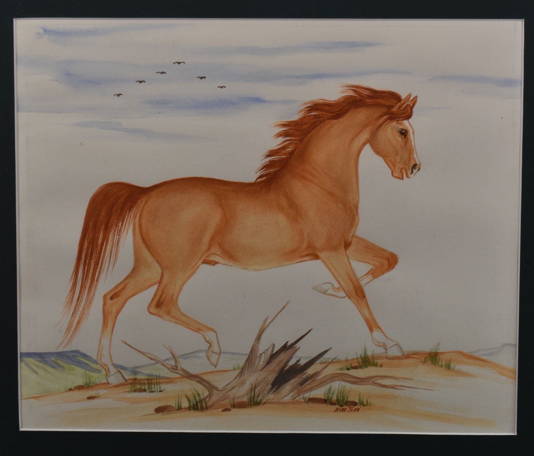 1970's Zuni Indian. Original on paper depicting Horse, signed Kai-sa. 11'' x 14'' frame size 16'' x 18''
