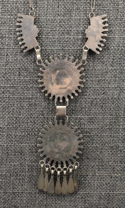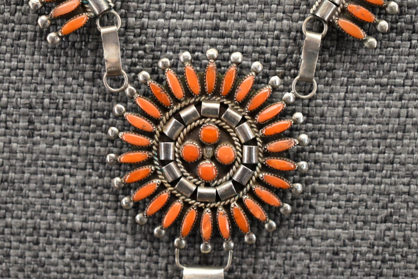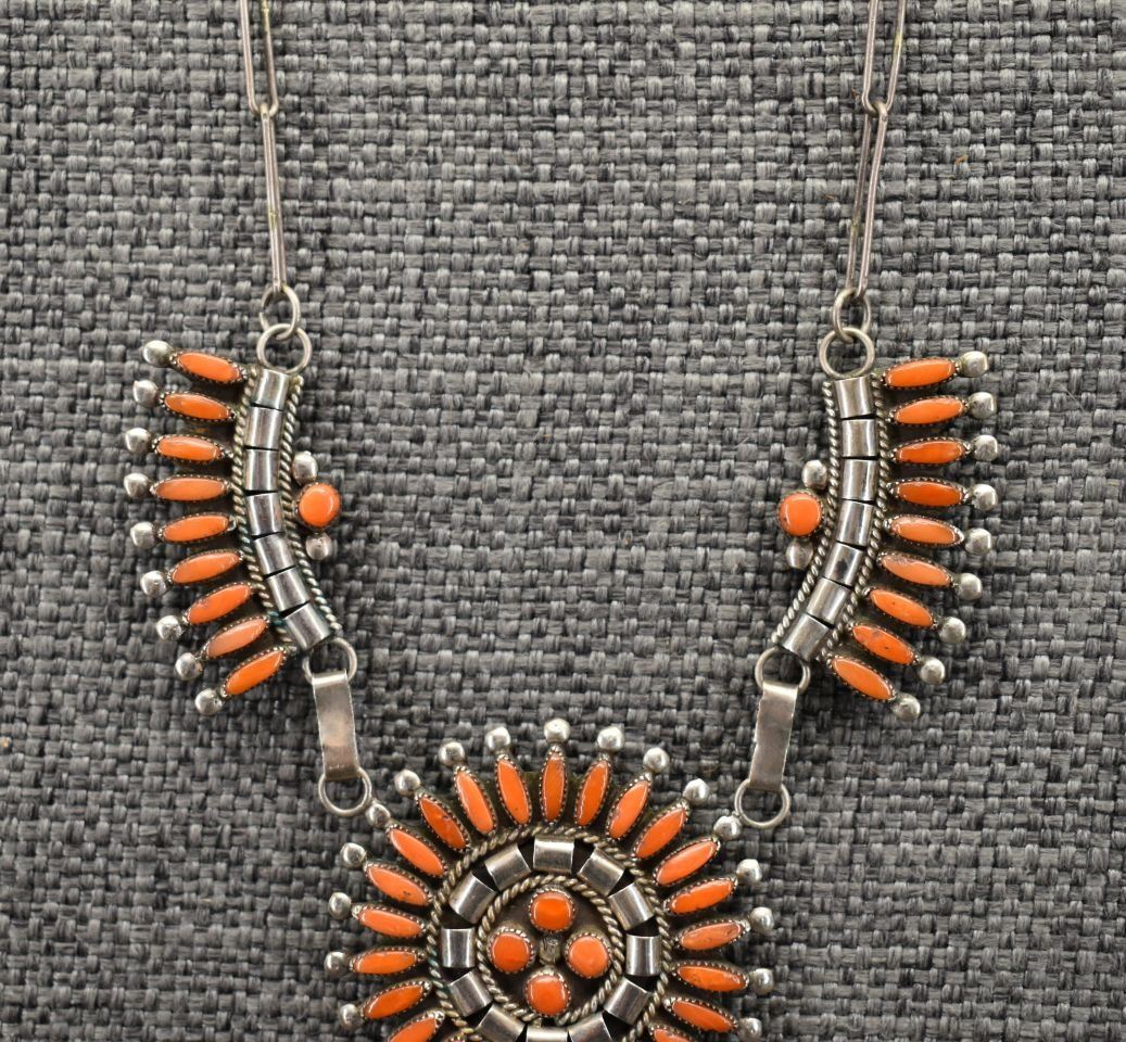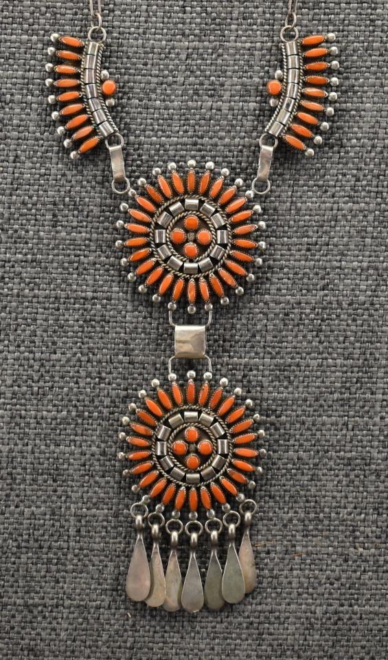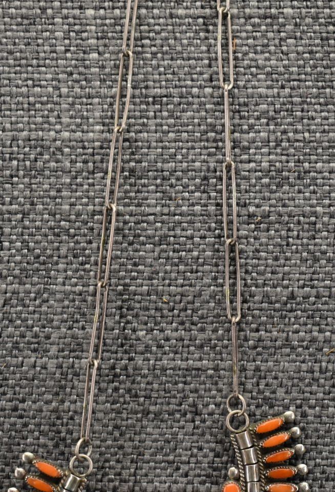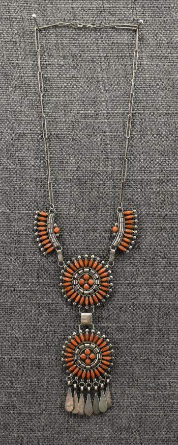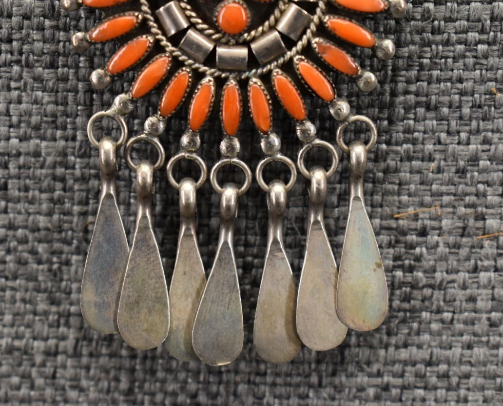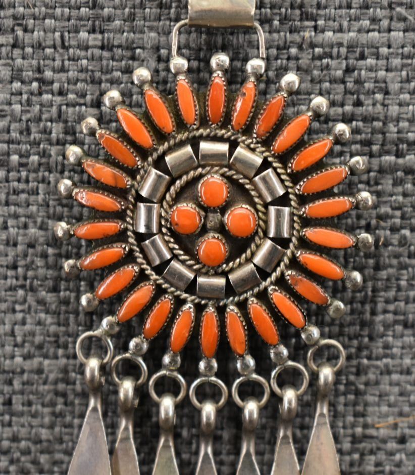 1970-80's Zuni, sterling silver and petit point coral design, 18" long pendants 1.75" diameter x 4.75". Total weight 34 grams