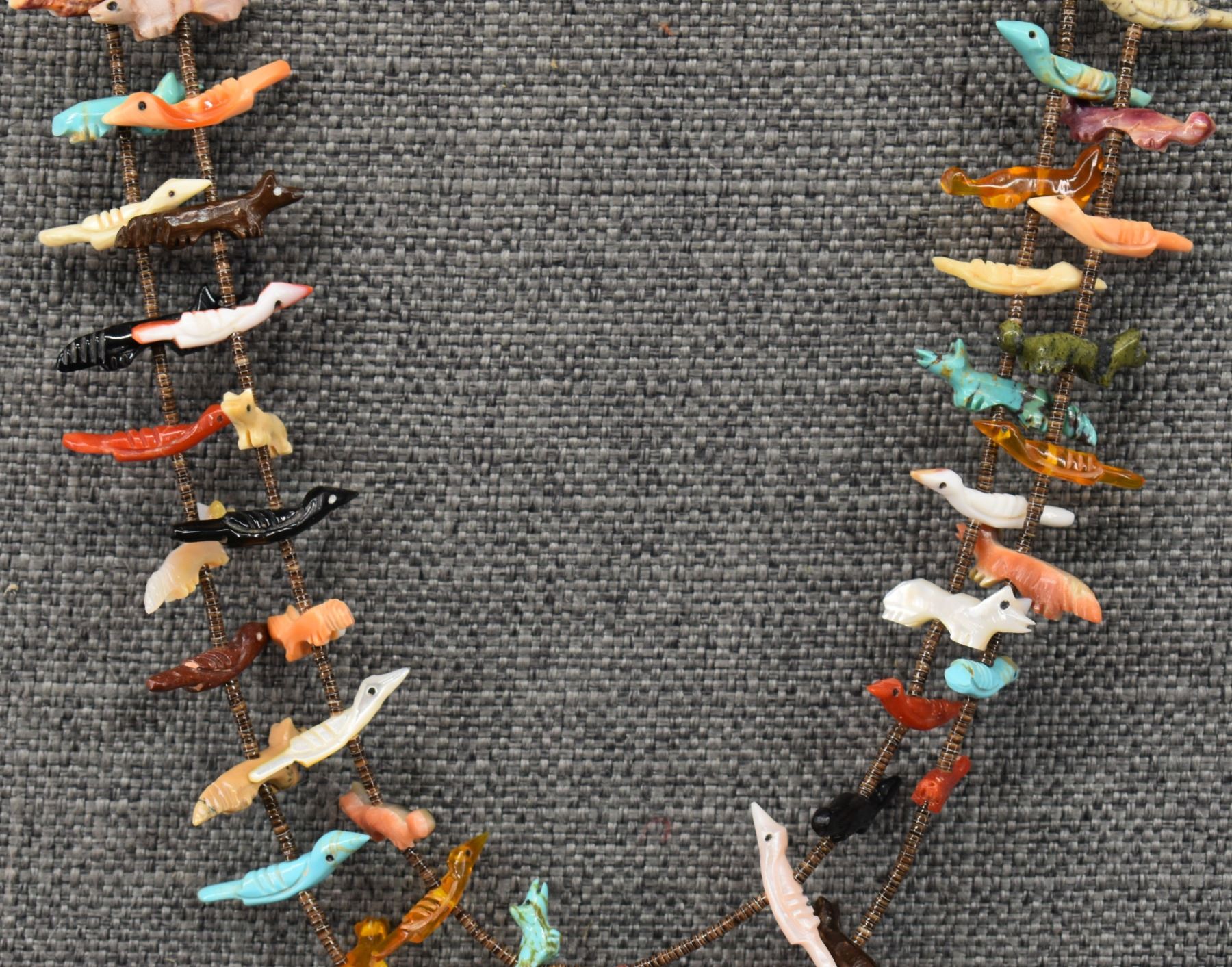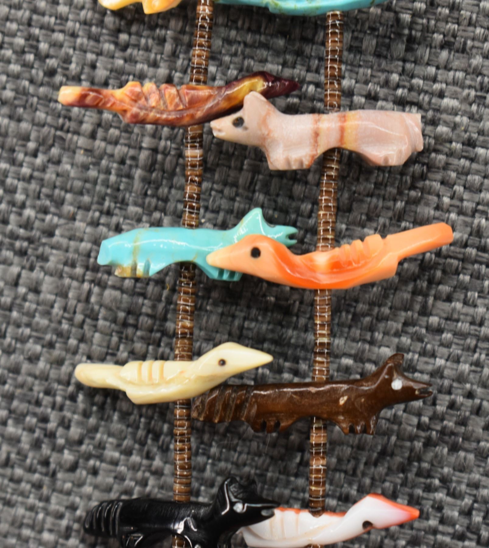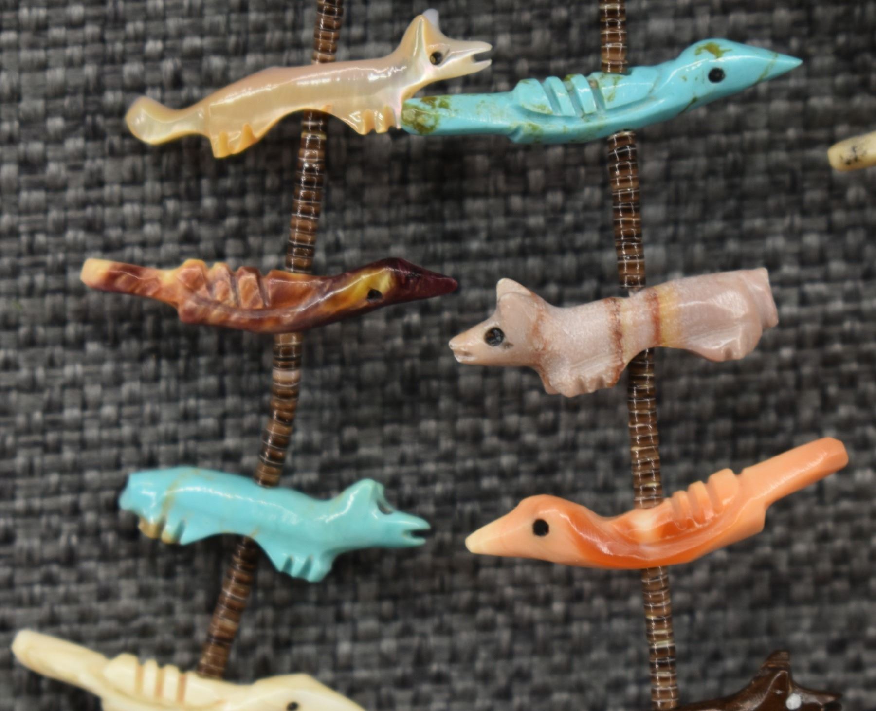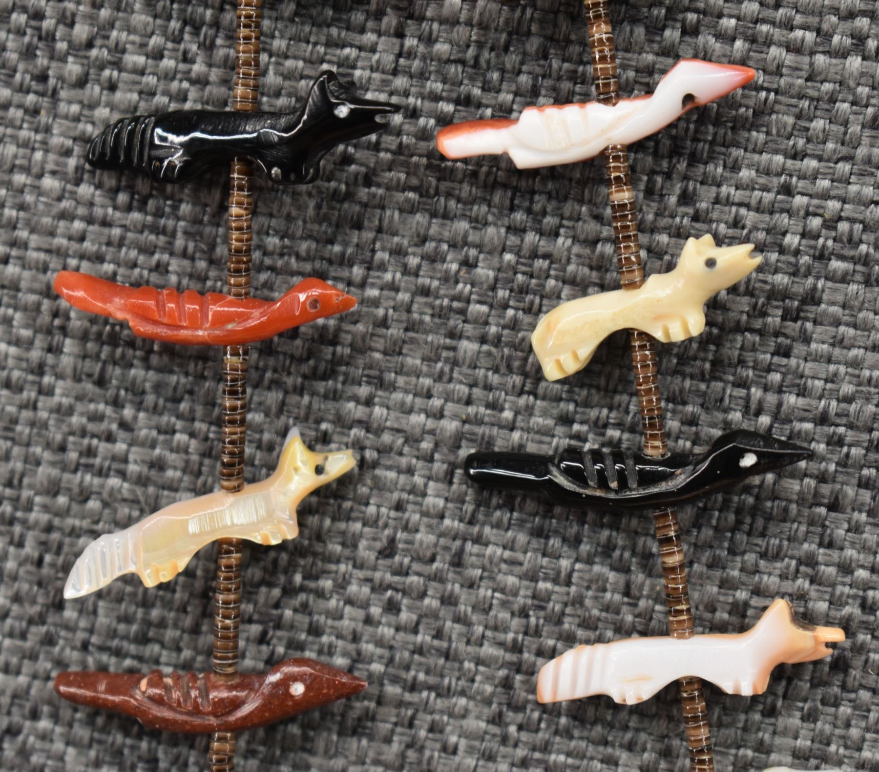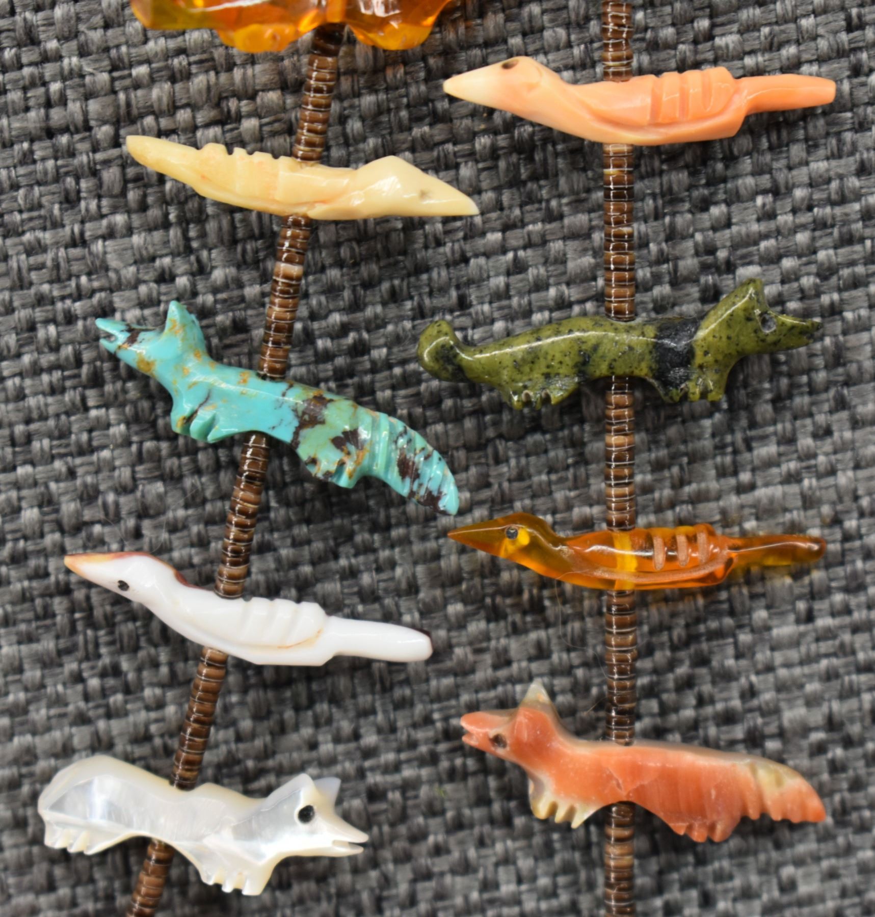 1990's Zuni, two strands of shell heishi with carved turquoise, coral jet, shell and stone animal fetishes signed L/L Kaskalla 27" long