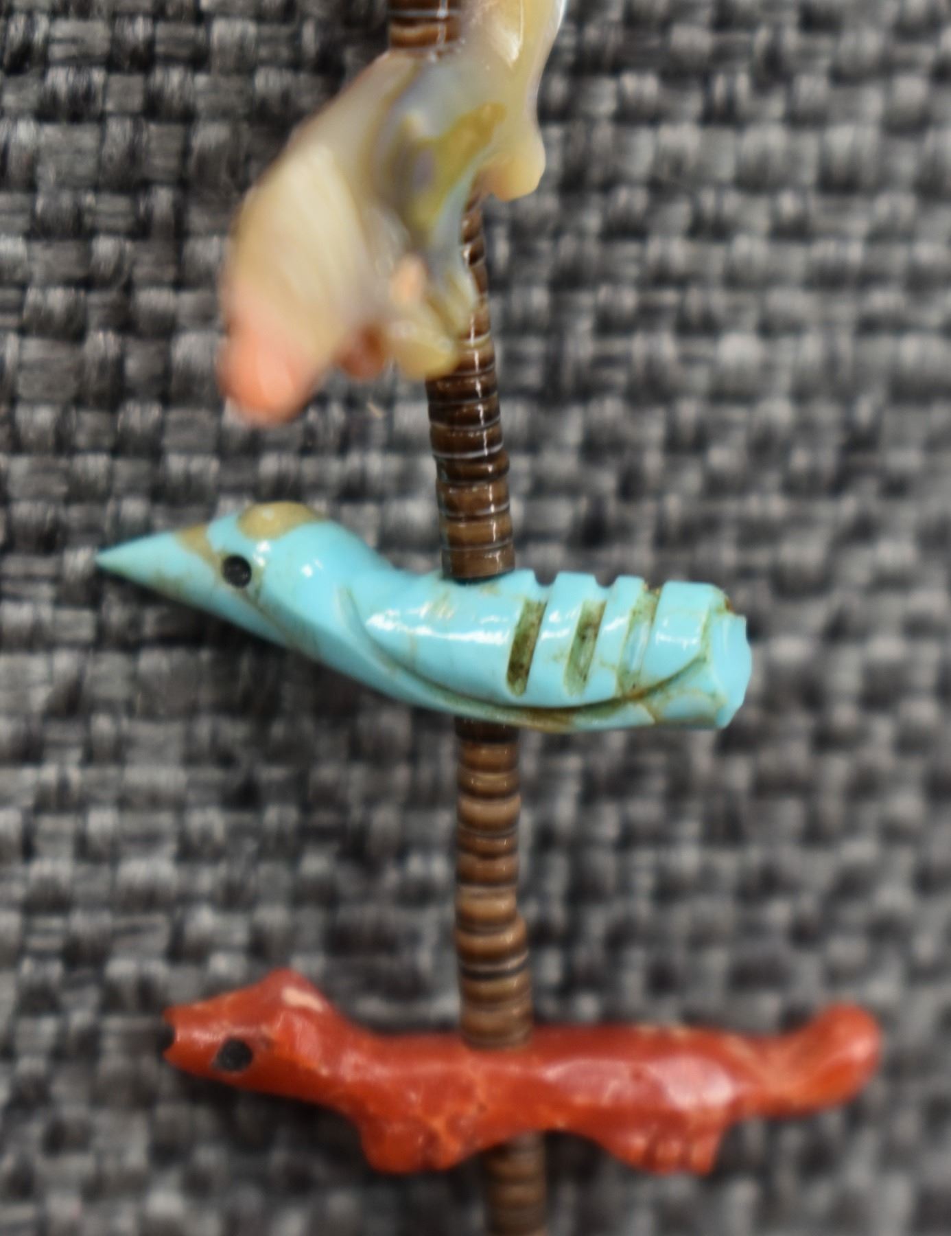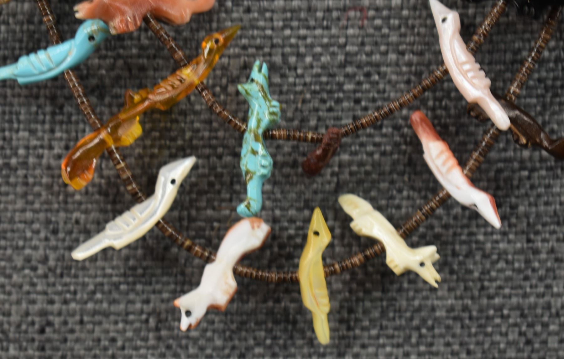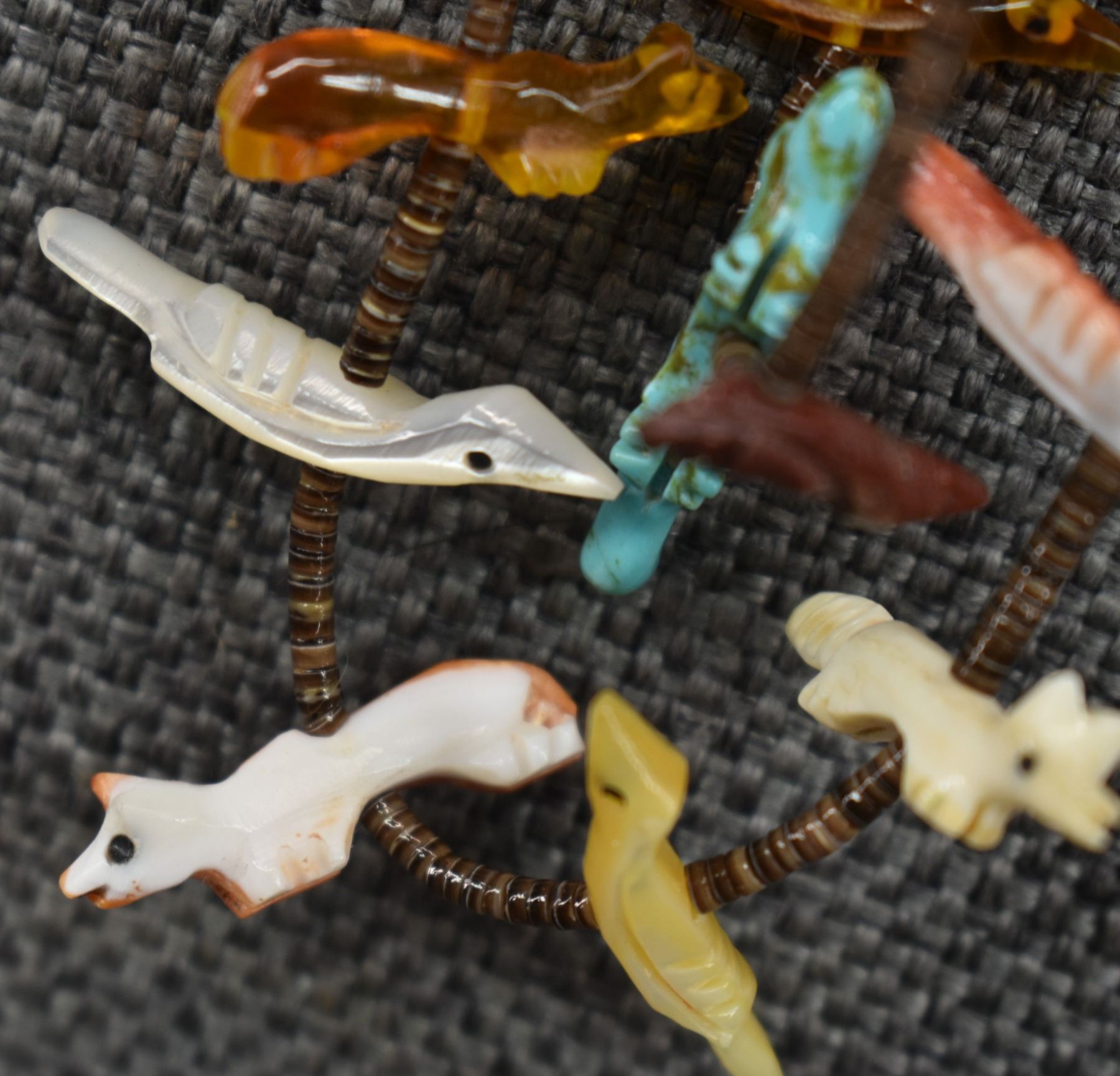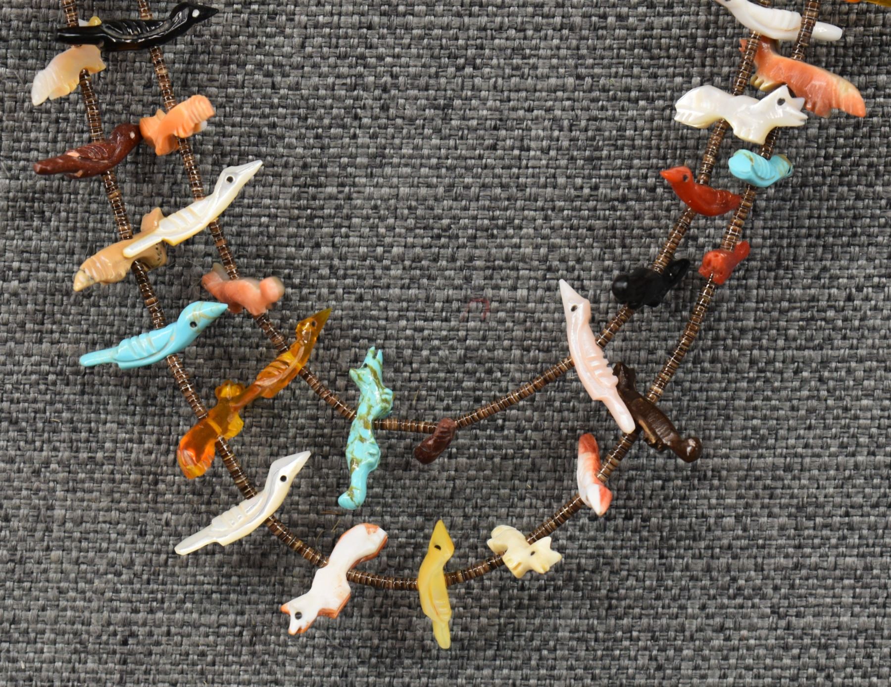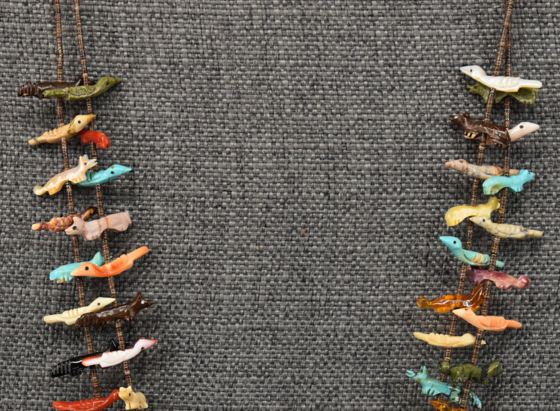 1990's Zuni, two strands of shell heishi with carved turquoise, coral jet, shell and stone animal fetishes signed L/L Kaskalla 27" long