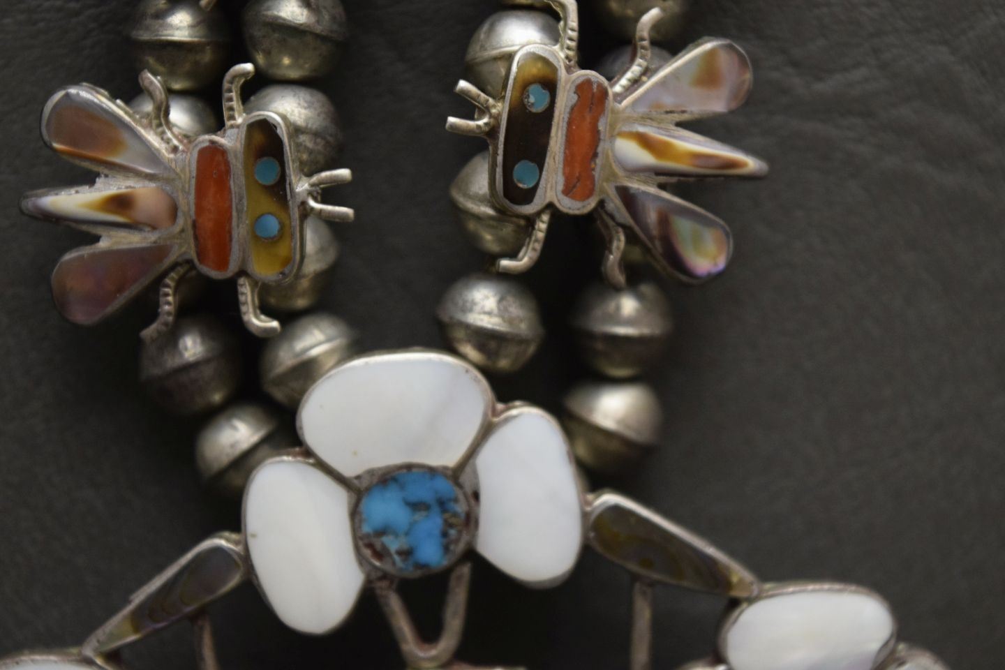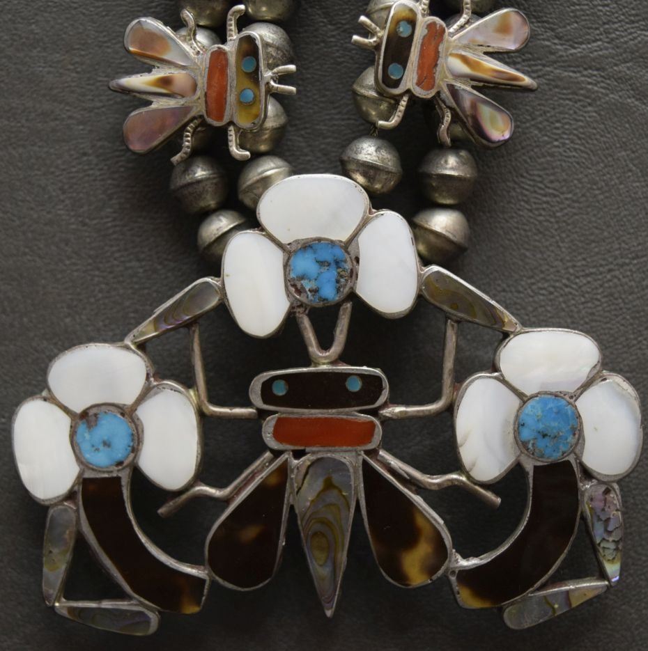 1960's channel inlay turquoise and shell depicting bees necklace 30'' long and pendent 2.25'' x 3.25'' total weight 136 grams
