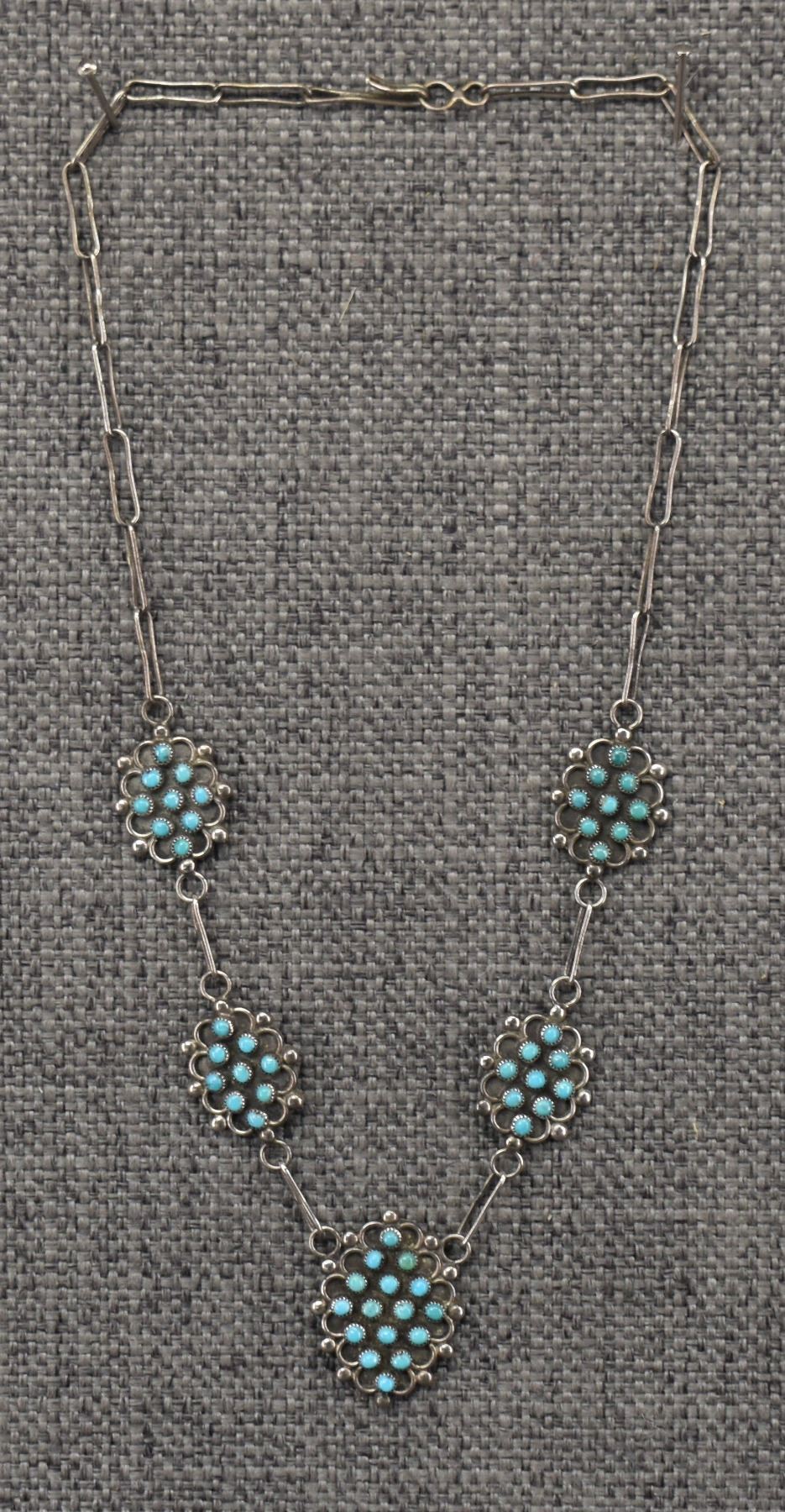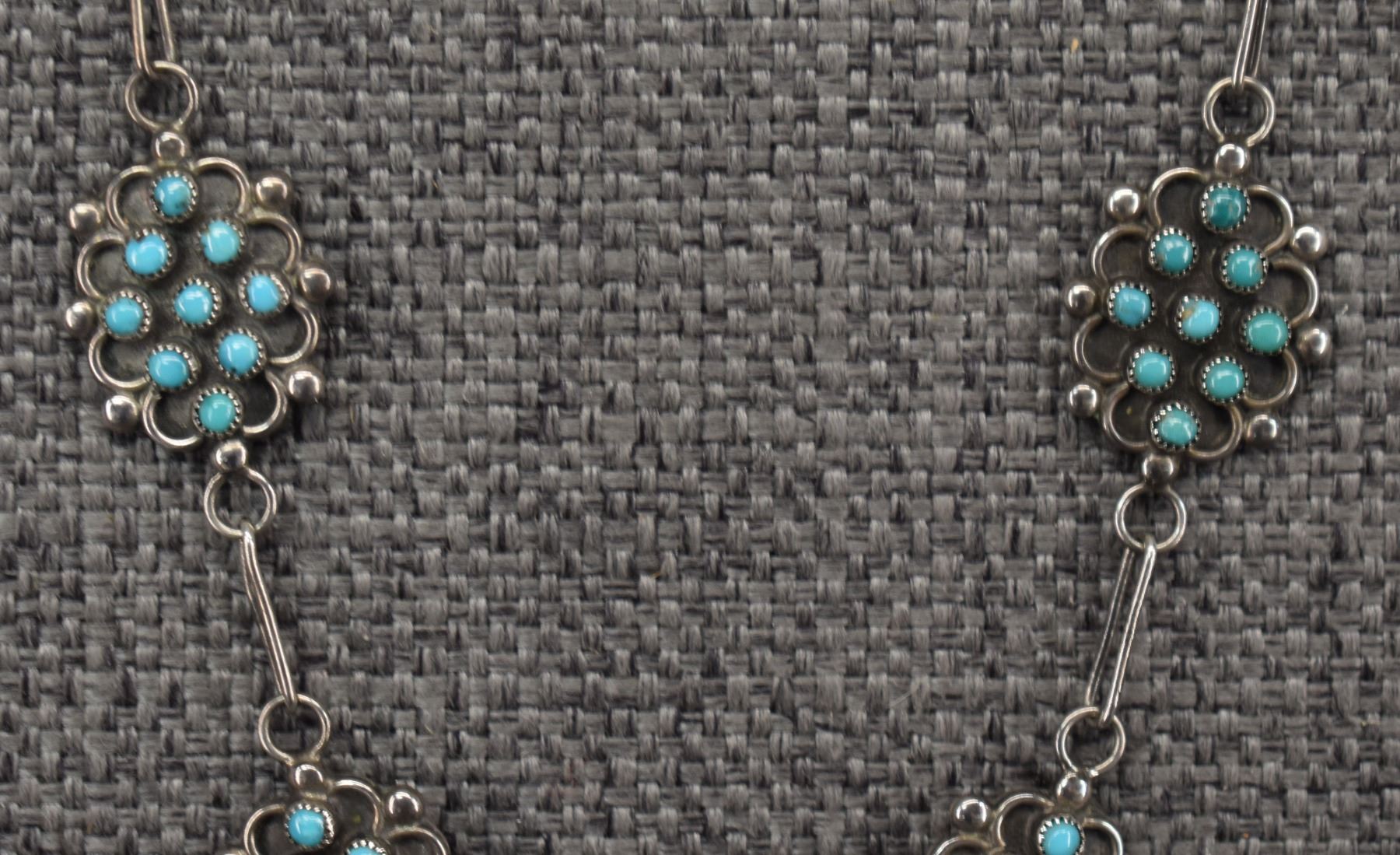 1970's Zuni. Sterling silver and turquoise necklace 17'' long. Total weight 16 grams