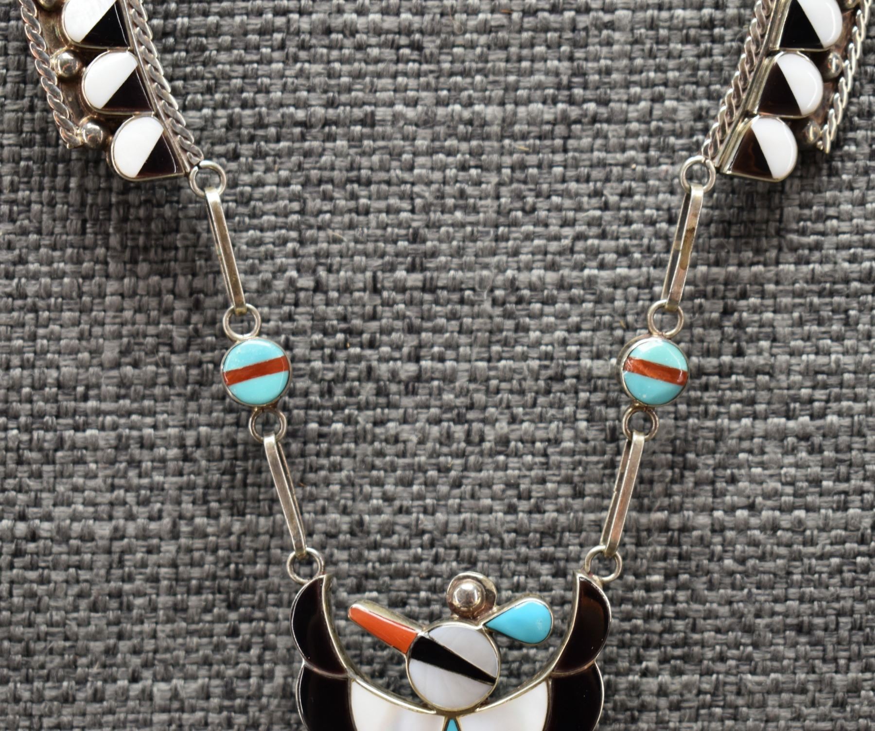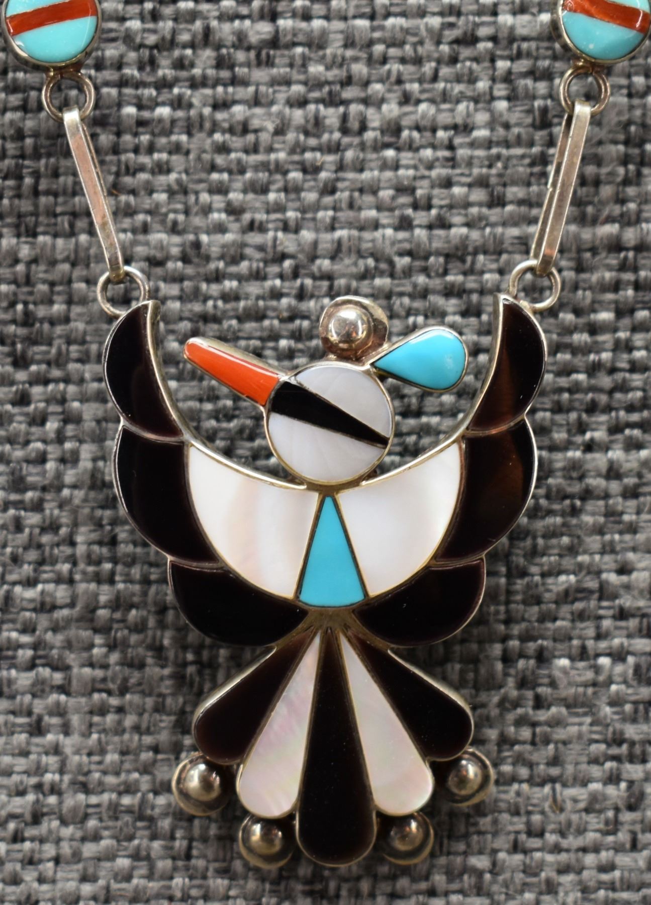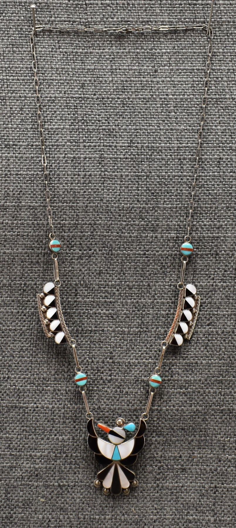 1970's Zuni. Sterling silver turquoise jet and shell depicting thunderbird. Necklace 22'' long, pendent 1.75'' x 1.25'' total weight 23 grams