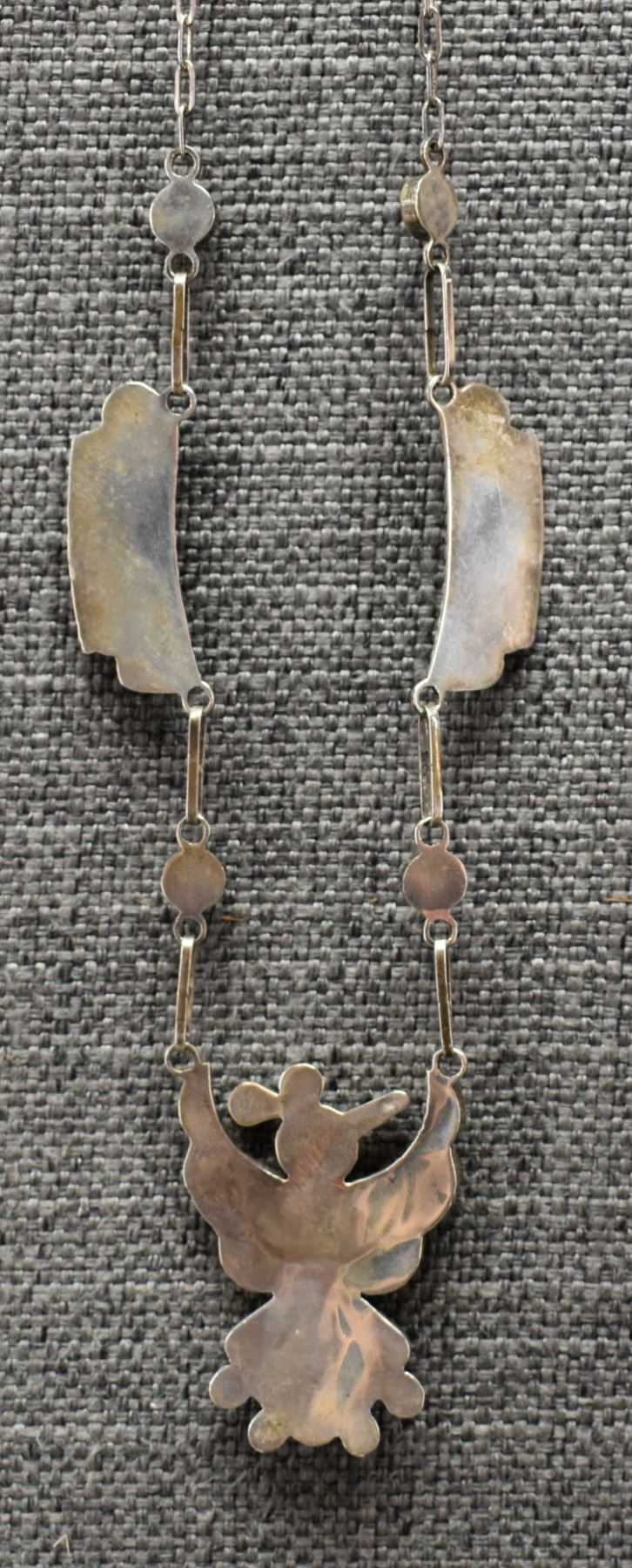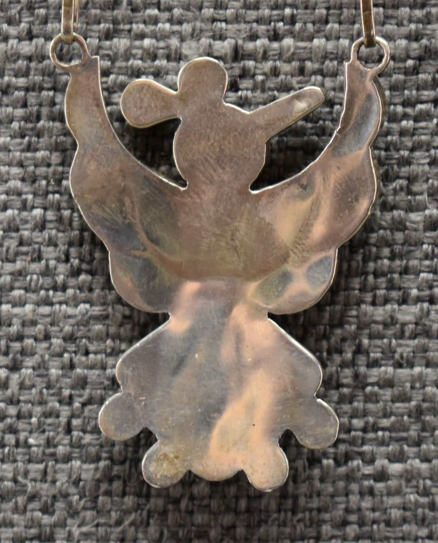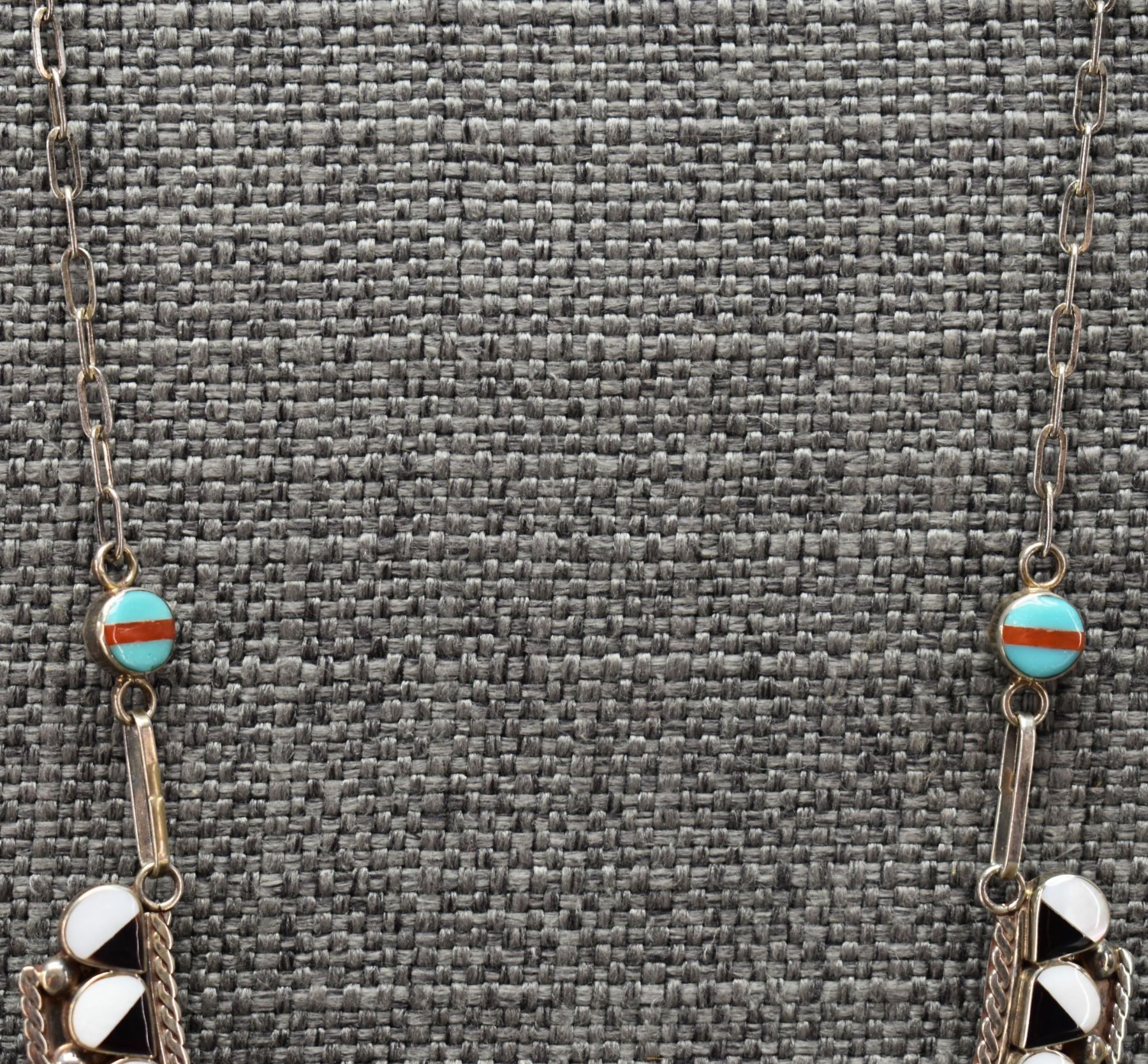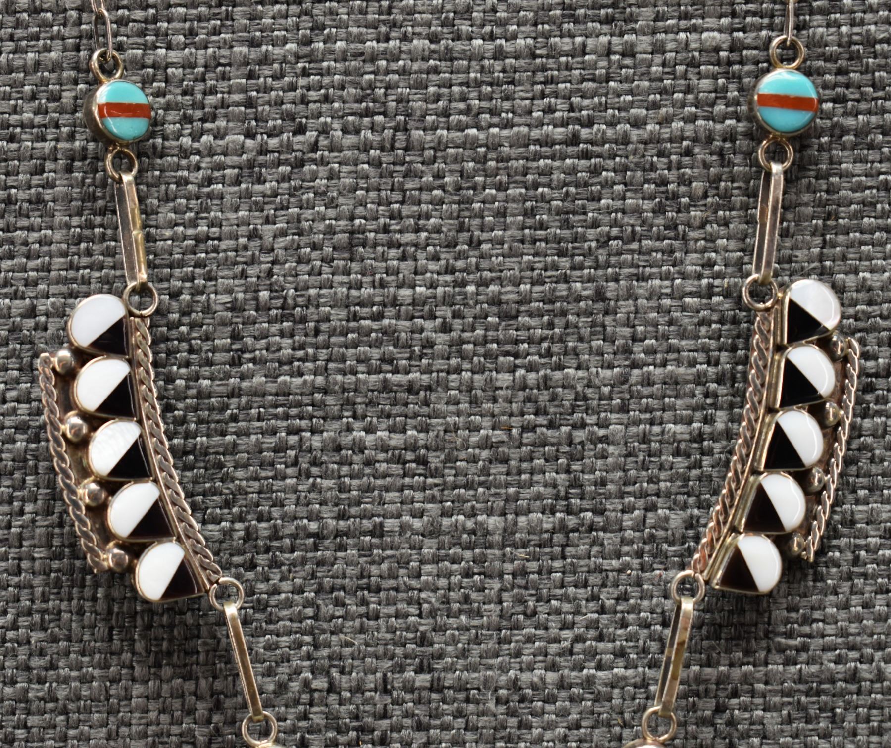 1970's Zuni. Sterling silver turquoise jet and shell depicting thunderbird. Necklace 22'' long, pendent 1.75'' x 1.25'' total weight 23 grams