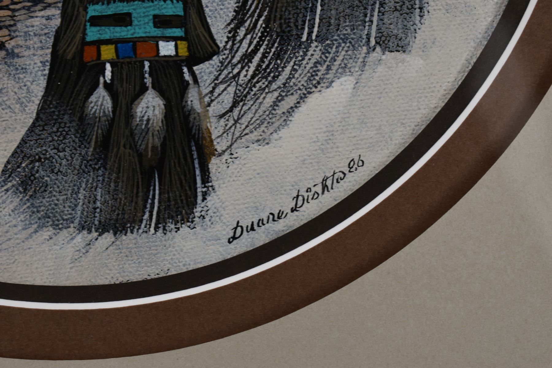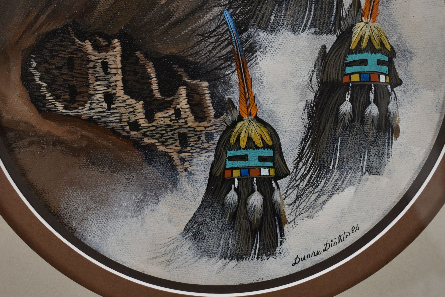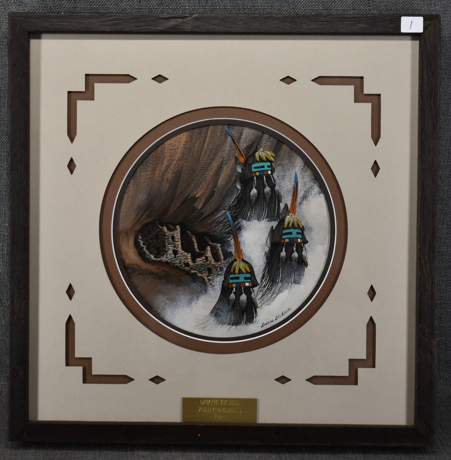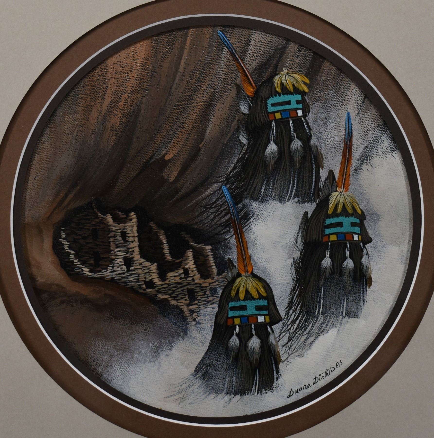 1986 Zuni. Original depicting kachina faces, signed Duane Dishta, 8.5 dia. Fame size 17'' x 17''