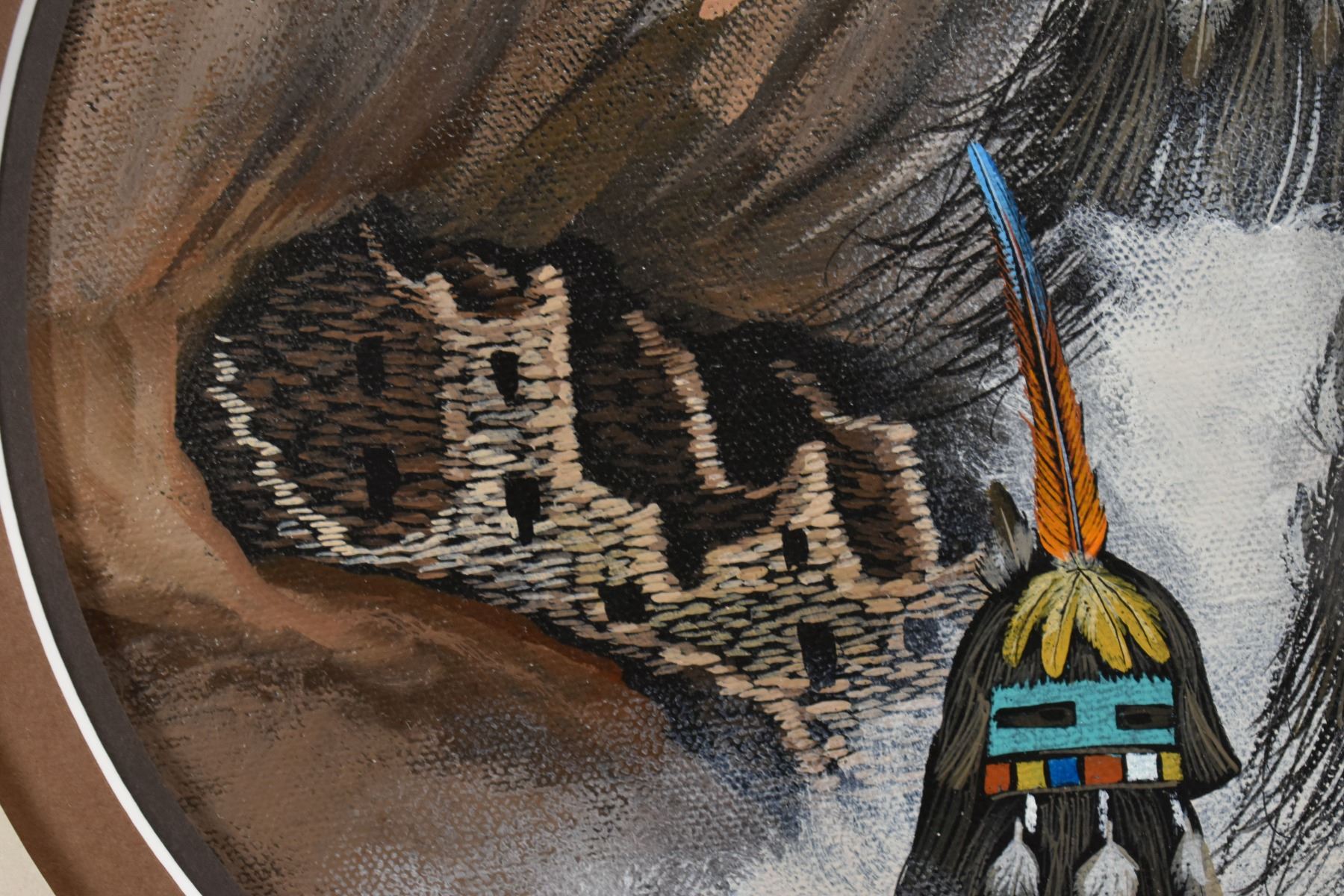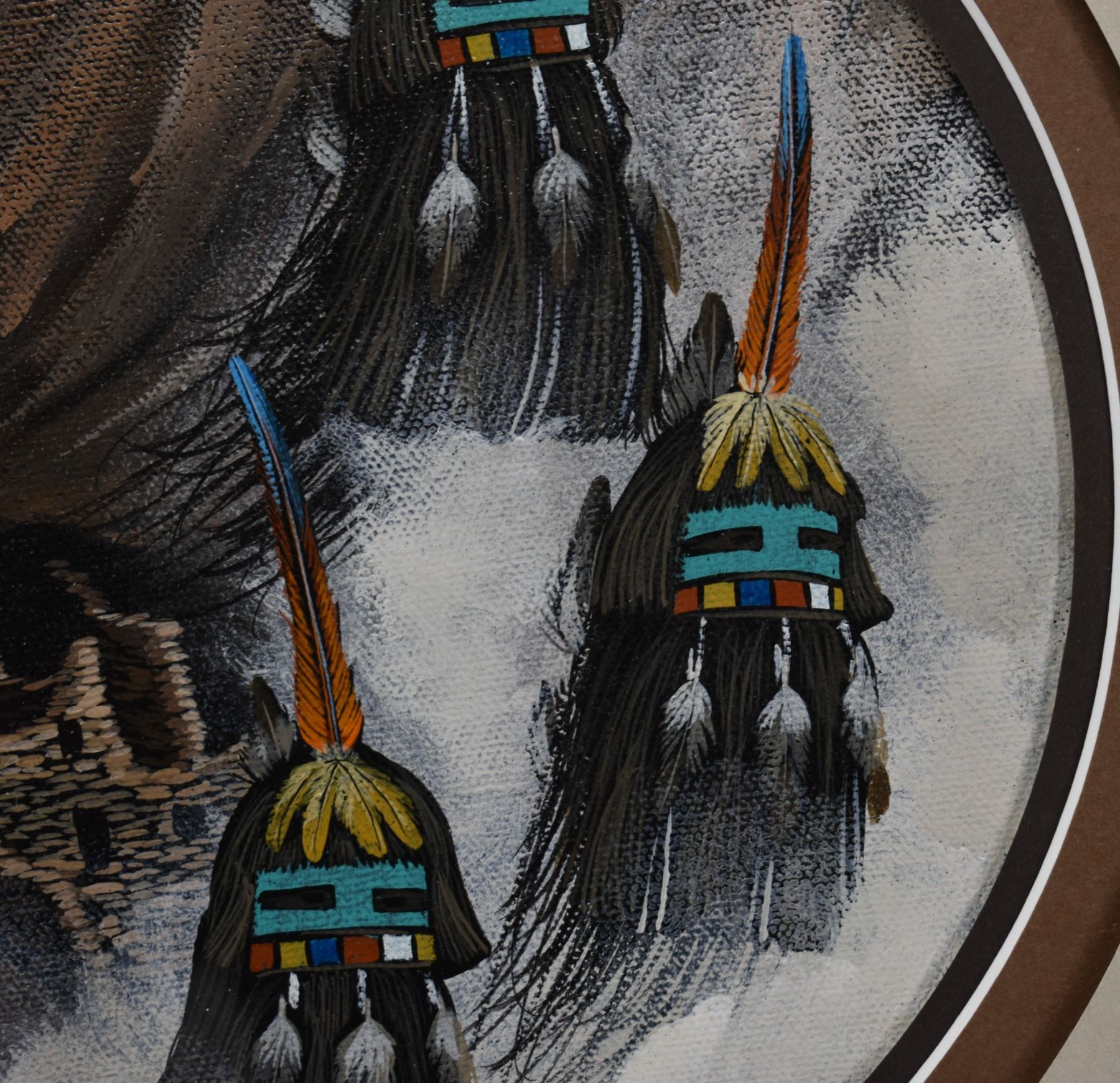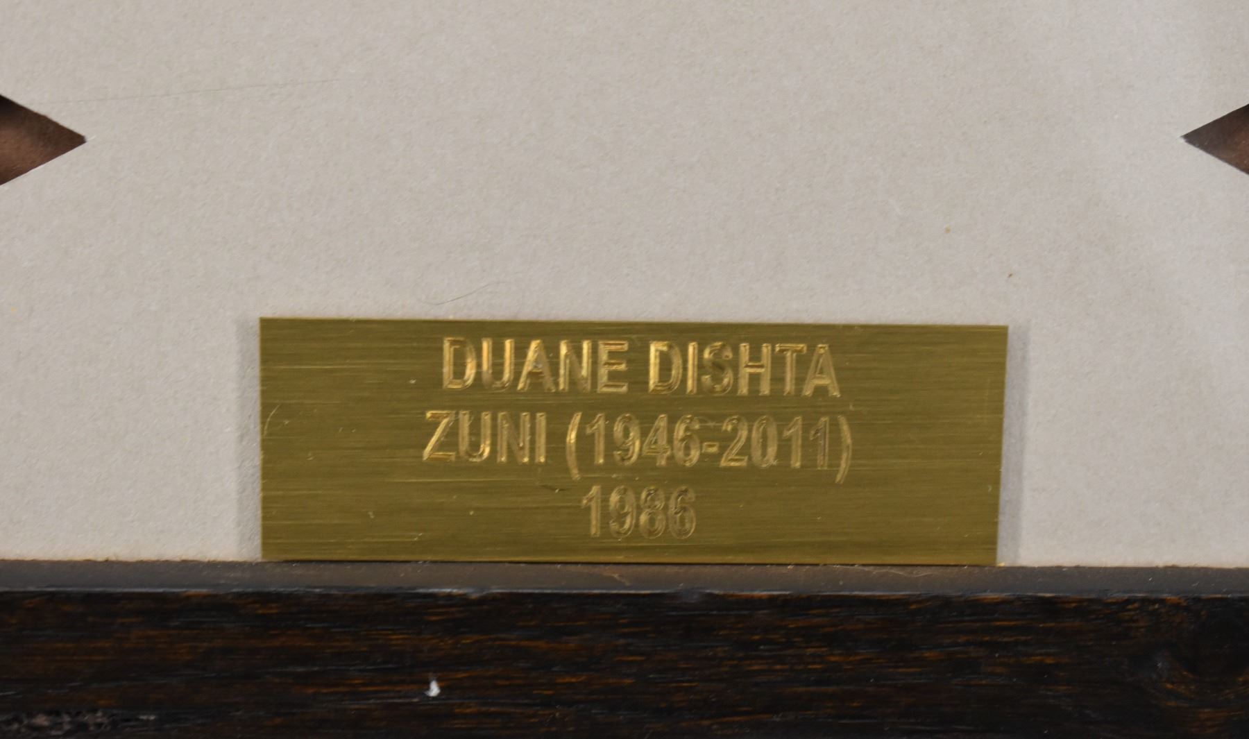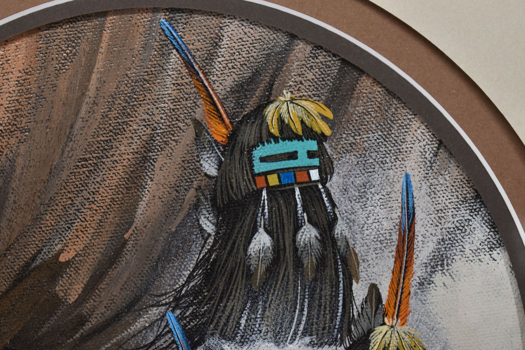 1986 Zuni. Original depicting kachina faces, signed Duane Dishta, 8.5 dia. Fame size 17'' x 17''