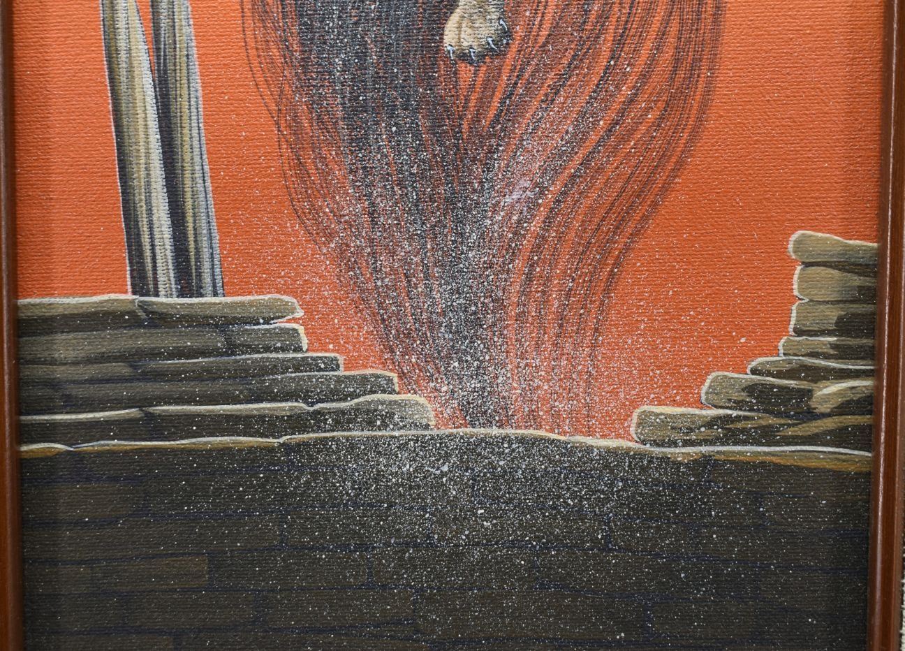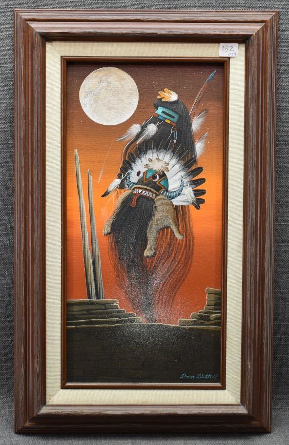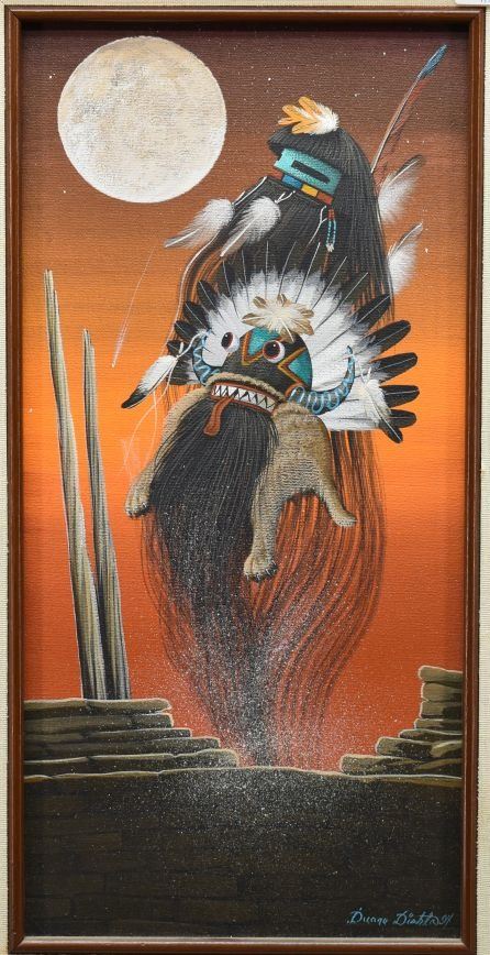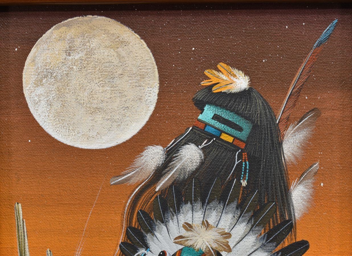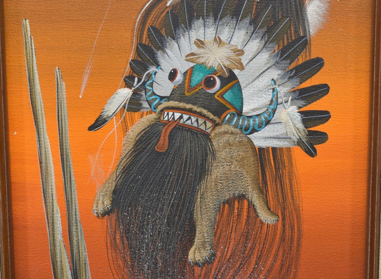 1980's Zuni, hand painted oil on canvas depicting kachina's. signed Duane Dishta 15" x 8"