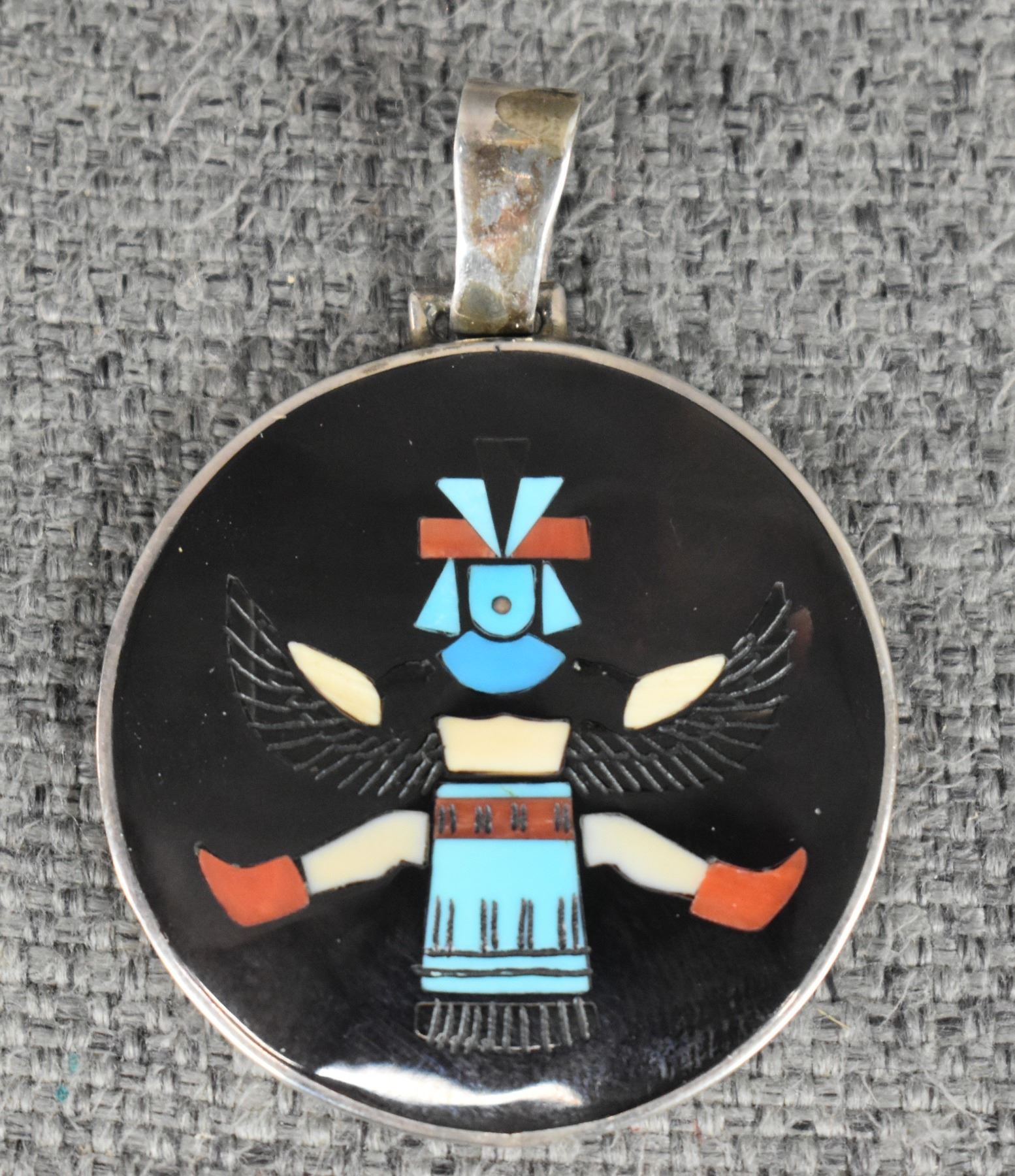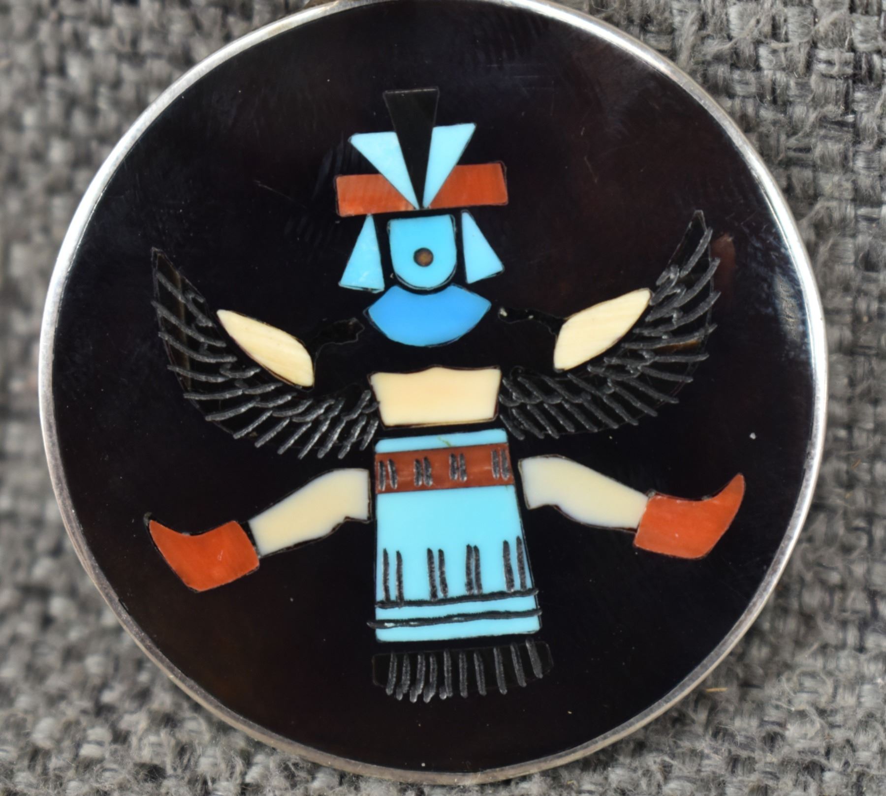 1980's Zuni sterling silver, coral, turquoise, and jet Pendant depicting Achiya ladaba. Stamped H.M. Coonsis. 2" x 1.5" 12 grams.