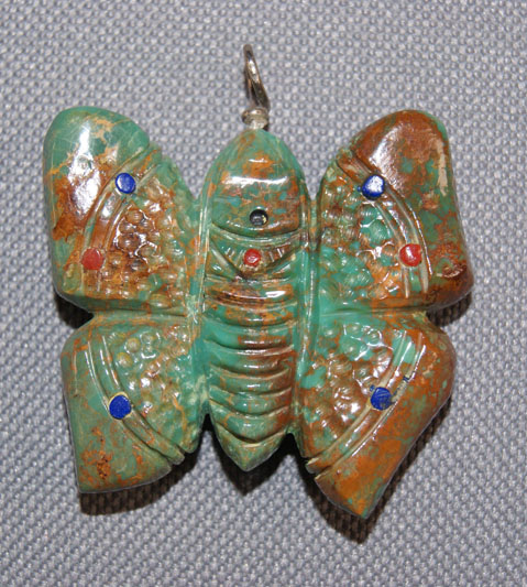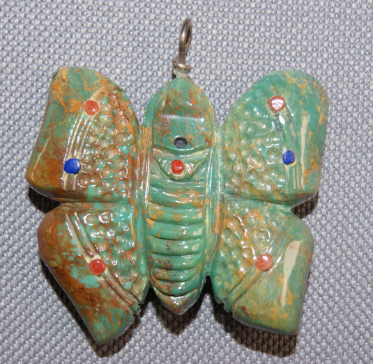 1980s carved turquoise butterfly with coral and lapis inlaid dots by Julia Quandency, 1.5" x 1.5"