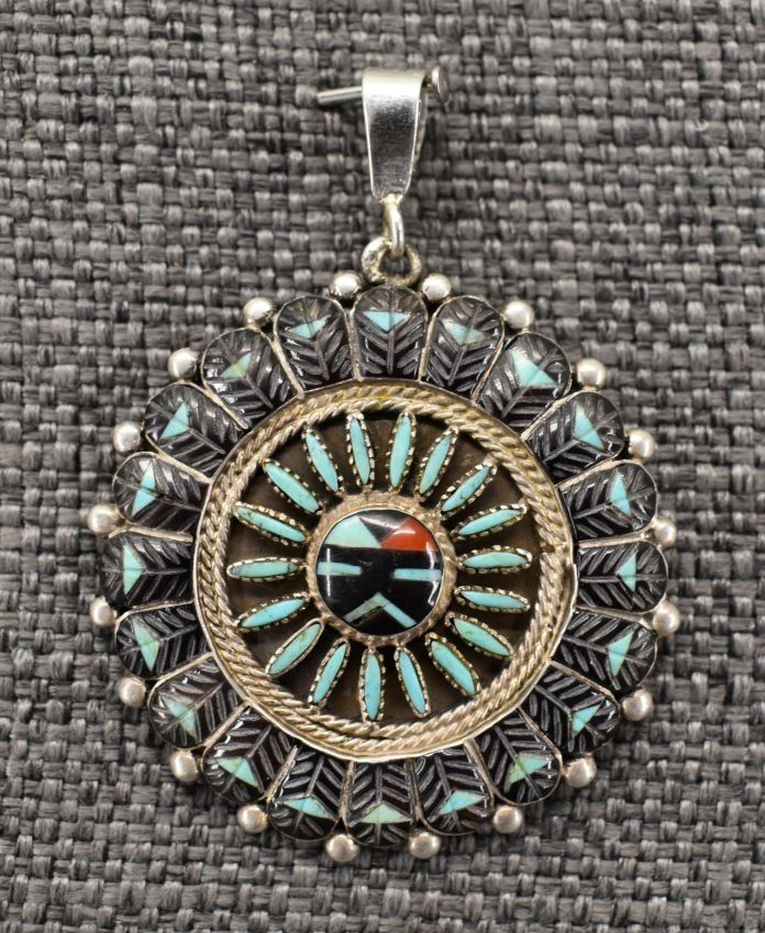 1970-80's Zuni, Sterling silver with carved inlaid turquoise and Jett with petit point turquoise and sun face design 1.75" diameter total weight 15 grams