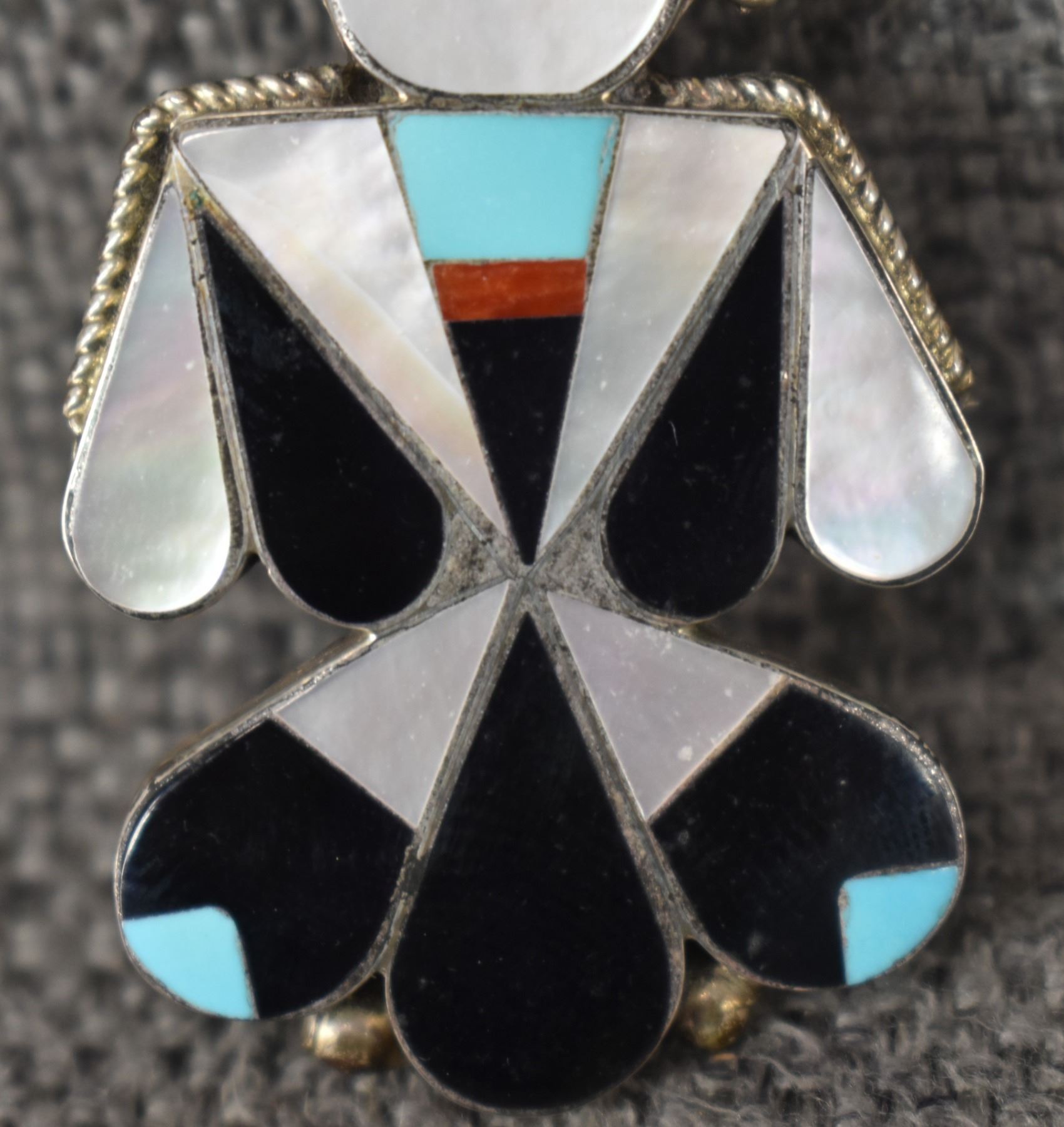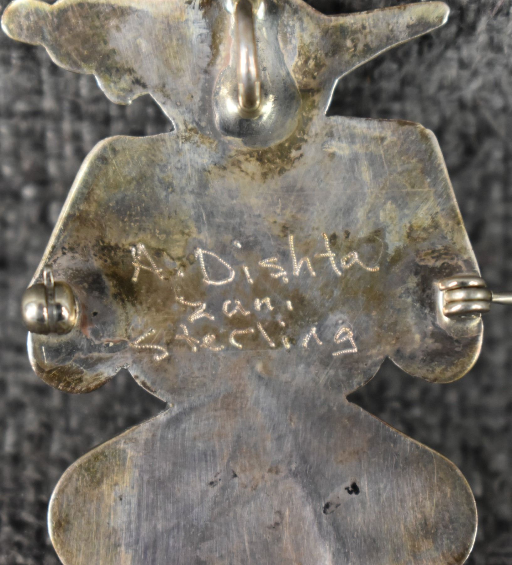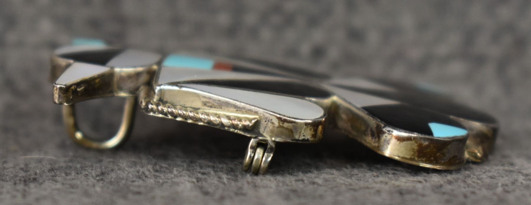 2000's Zuni, sterling silver channel inlaid turquoise shell and jet signed A Dishta, 1.75" x 1.25" total weight 9 grams
