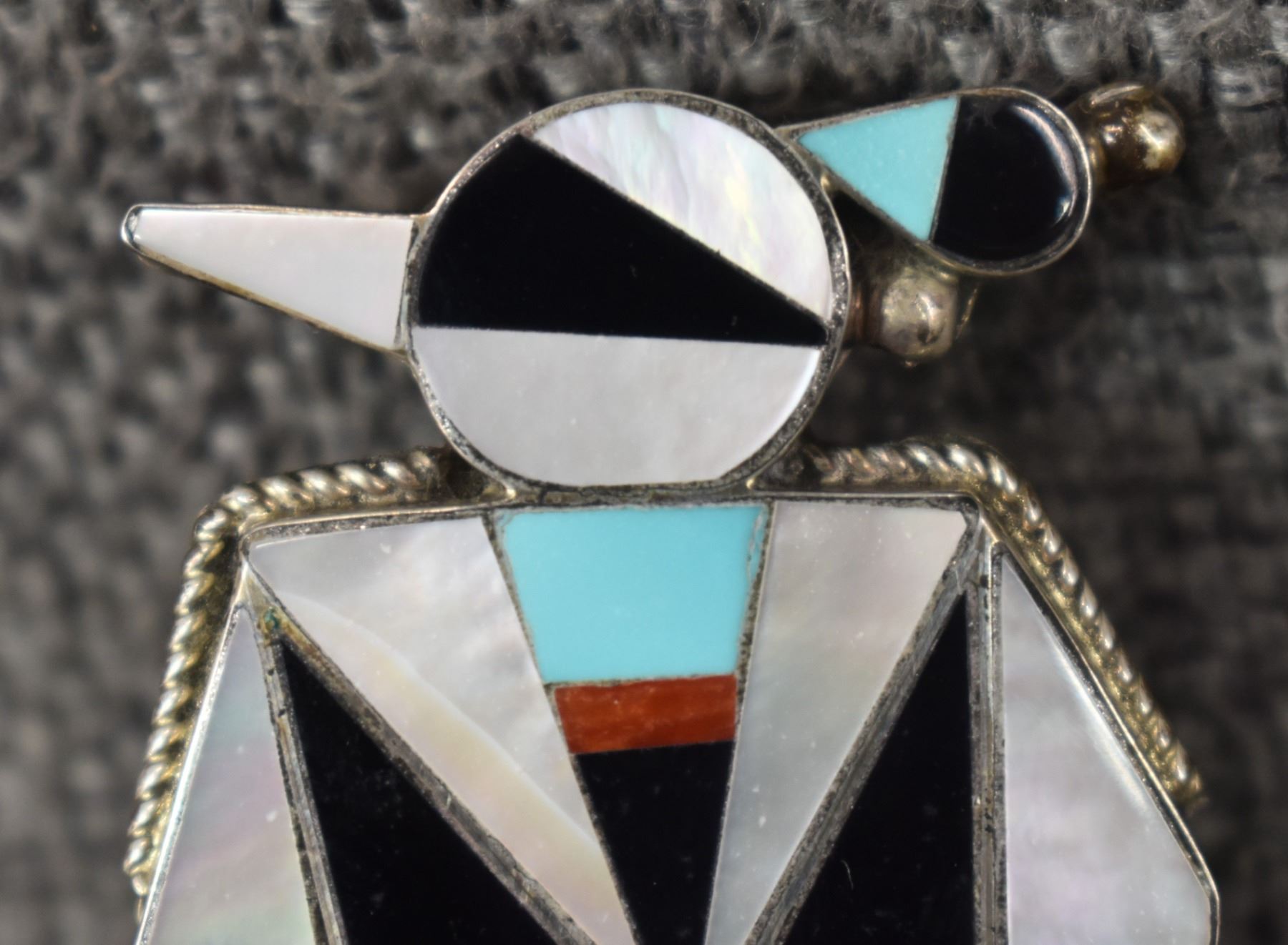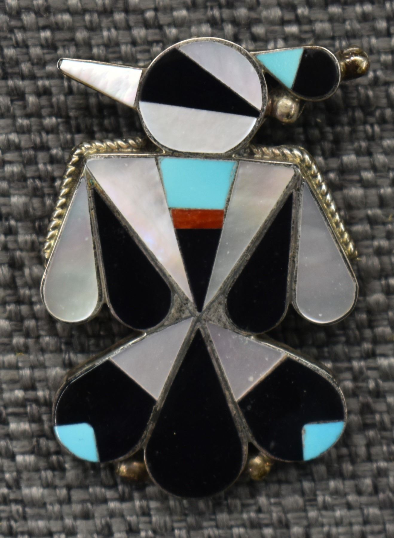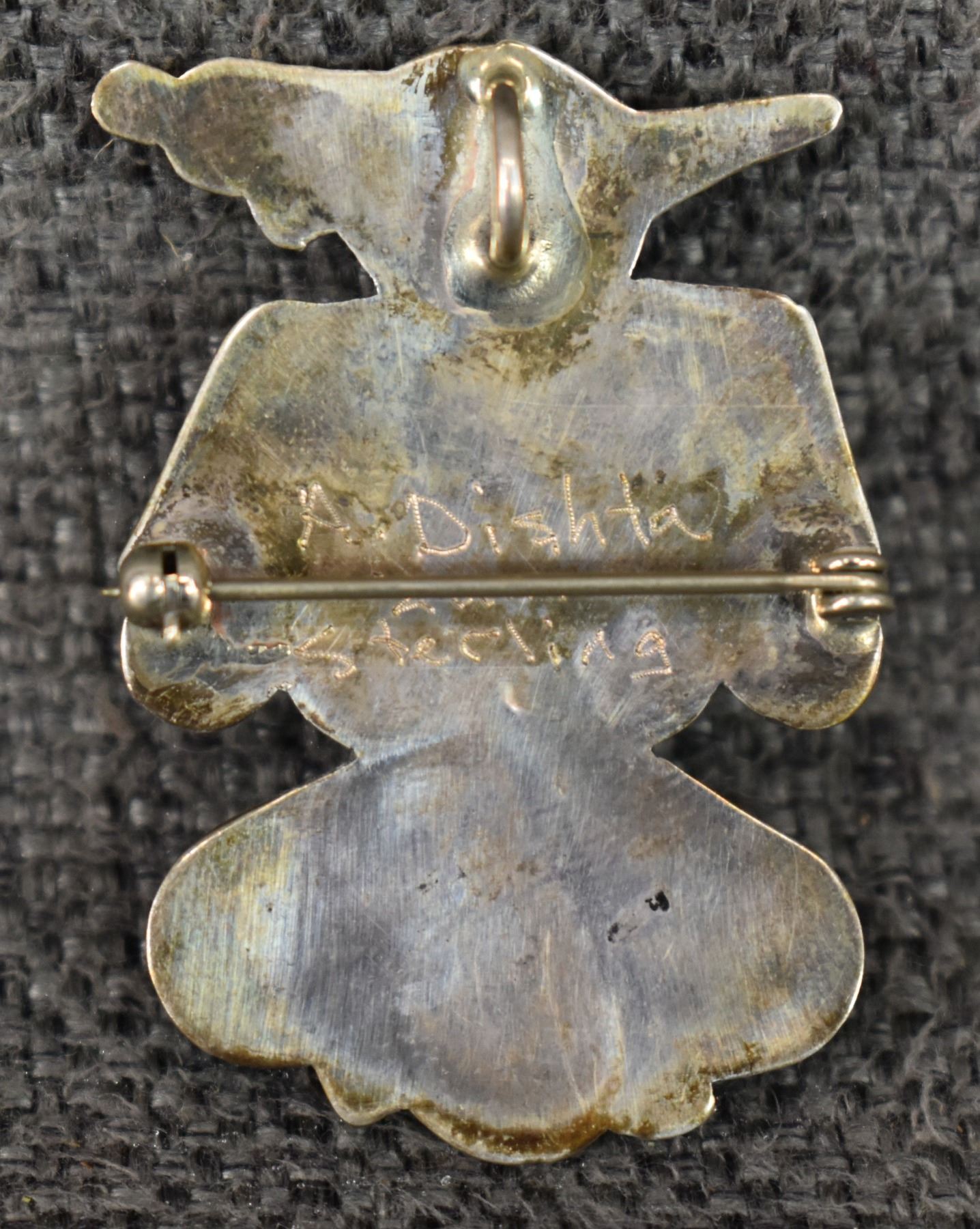 2000's Zuni, sterling silver channel inlaid turquoise shell and jet signed A Dishta, 1.75" x 1.25" total weight 9 grams
