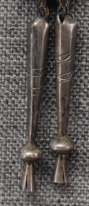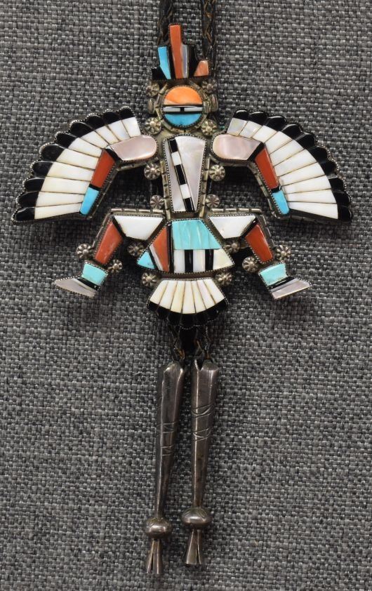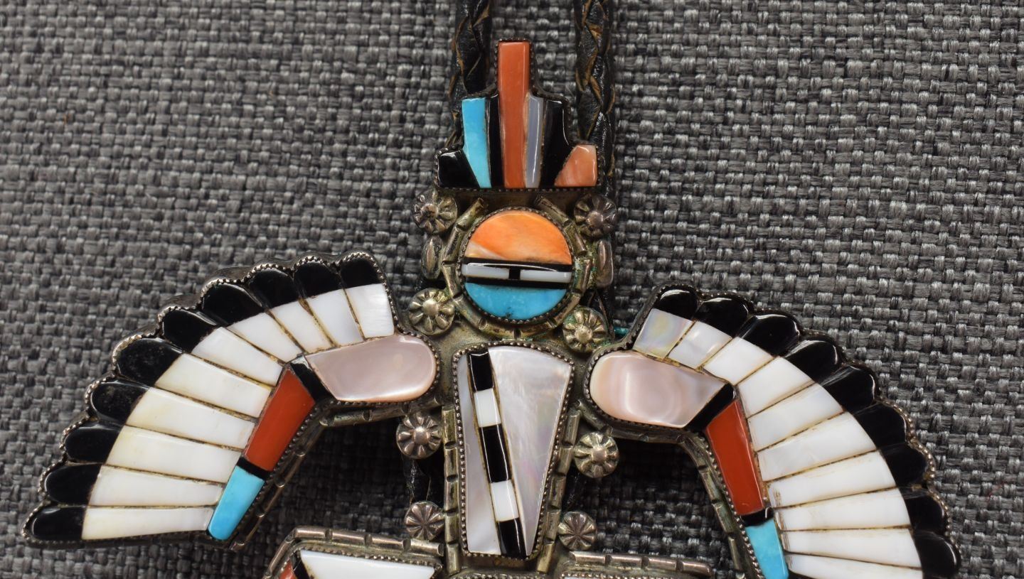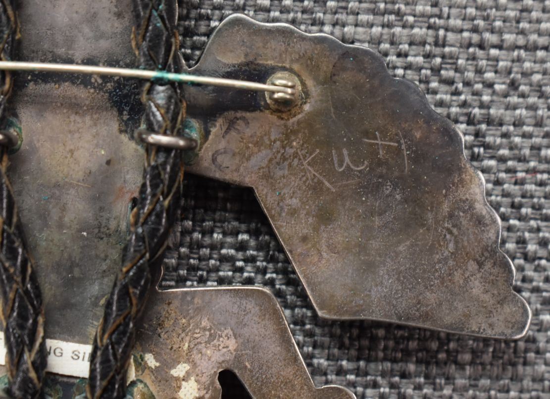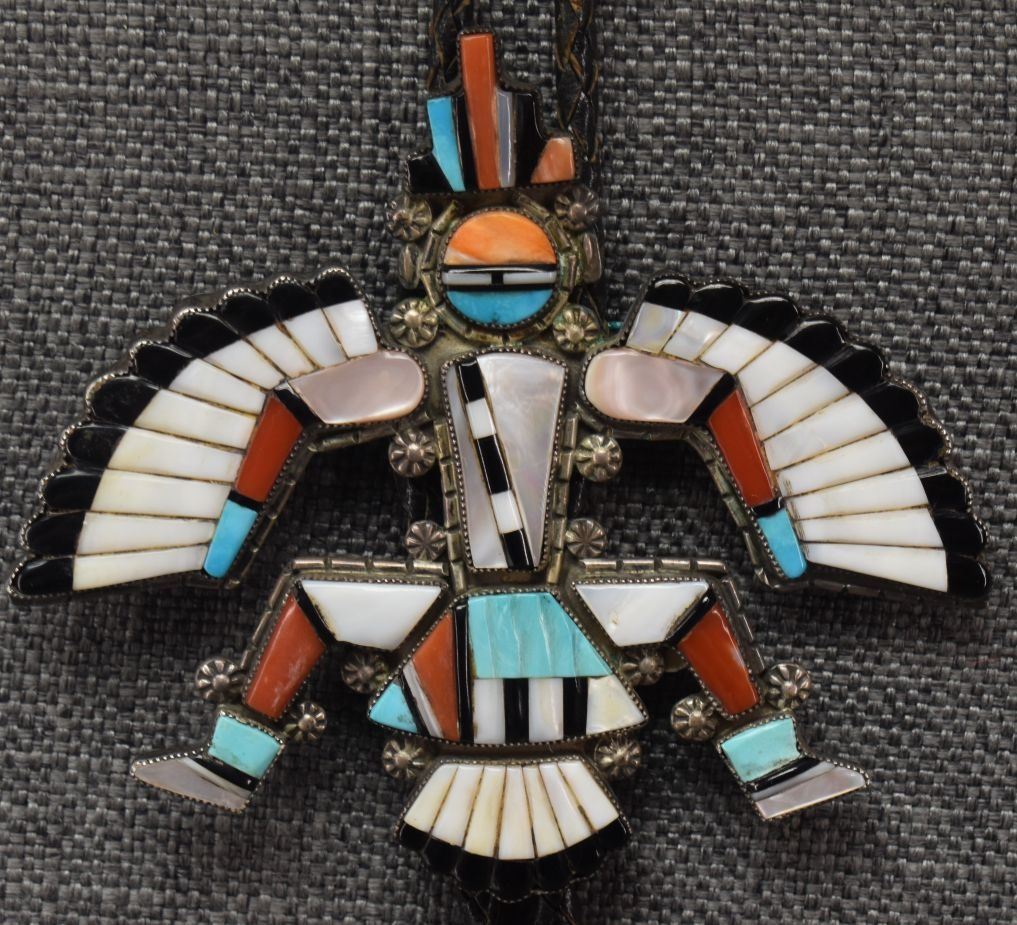 1960's Zuni, sterling silver stamped design with inlaid turquoise coral and shell 4" x 4.5" with sterling silver tips with stamped design 2.75" long total weight 106 grams