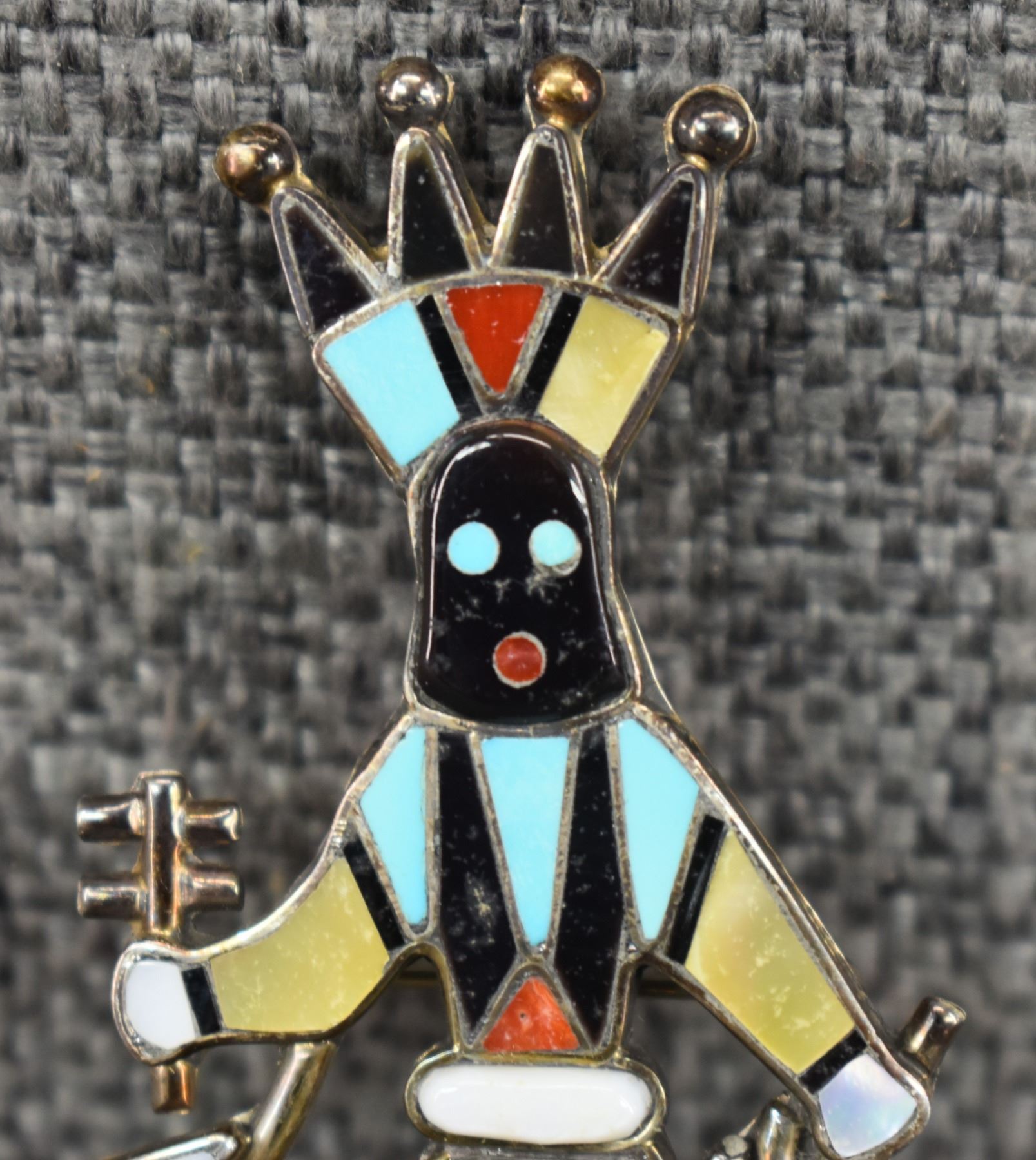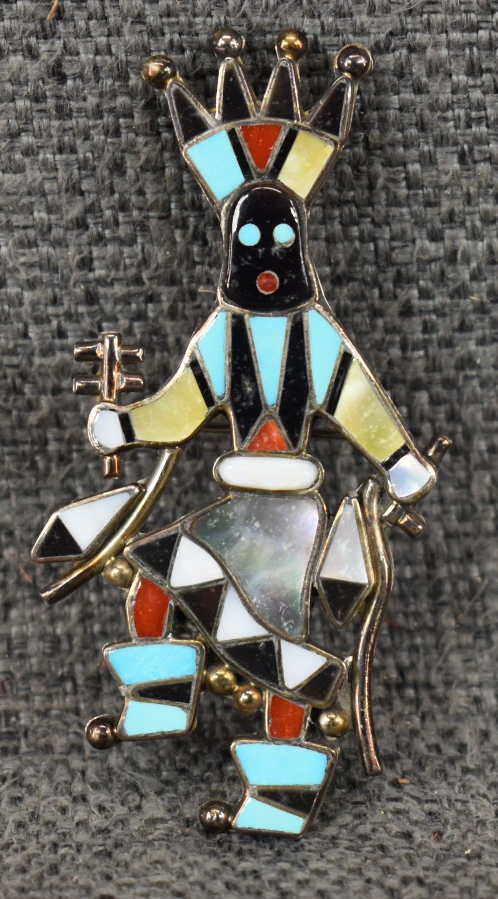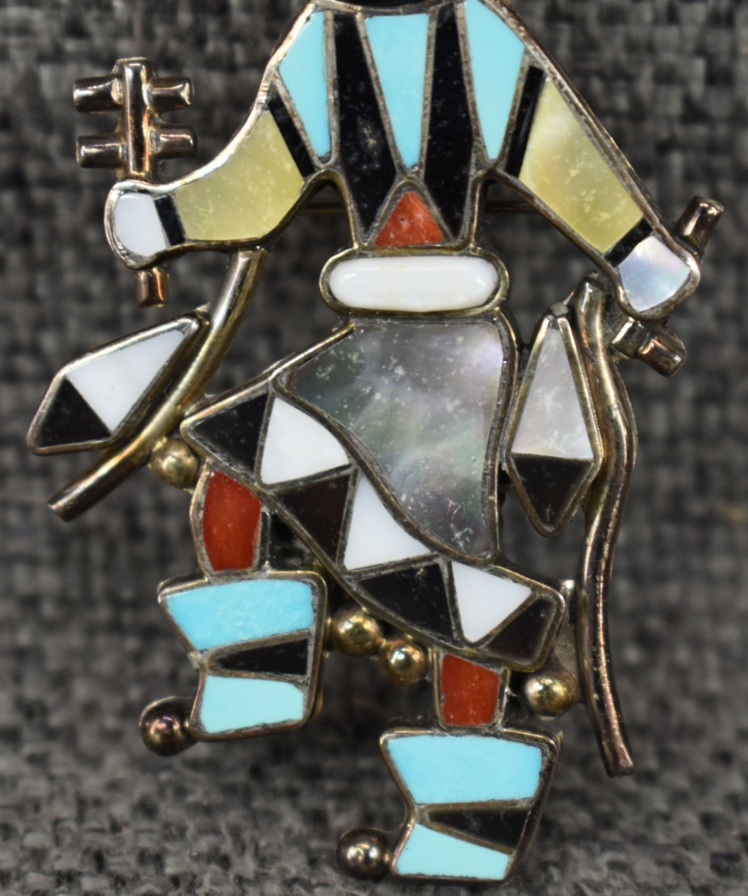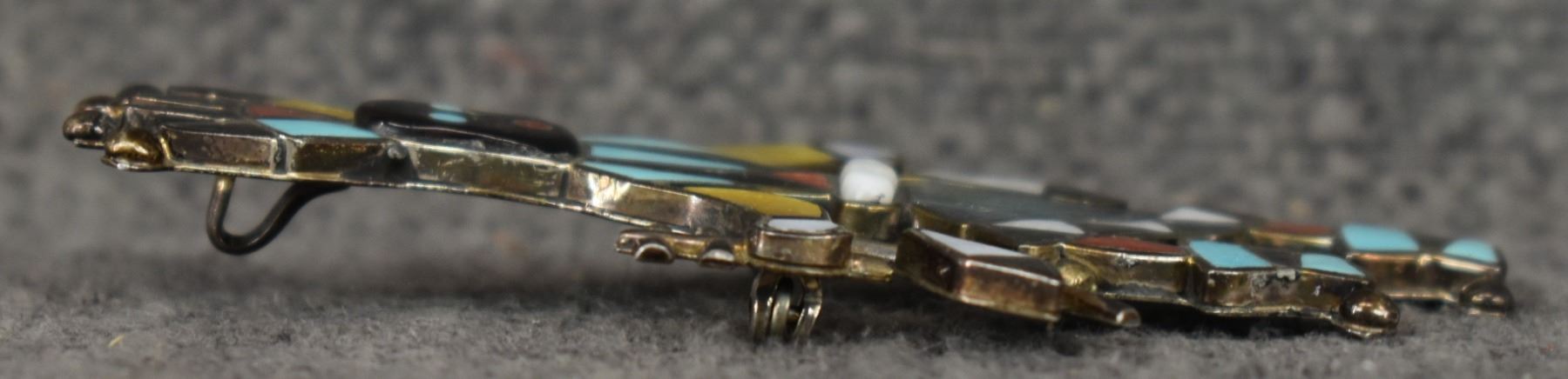 1980's Zuni, sterling silver channel inlaid turquoise shell jet and coral ghan dancer design by Lynnette Laiwakete, 2.75" x 1.25" total weight 11 grams