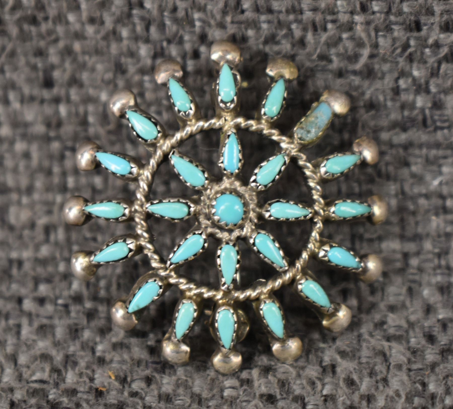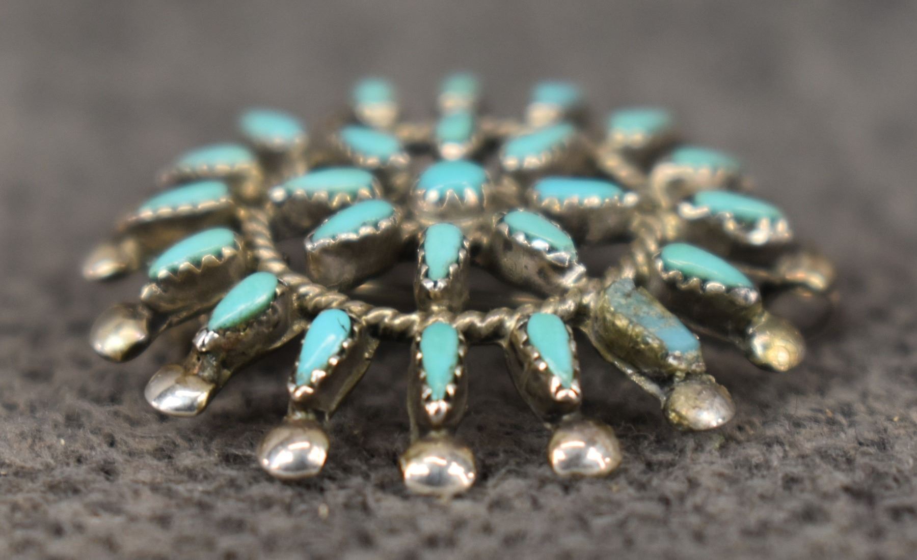 1980's Zuni Stearling silver and turquoise needle point pendant. 1" diameter 4 grams.