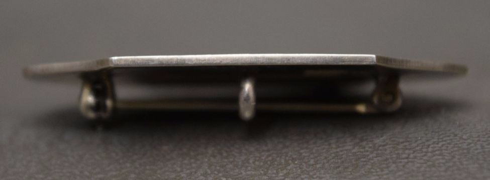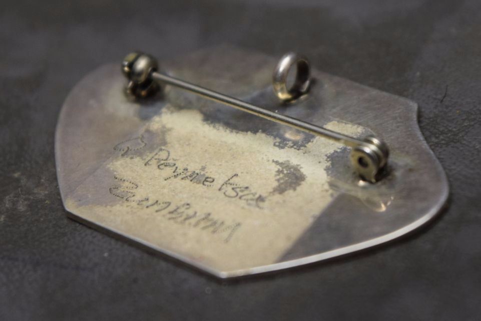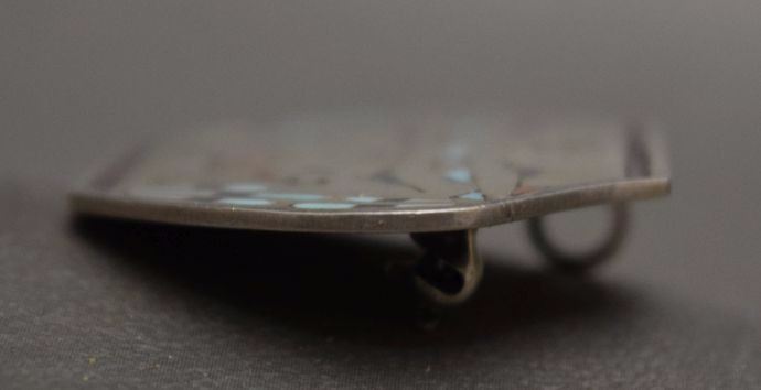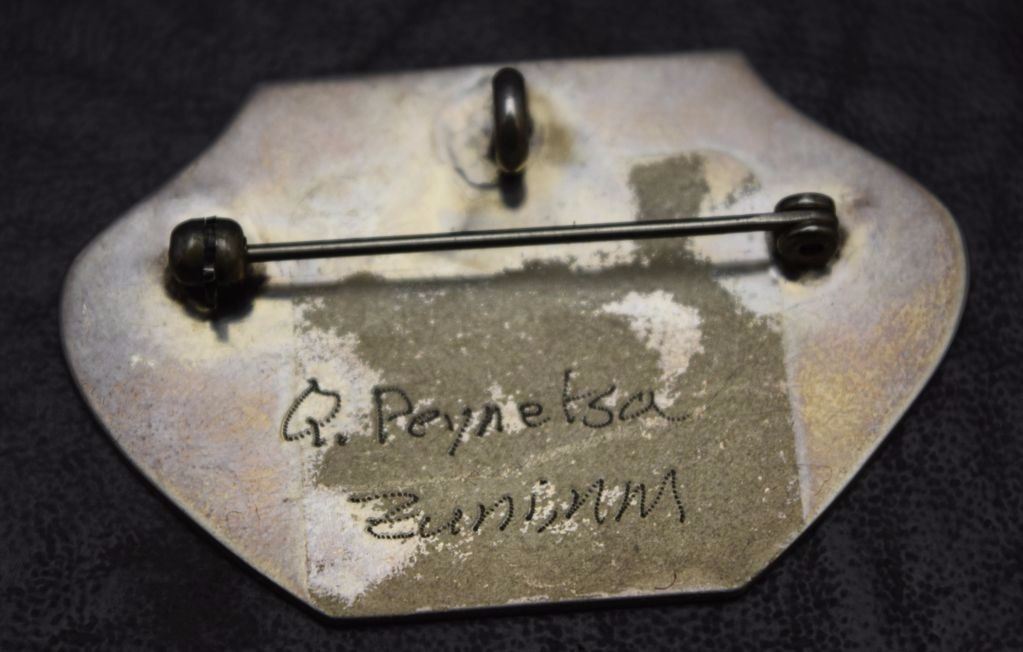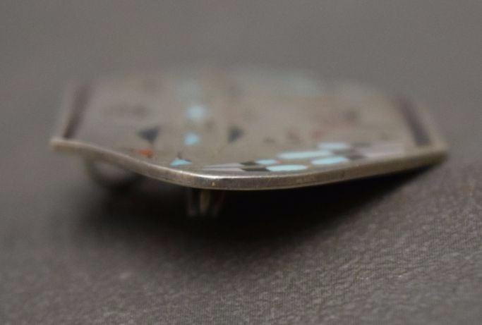 1970's sterling silver with inlaid turquoise shell and coral signed Q. Peynetsa. 1.5'' x 1.75'' total weight 10 grams