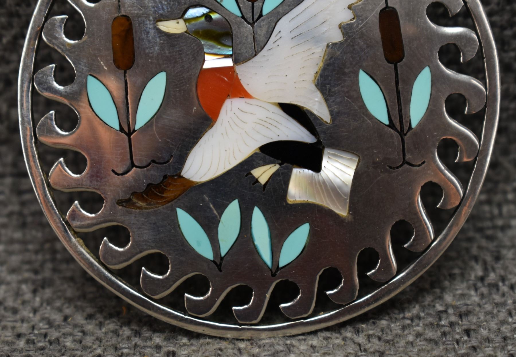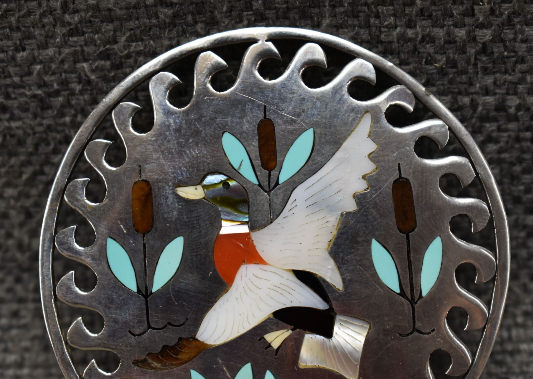 1970's Zuni. Sterling silver turquoise shell and coral pin/pendent. 2.25'' dia. Total weight 30 grams