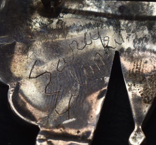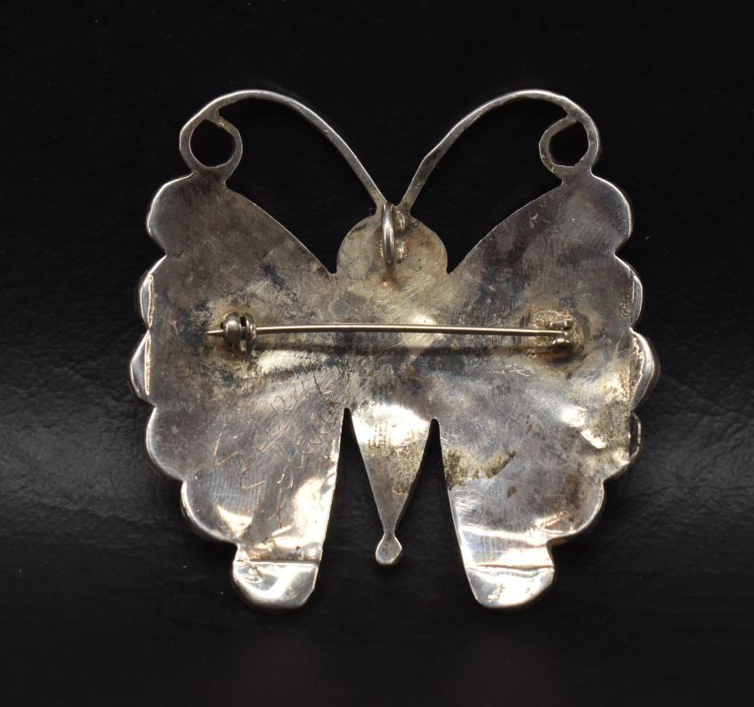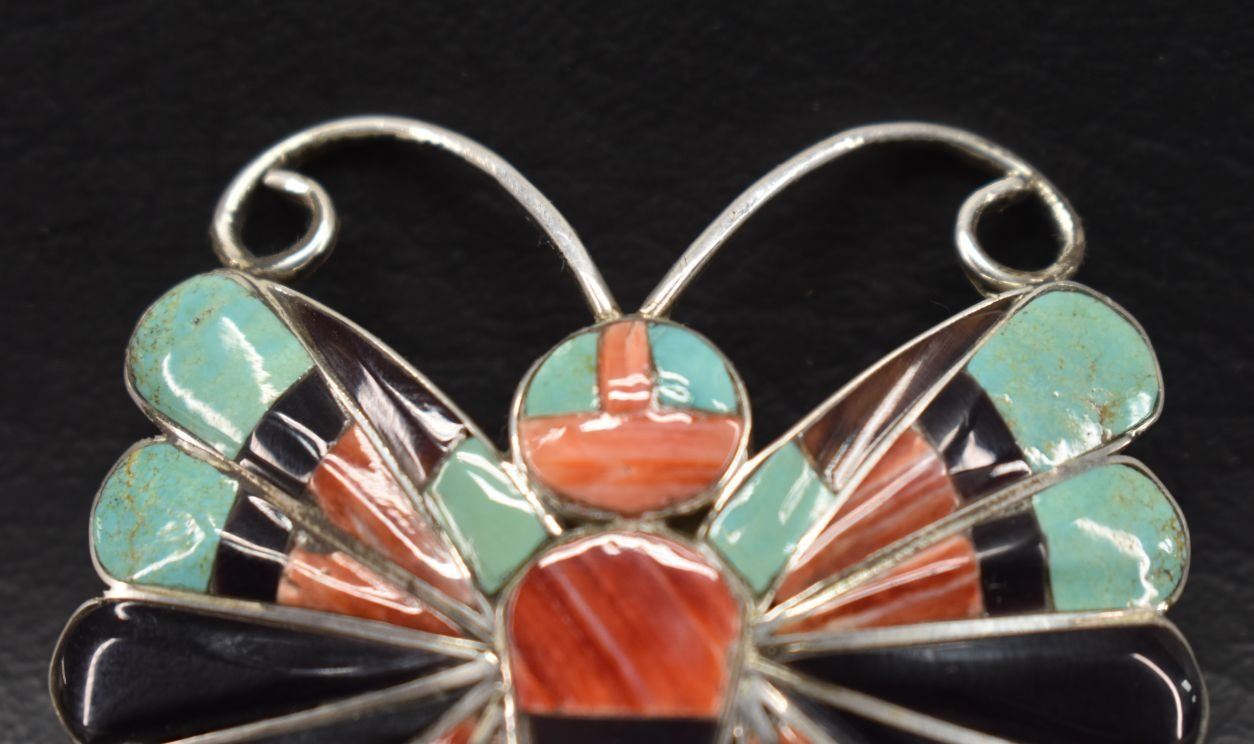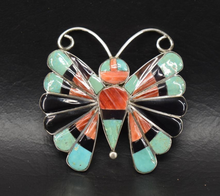 1980's Zuni. Sterling silver turquiose jet and shell depicting butterfly, signed Sara Edaakie.2.25'' x 2.25''. Total weight 18 grams