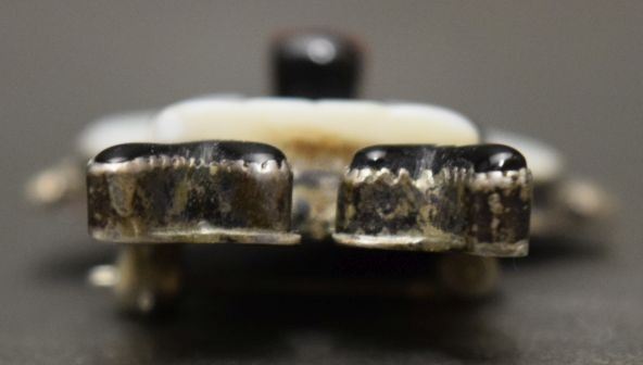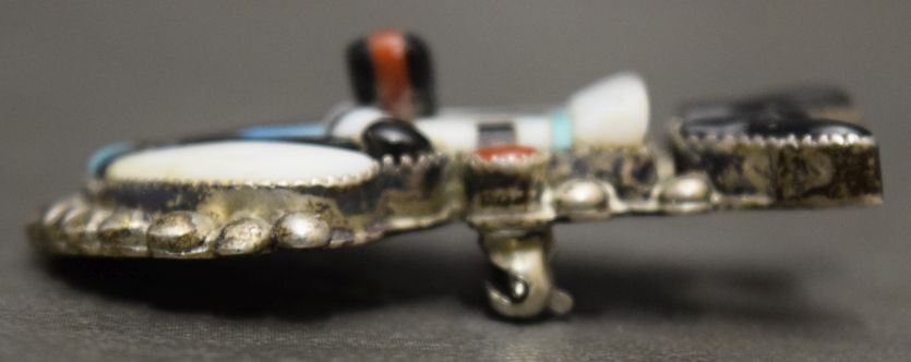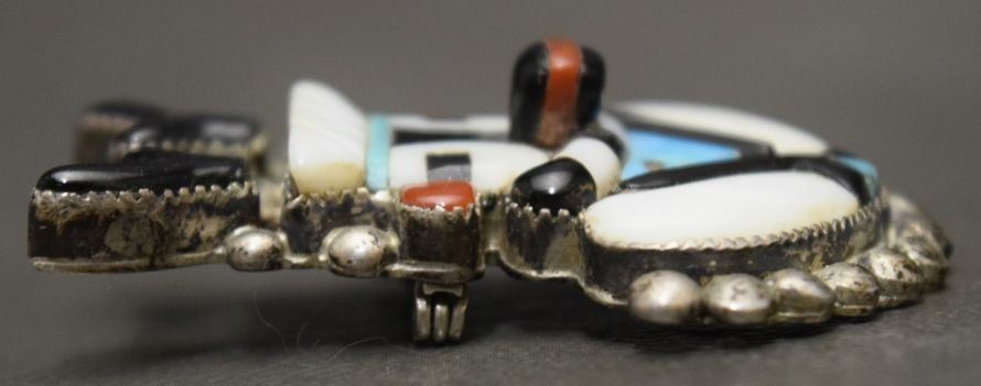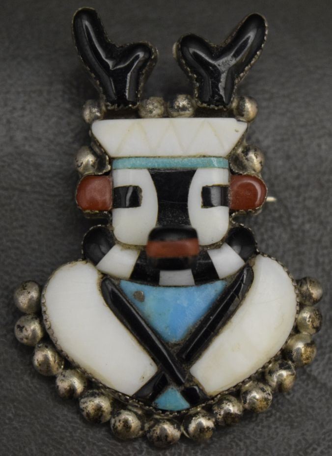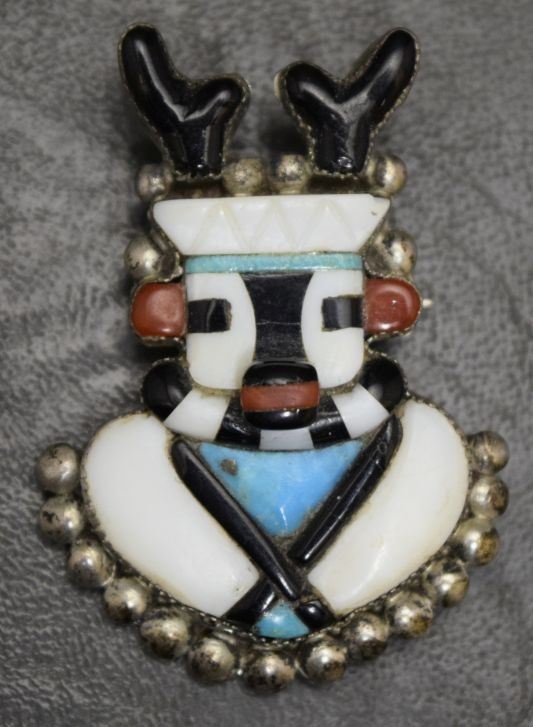 1960's turquoise and shell set in sterling silver depicting antelope dancer. 1.5'' x 1.25'' total weight 11 grams